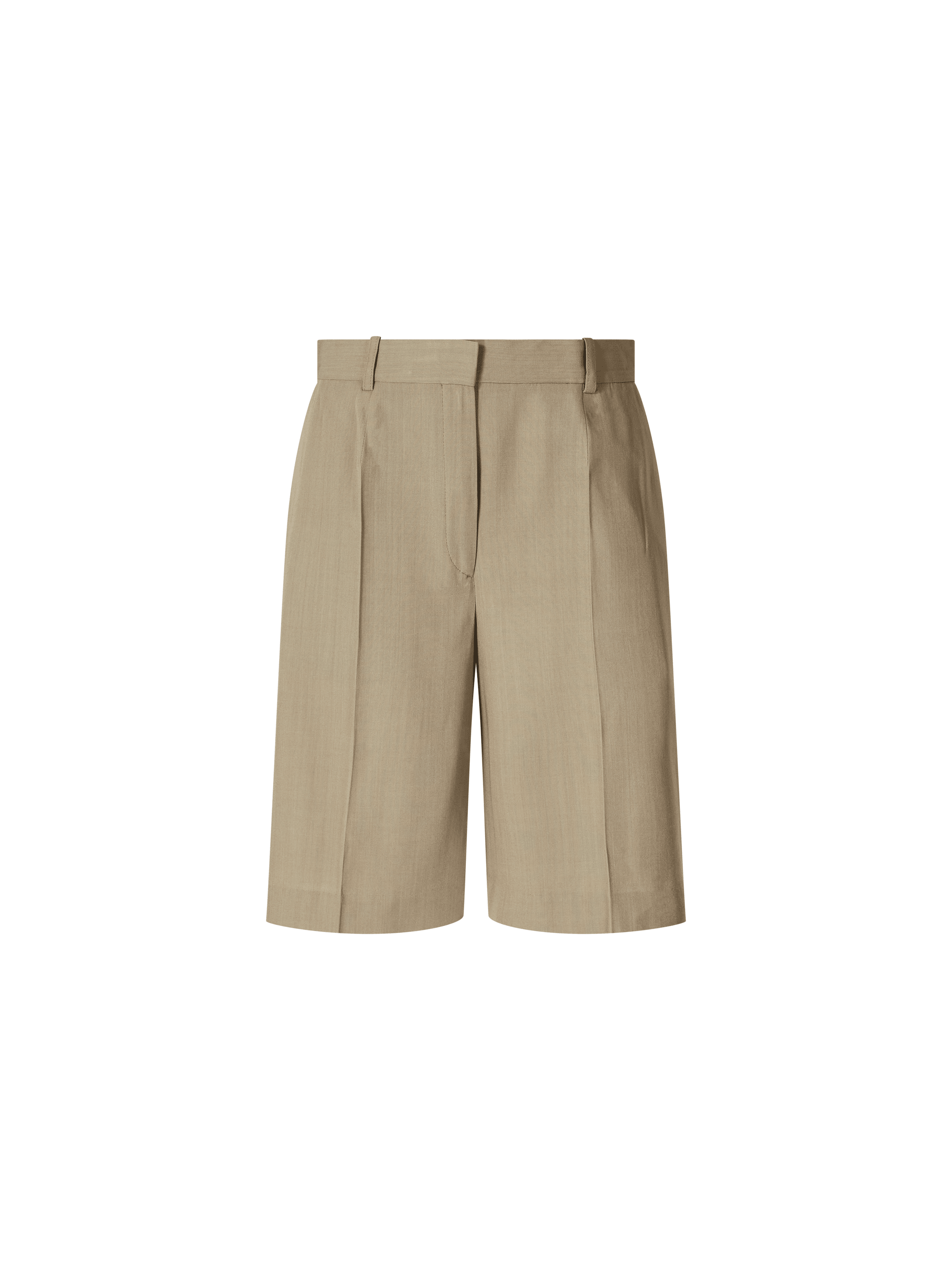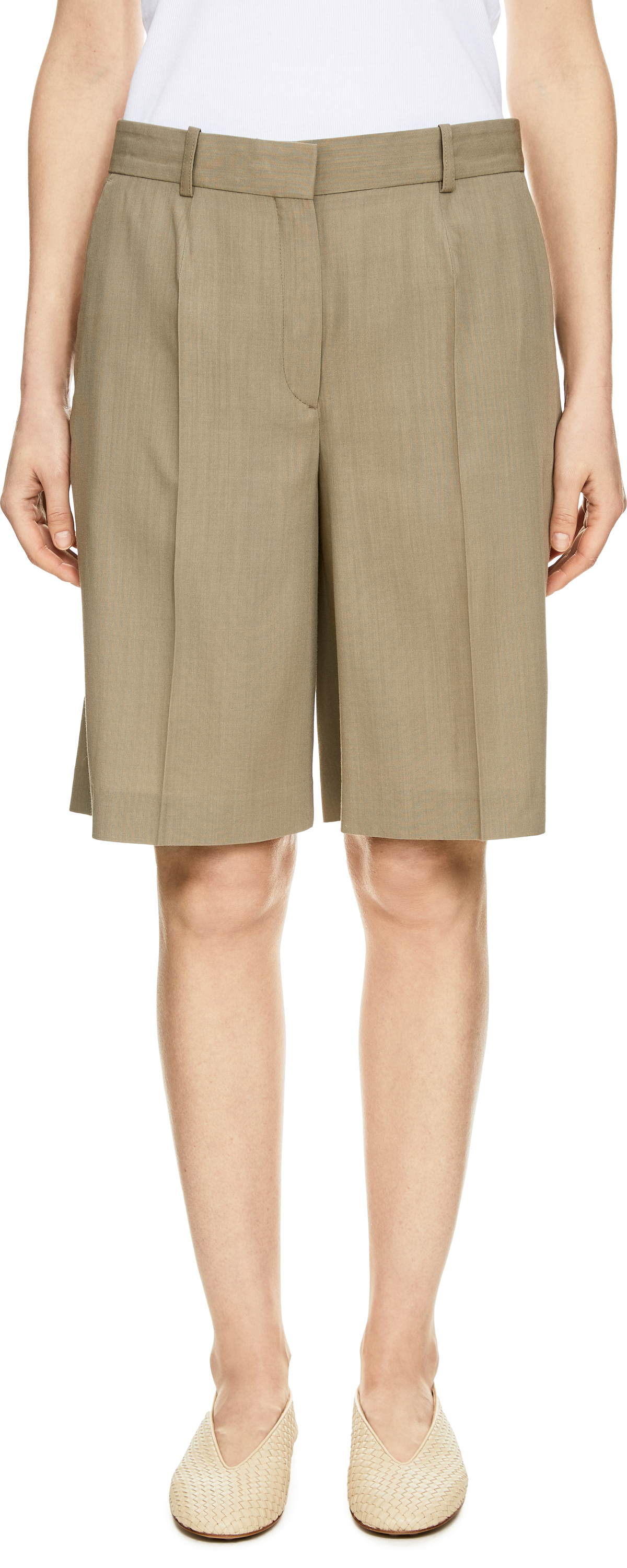 Diese Shorts in Taupe von TOTEME wurden aus einer hochwertigen Wollmischung gefertigt und besticht durch die fließende Silhouette. Das lockere Bein verleiht dem Modell einen modernen Touch und wird durch Bügelfalten stilvoll akzentuiert. Gürtelschlaufen sowie der Haken- und Reißverschluss ergänzen das Design mit funktionalen Details.