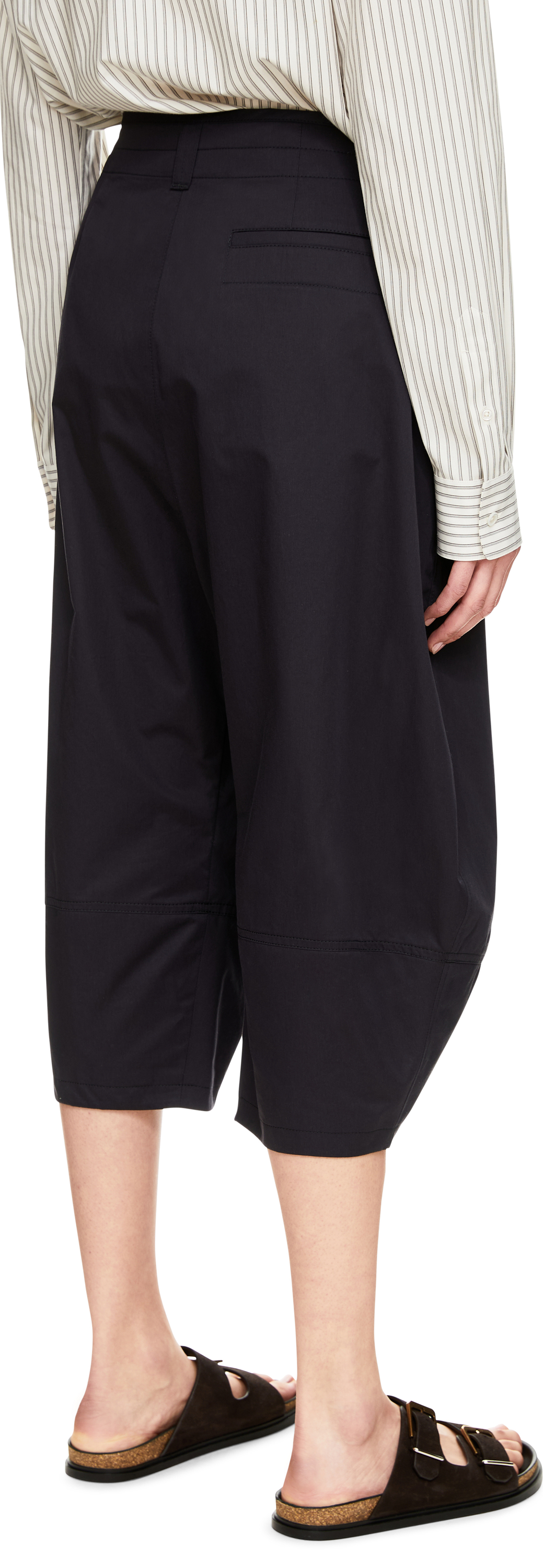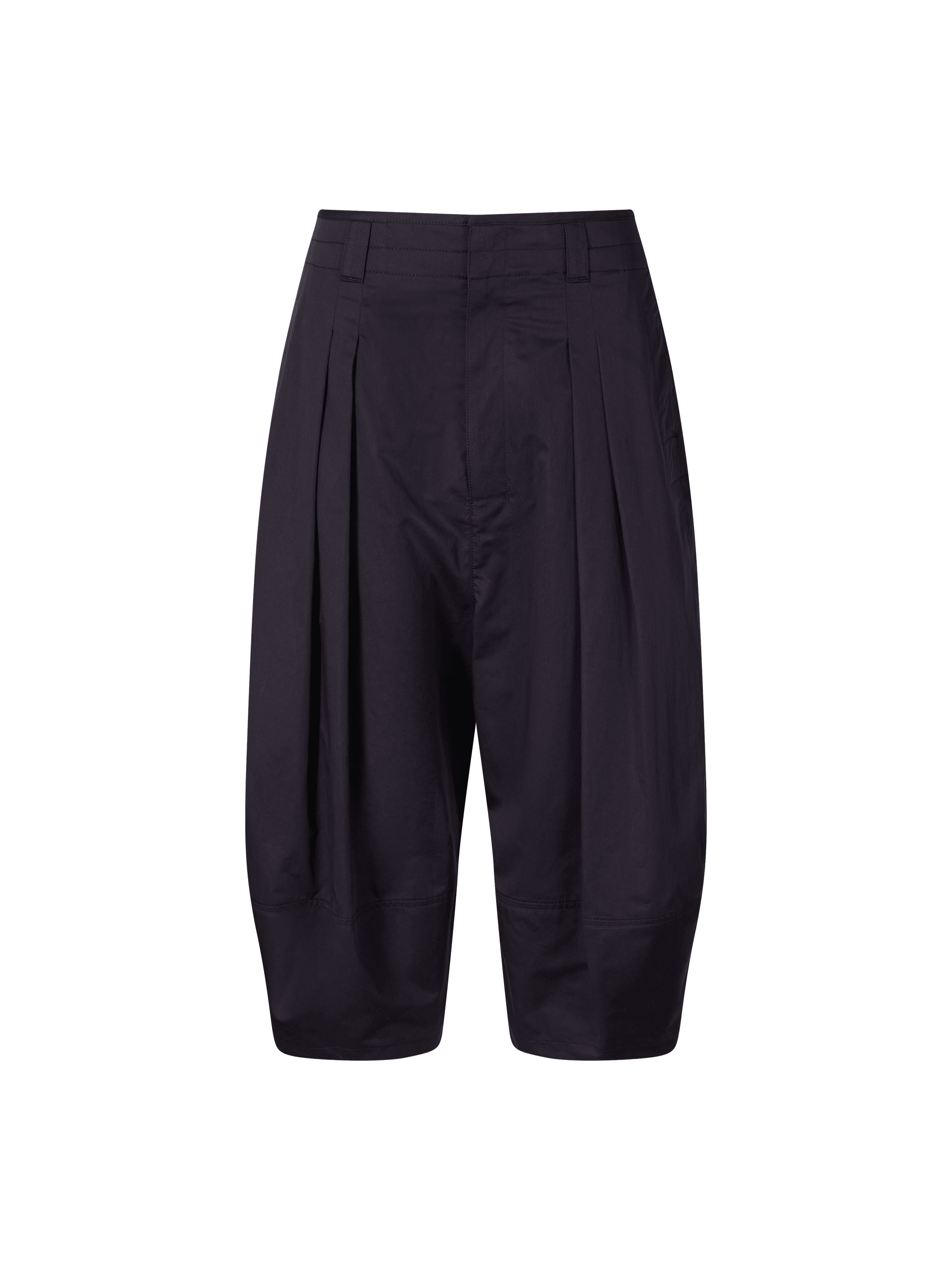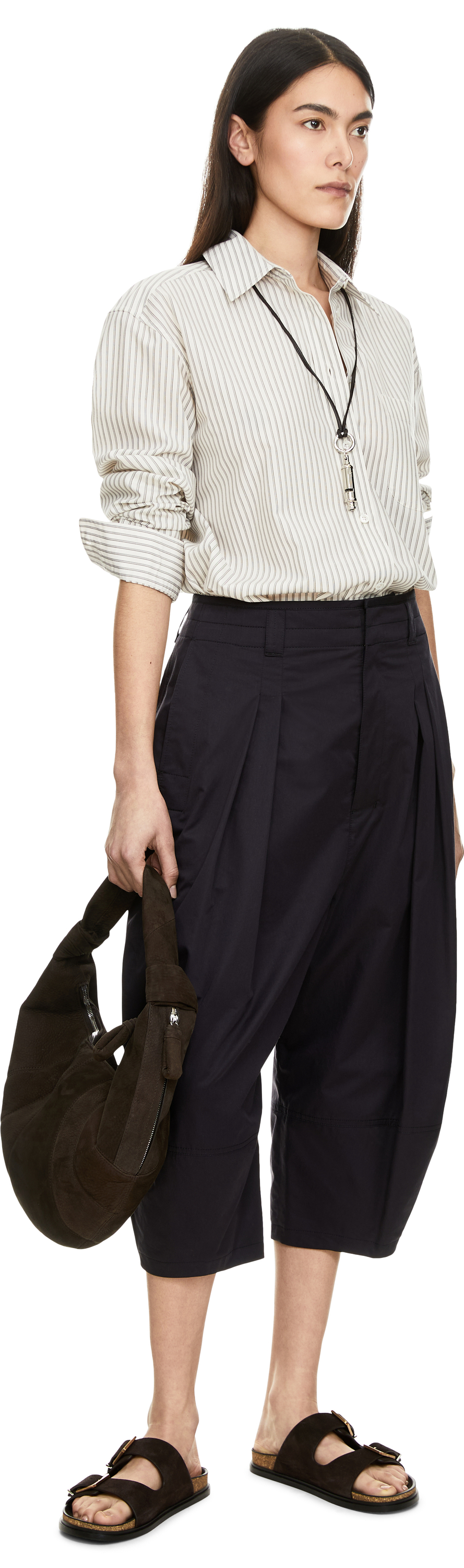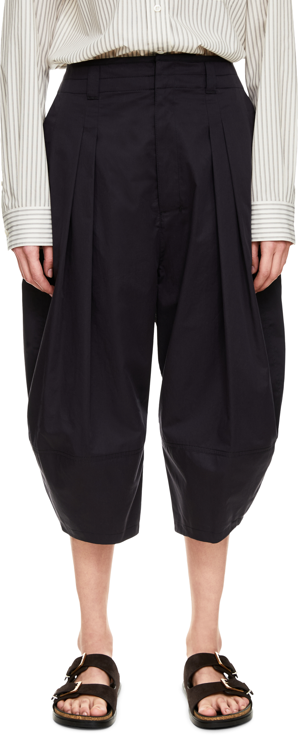 Die Bermuda in Marineblau von Lemaire wurden aus leichtem Baumwollsatin gefertigt und bestechen durch den voluminösen Ballonschnitt der Beine. Der abgesteppte Bund und vordere Falten verleihen dem Design eine strukturierte Eleganz. Seitliche Eingrifftaschen und eine rückseitige Paspeltasche runden den modernen Look harmonisch ab.