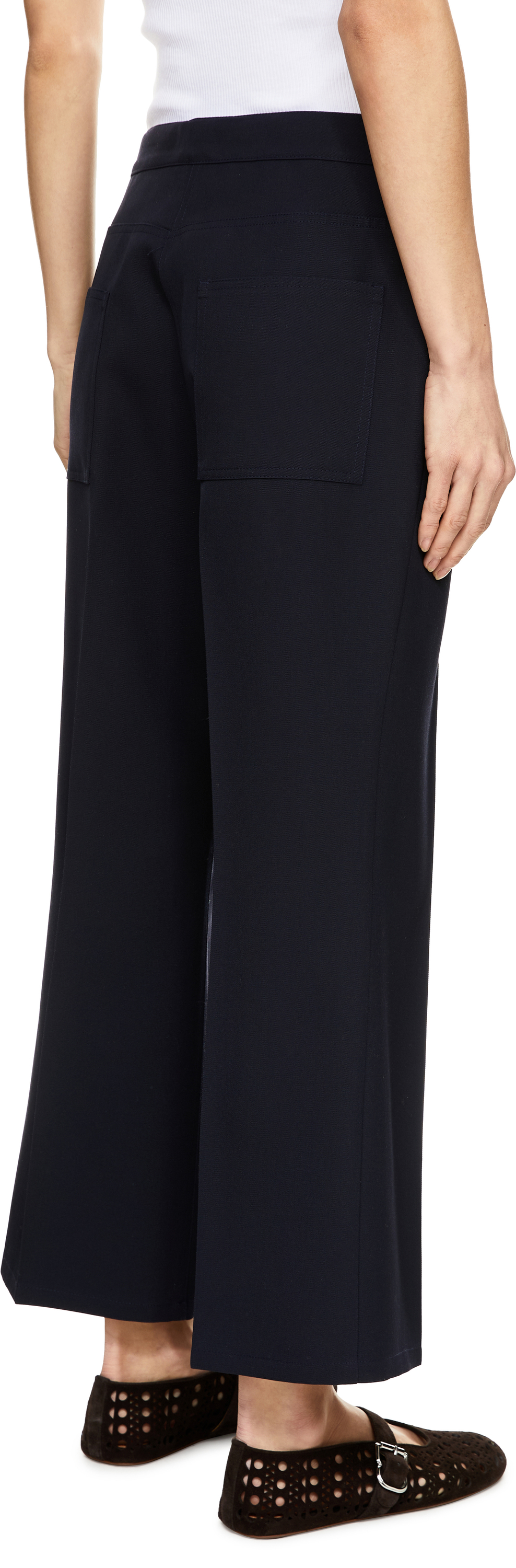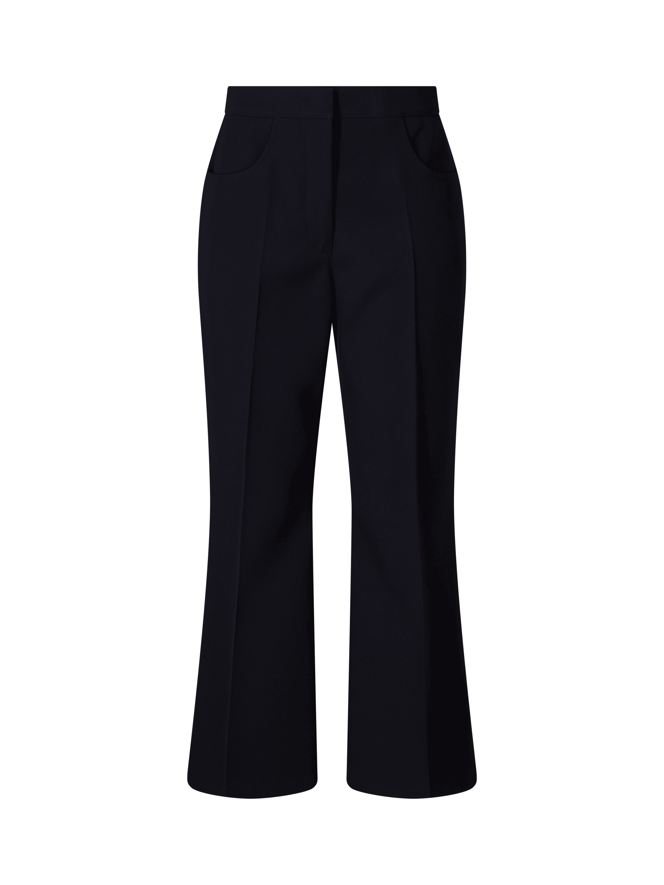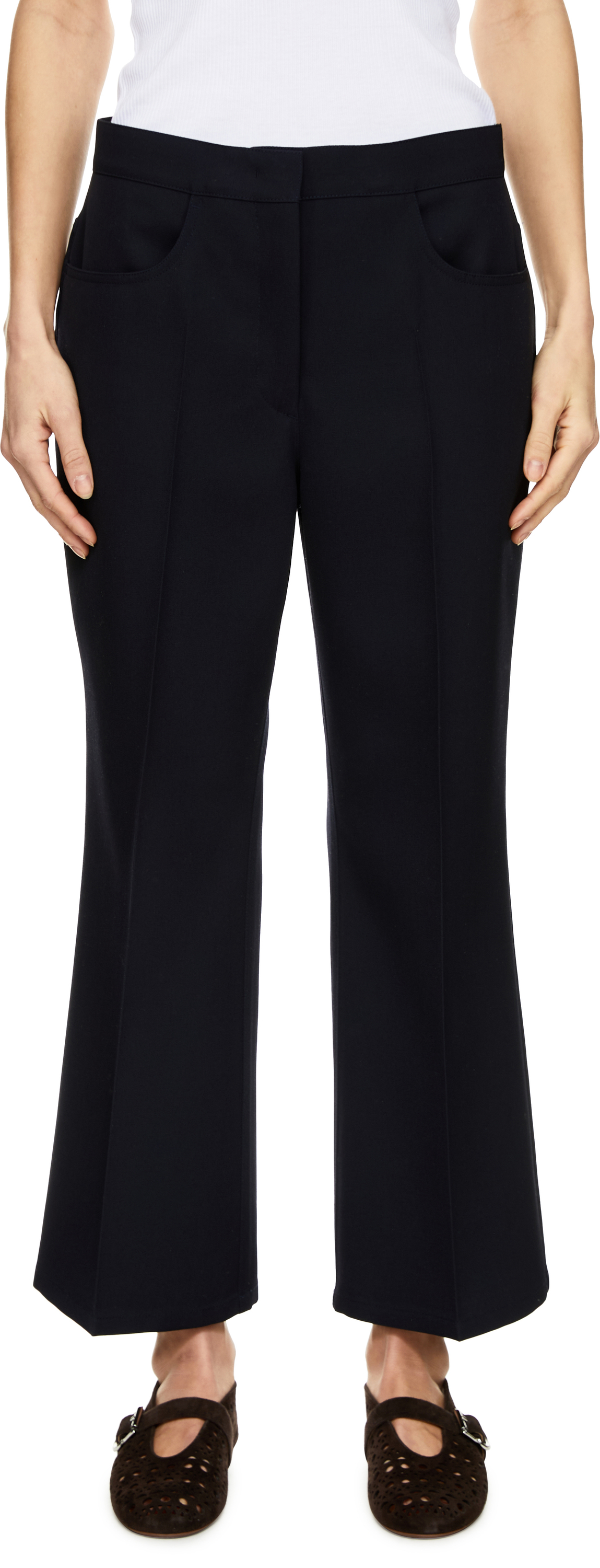 Diese Hose in Marineblau von JIL SANDER wurde aus hochwertiger Wolle gefertigt und besticht durch das leicht ausgestellte, verkürzte Bein. Die mittlere Leibhöhe sowie der verdeckte Haken- und Reißverschluss sorgen für optimalen Sitz, während seitliche Eingrifftaschen und aufgesetzte Gesäßtaschen das Design abrunden.