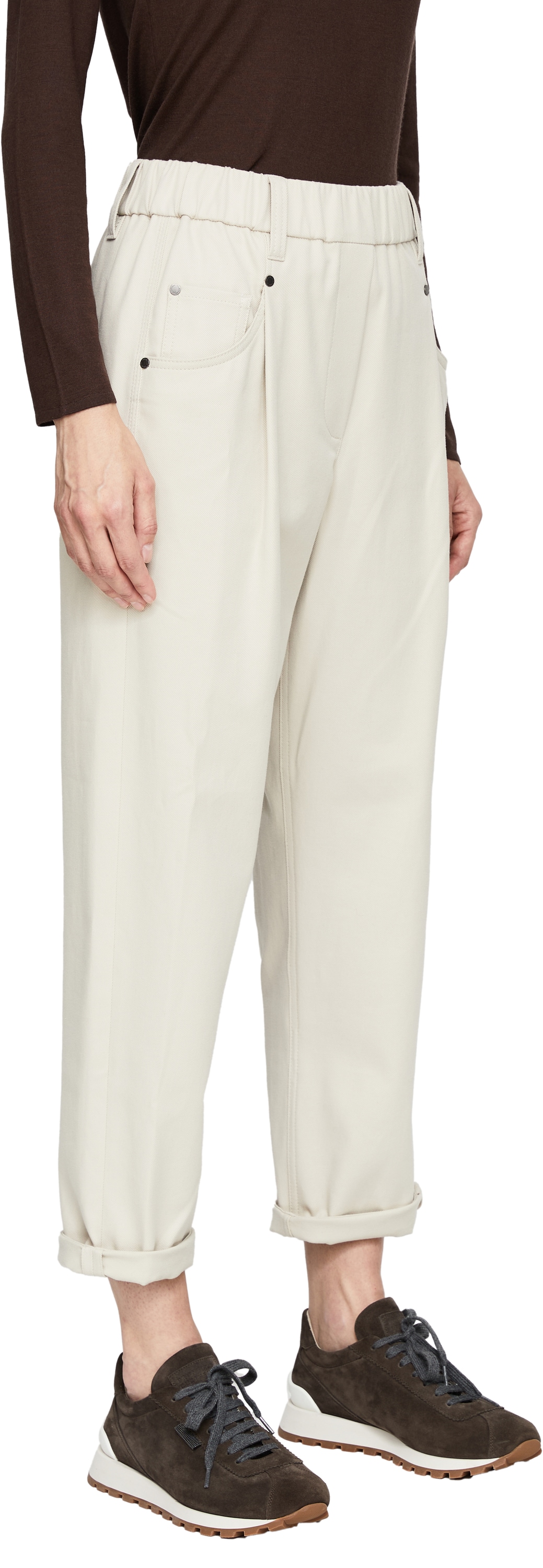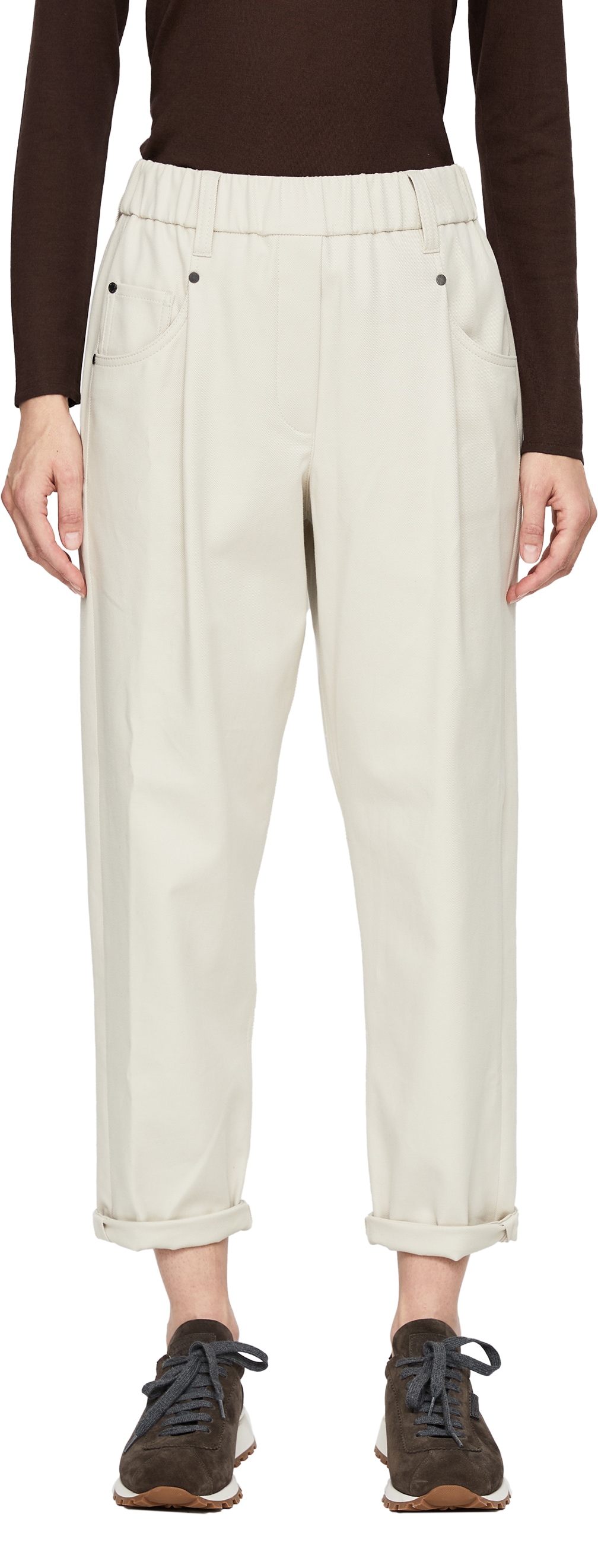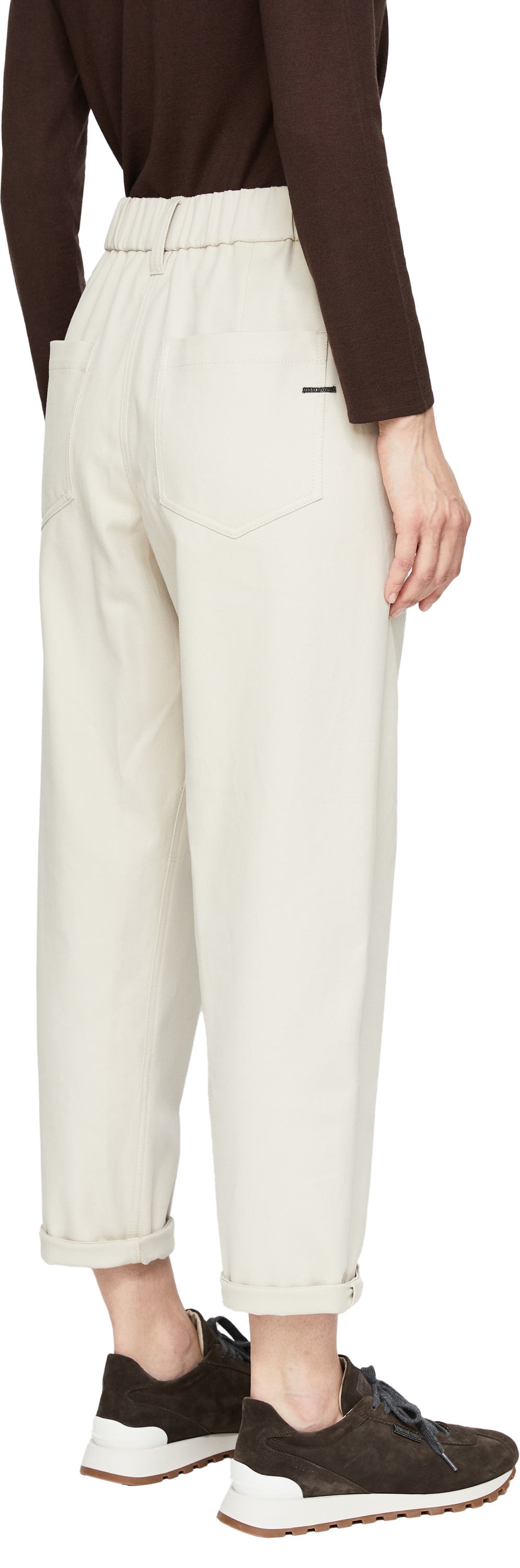 Diese Hose in Beige von Brunello Cucinelli wurde aus einer weichen Baumwollmischung gefertigt und besticht durch das lässige Design. Die verkürzte Passform, Bundfalten sowie der umgeschlagene Saum akzentuieren die moderne Silhouette. Die rückseitige Gürtelschlaufe mit ikonischen Monili-Perlen verleiht dem Modell eine exklusive Note und rundet das Design stilvoll ab.