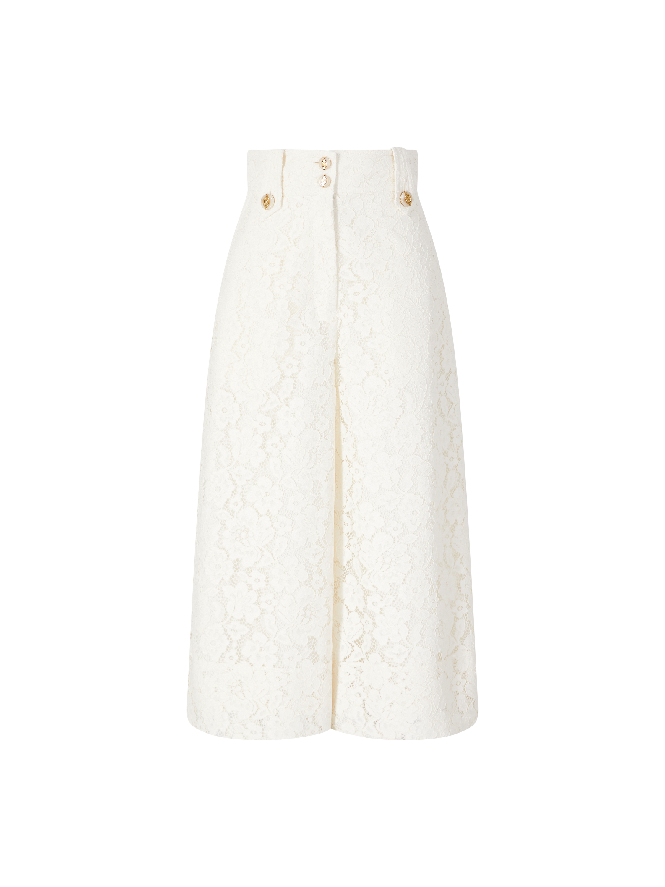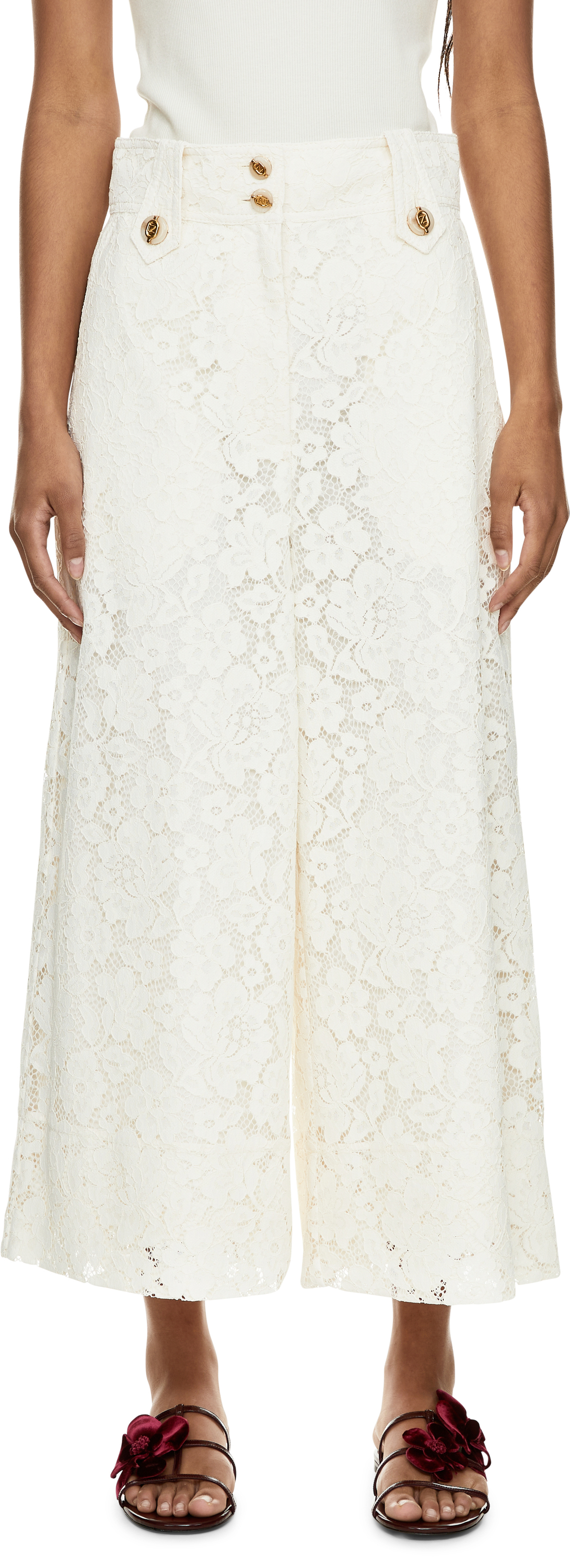 Die Hose 'Luna Lace' in Crème von Zimmermann wurde aus Polyester gefertigt und besticht durch die florale Spitze. Die klassische Culotte ist wadenlang geschnitten und zeichnet sich durch weite Beine aus. Geknöpfte Gürtelschlaufen mit goldfarbenen Brand-Details setzen elegante Akzente, während Knopf- und Reißverschluss sowie seitliche Eingrifftaschen den Tragekomfort ergänzen. Ein Baumwollfutter sorgt für angenehmes Hautgefühl.