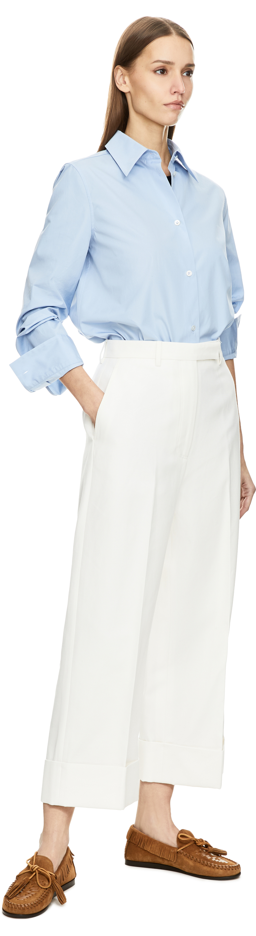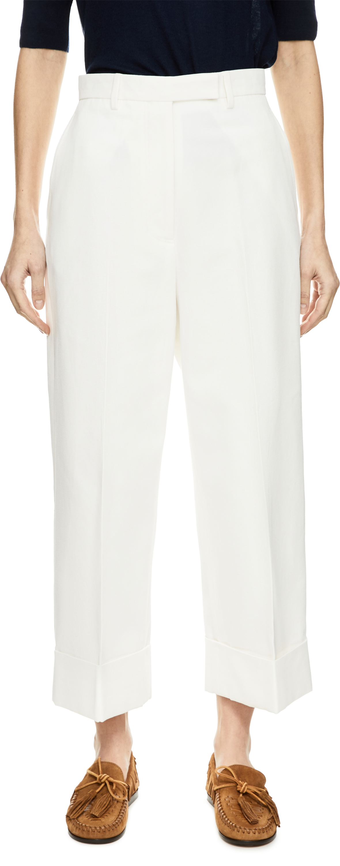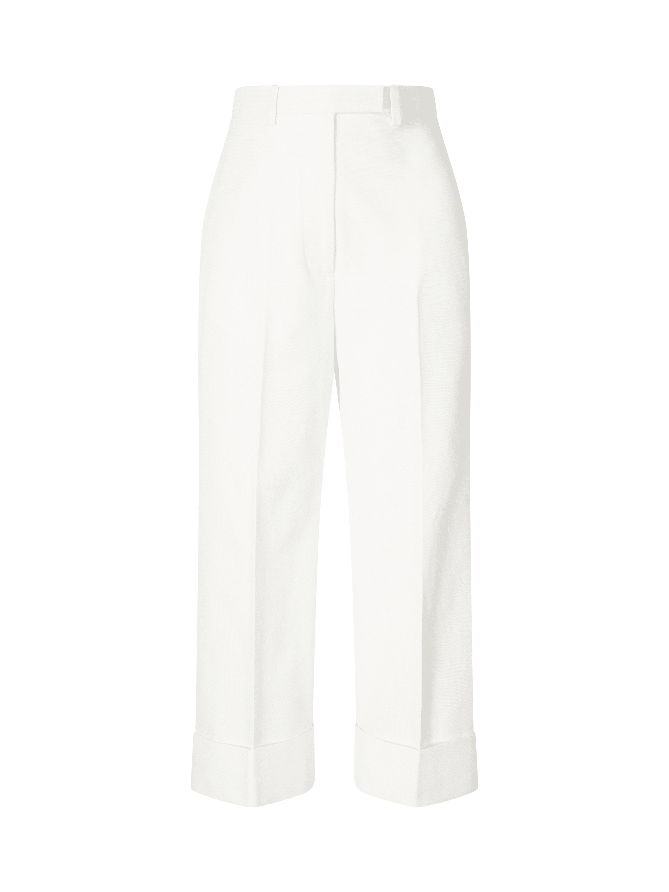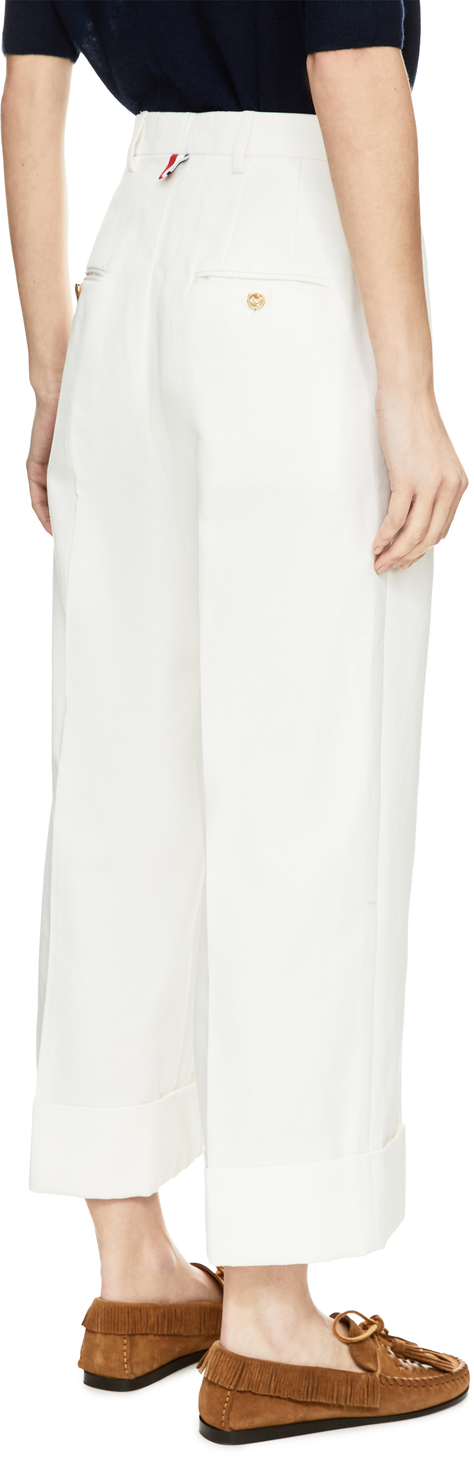 Diese Hose in Crème von Thom Browne wurde aus hochwertiger Baumwolle gefertigt und besticht durch die hohe Leibhöhe, die eine elegante Silhouette erzeugt. Das gerade Bein in Kombination mit den dekorativen Bügelfalten unterstreicht den klassischen Look. Seitliche Eingrifftaschen und rückseitige Paspeltaschen mit goldfarbenen Knöpfen verbinden Funktionalität mit Stil, während der umgelegte Saum das Design harmonisch abrundet.