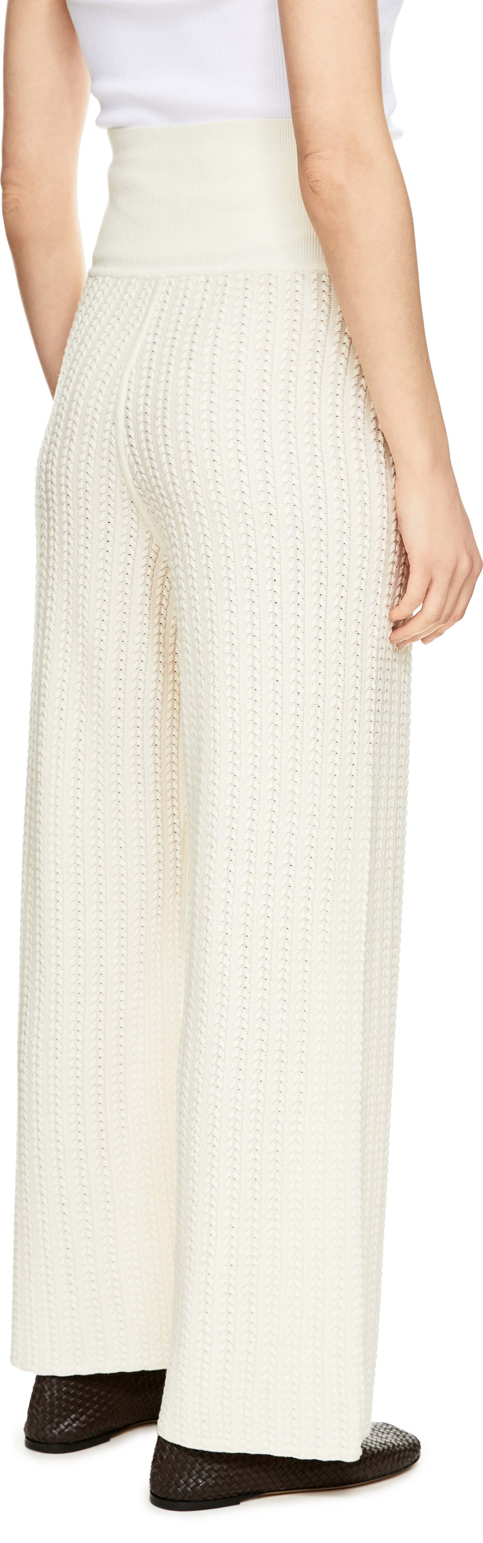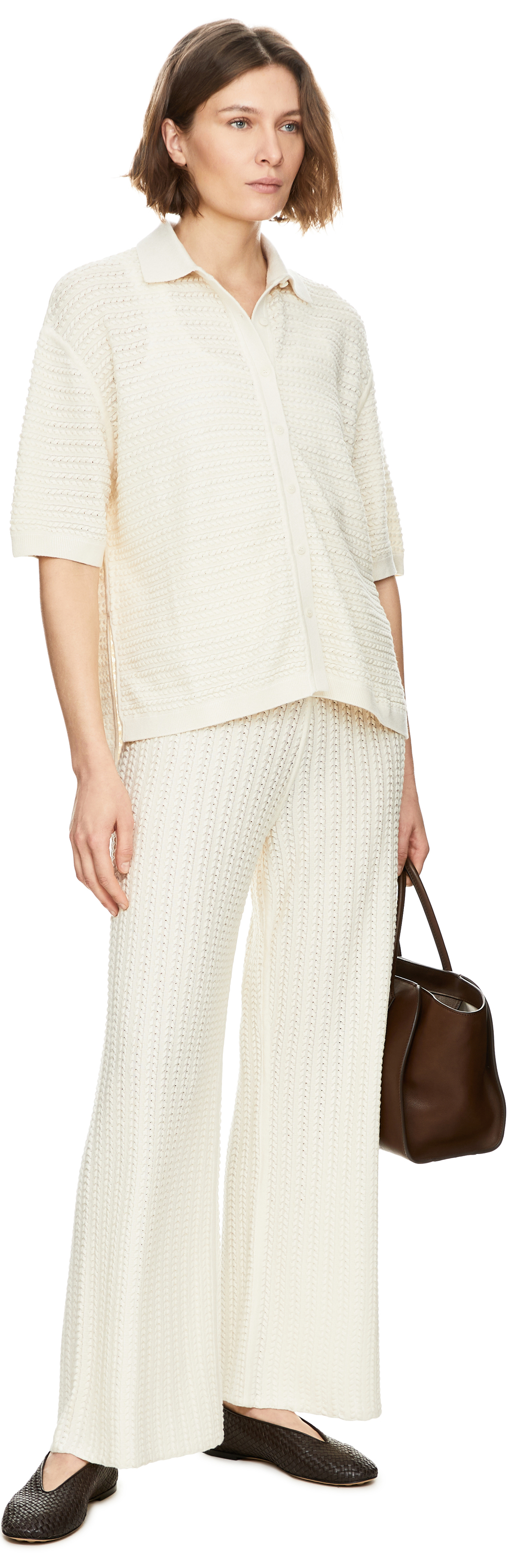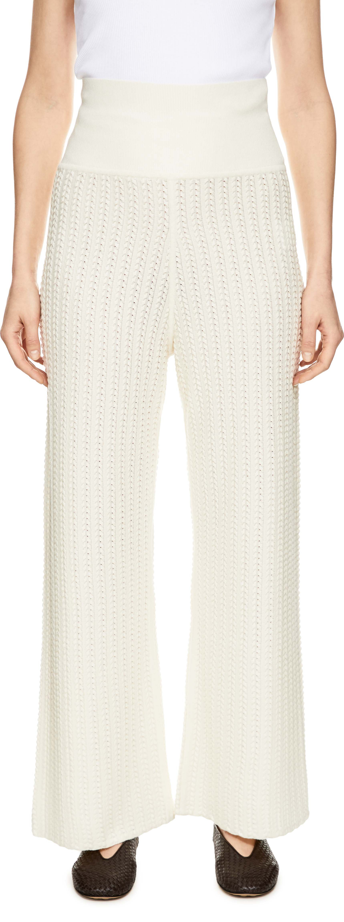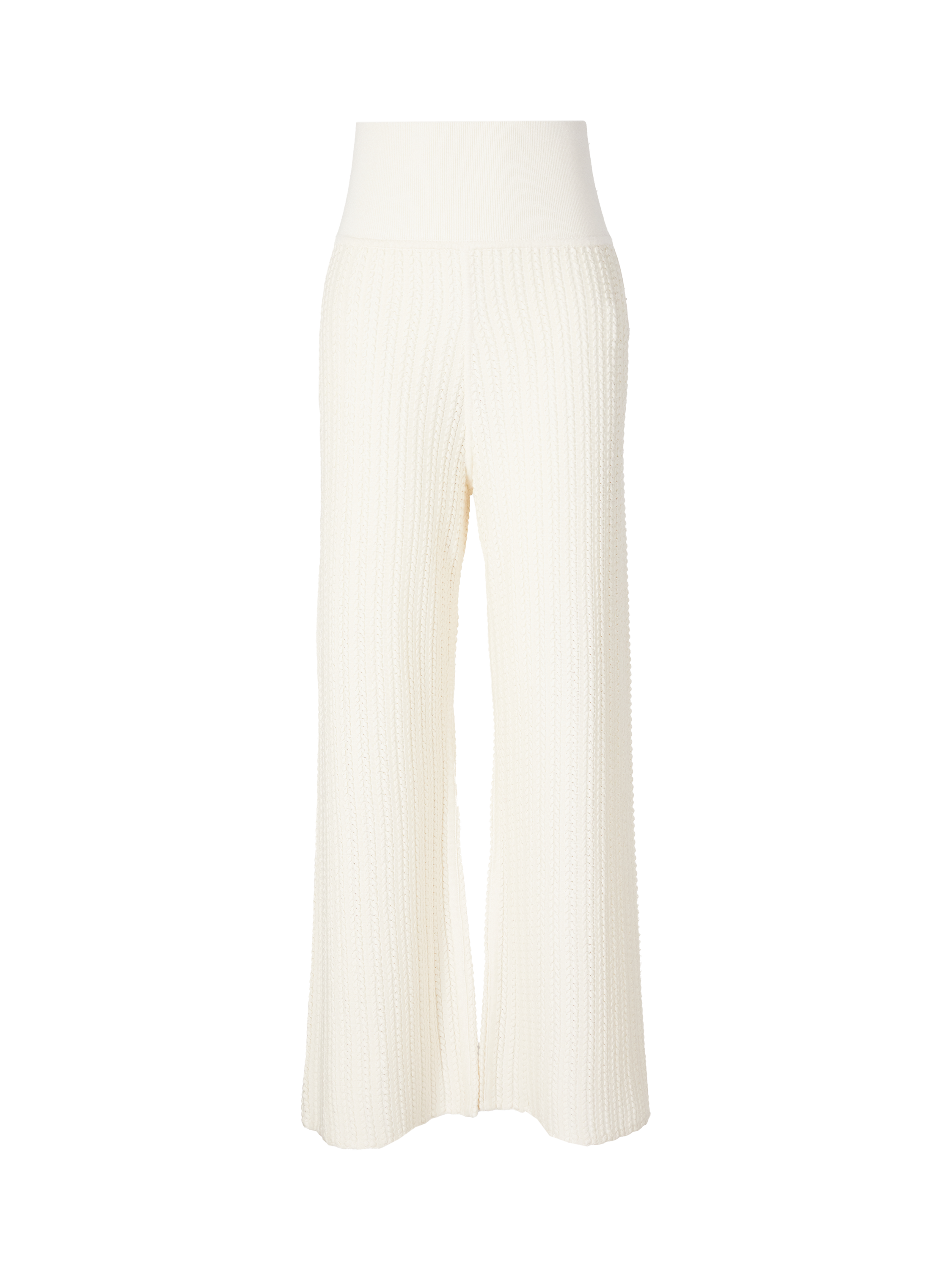 Die Hose 'St. Tropez' in Ecru von Iris von Arnim wurde aus einer hochwertigen Seiden-Cashmere-Mischung gefertigt und besticht durch das weite Bein. Die Zopfstruktur, der breite, elastische Rippbund sowie der umschlagbare Saum, der eine individuelle Anpassung der Hosenlänge ermöglicht, verleihen dem Modell eine stilvolle und moderne Note.