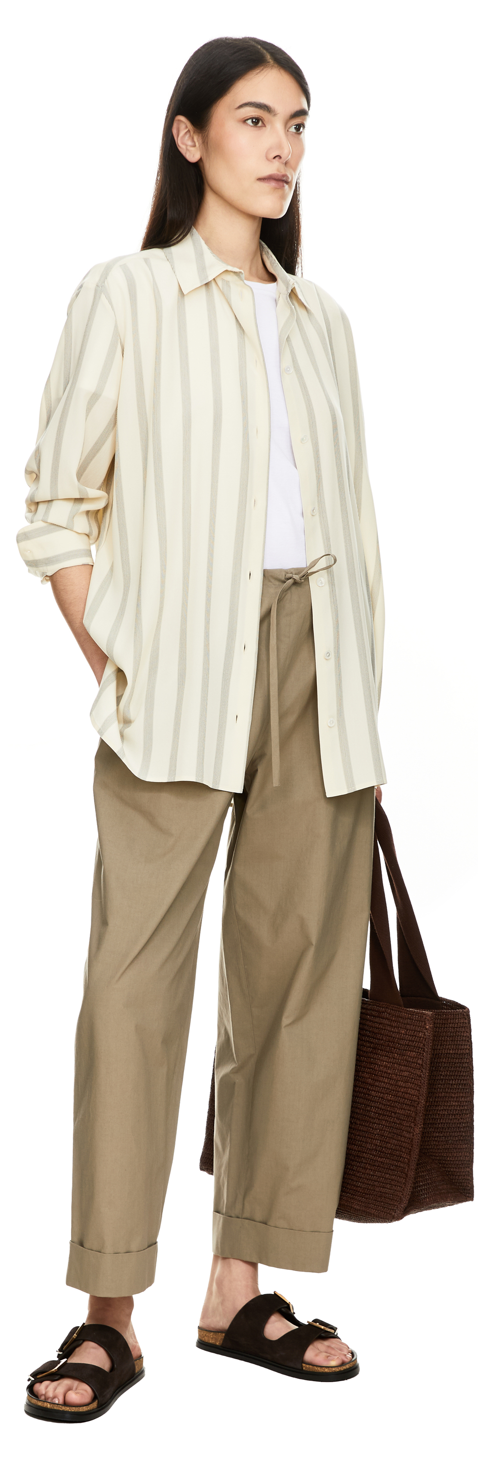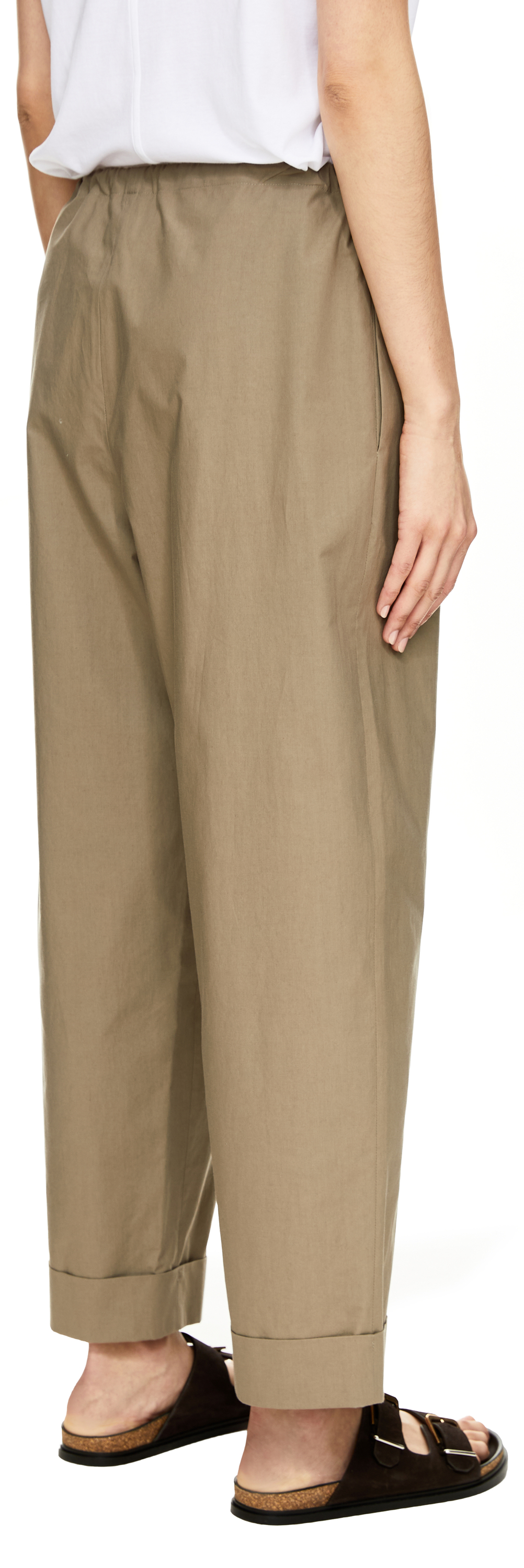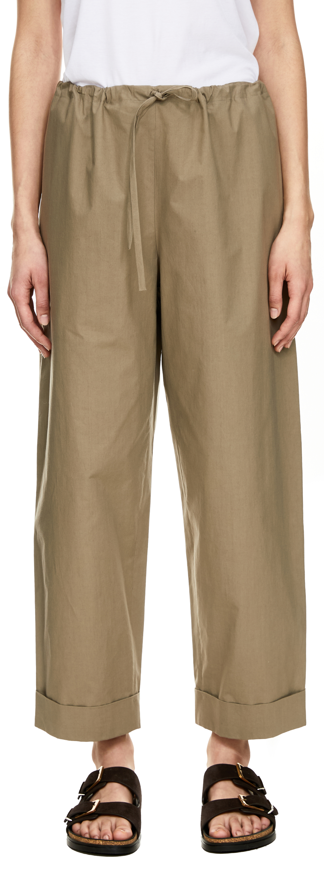 Die Hose 'Delano' in Khaki von The Row wurde aus hochwertiger Baumwollpopeline gefertigt und besticht durch die lässige Silhouette. Der Kordelzug im Bund sowie die dezenten Seitentaschen sorgen für praktische Details. Die niedrige Leibhöhe und der umgeschlagene Beinsaum verleihen dem Modell eine entspannte Note und runden das Design stilvoll ab.