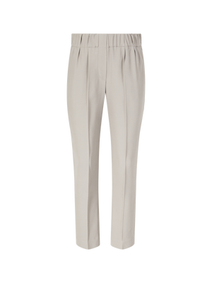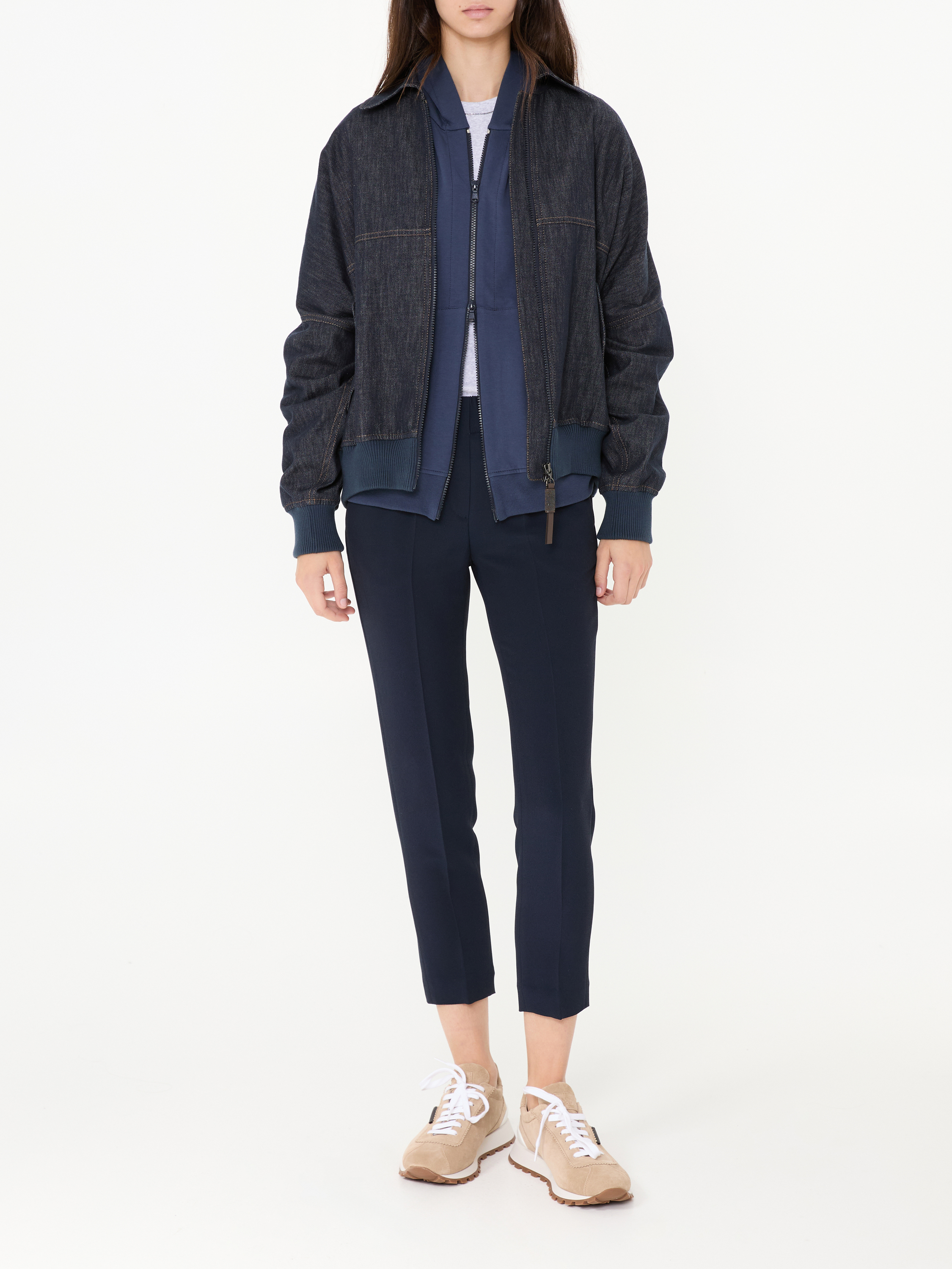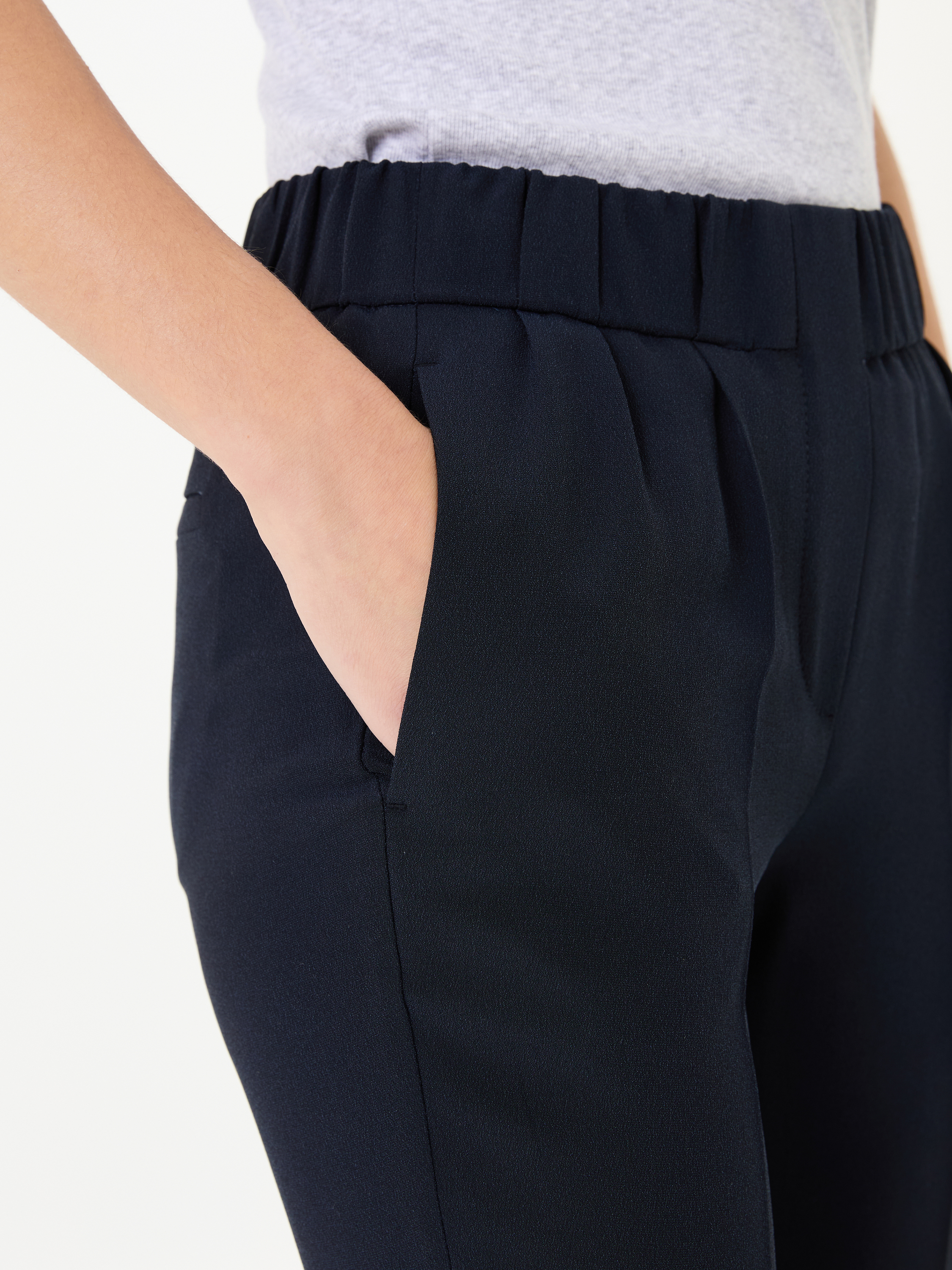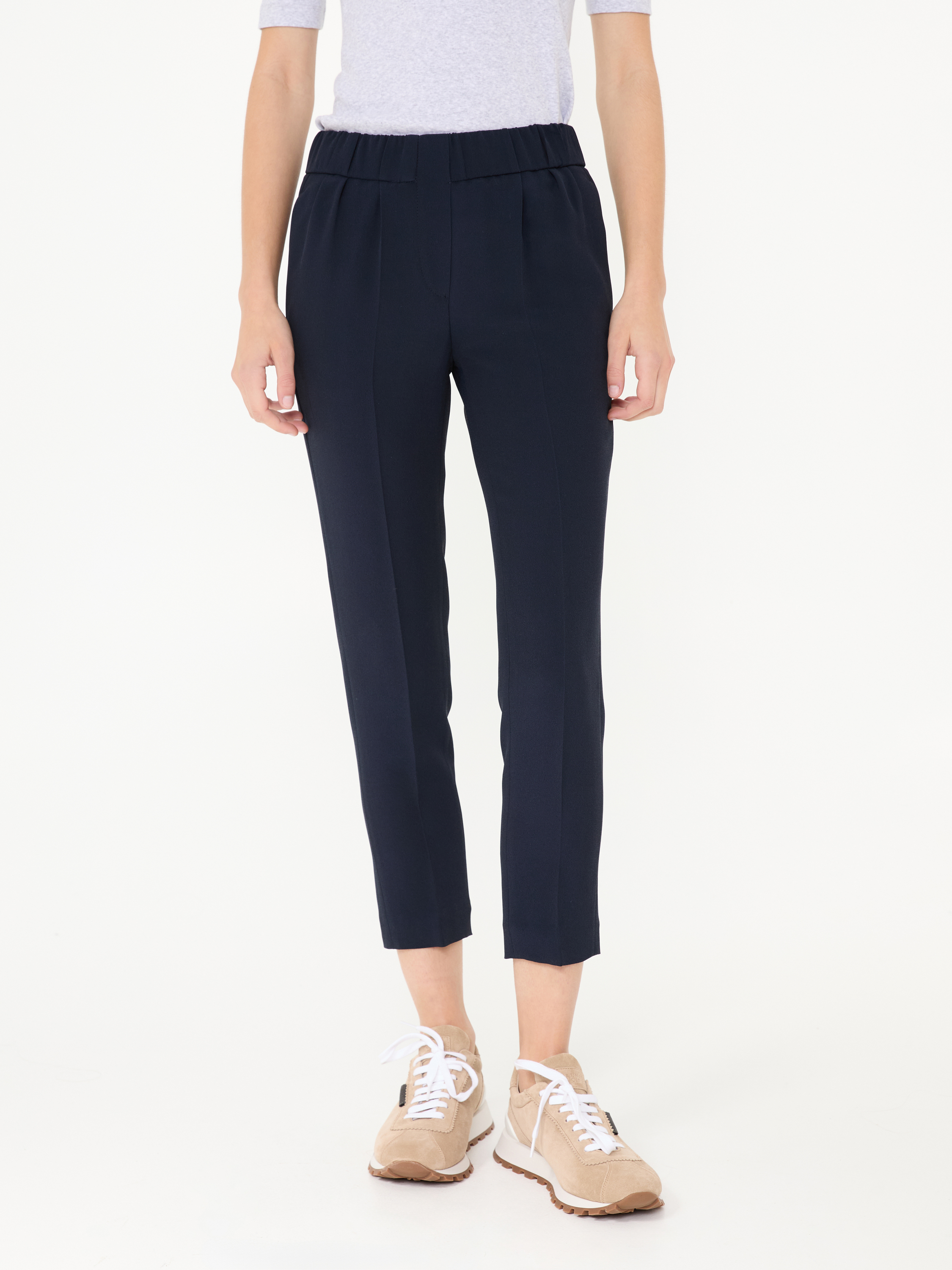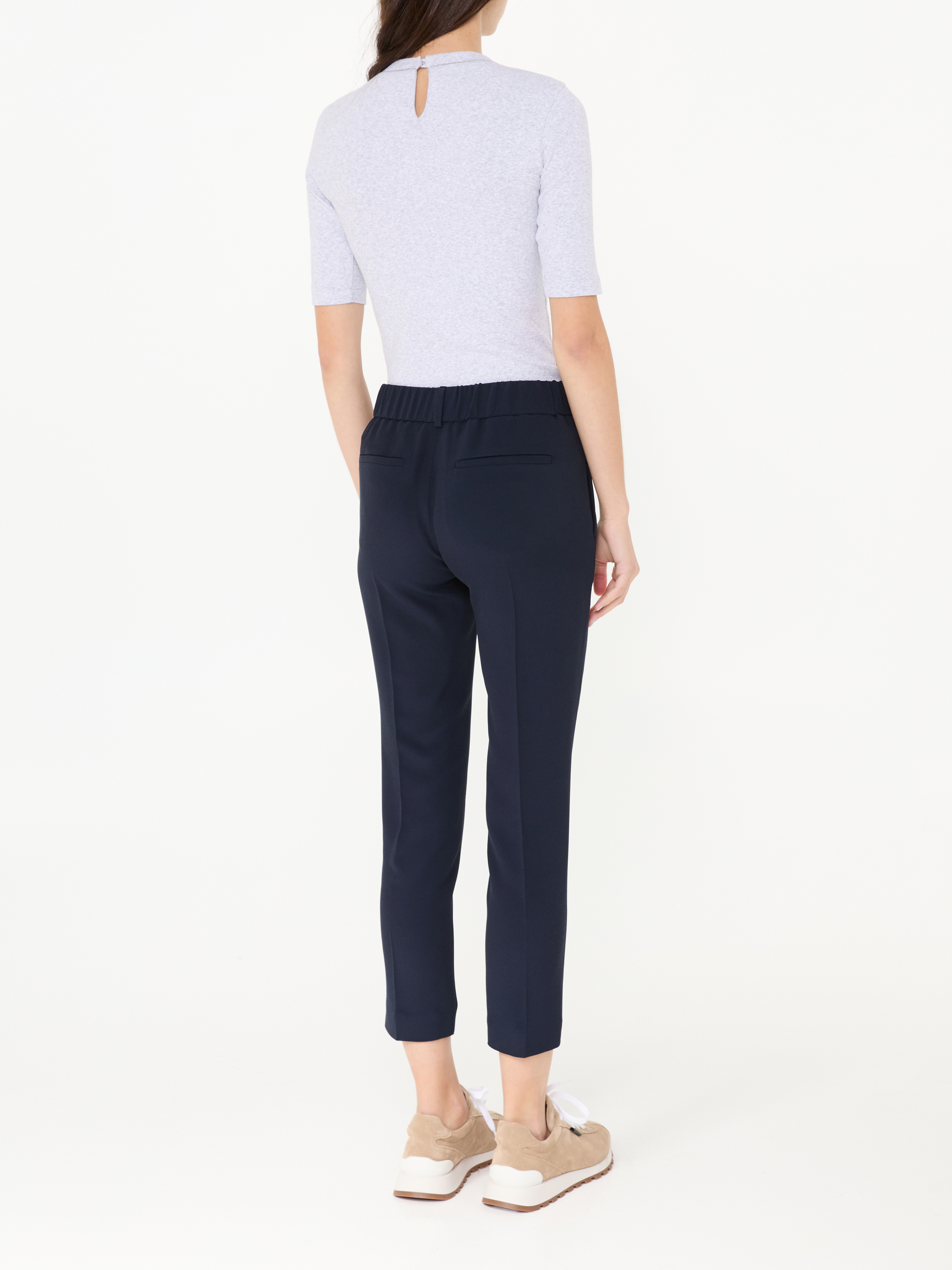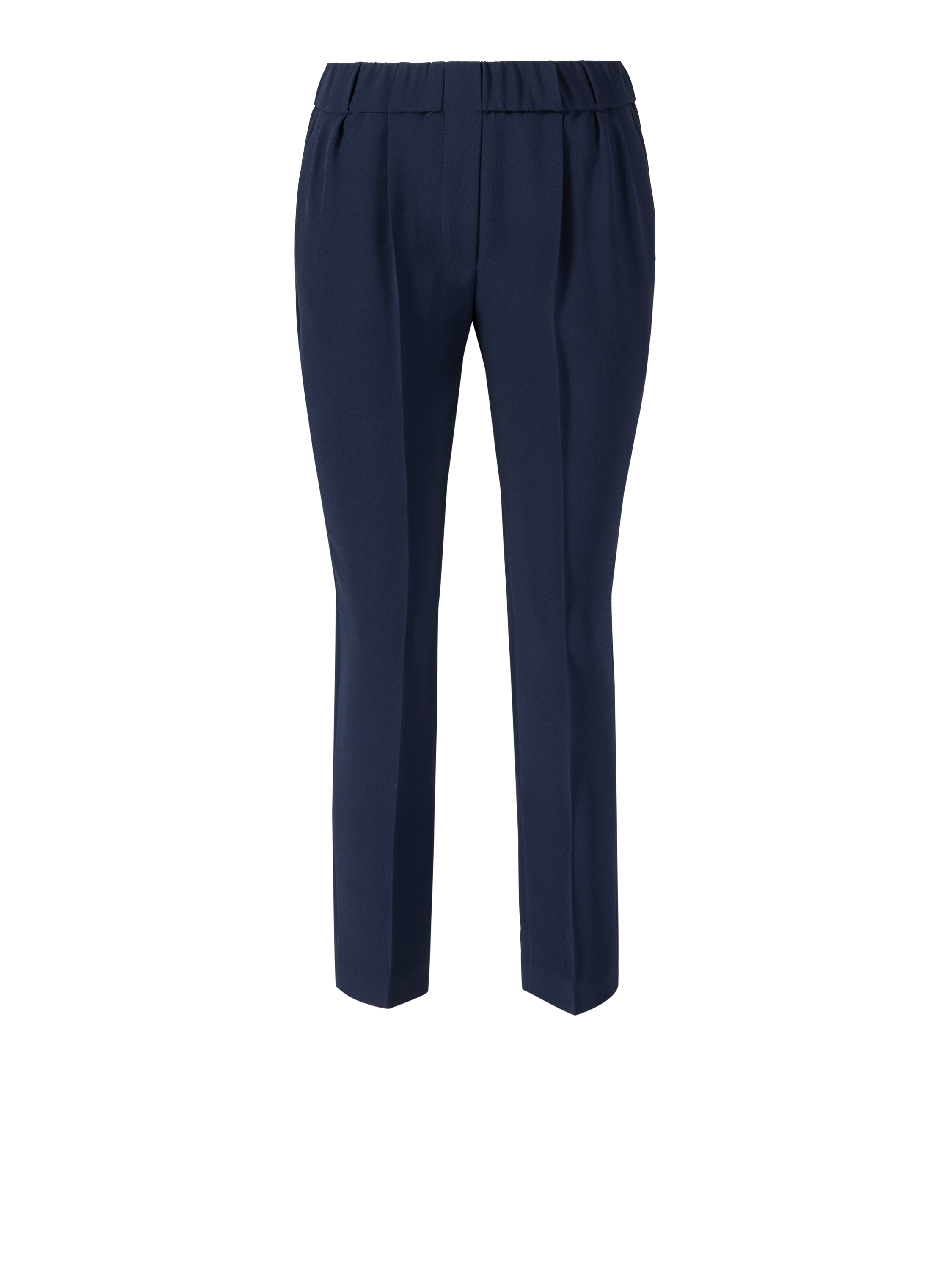 Diese Hose in Marineblau von Brunello Cucinelli wurde aus einer hochwertigen Materialmischung gefertigt und besticht durch die feminine Silhouette. Das verkürzte Bein wird durch elegante Bundfalten betont, während der elastische Bund dem Modell einen besonders angenehmen Tragekomfort verleiht.