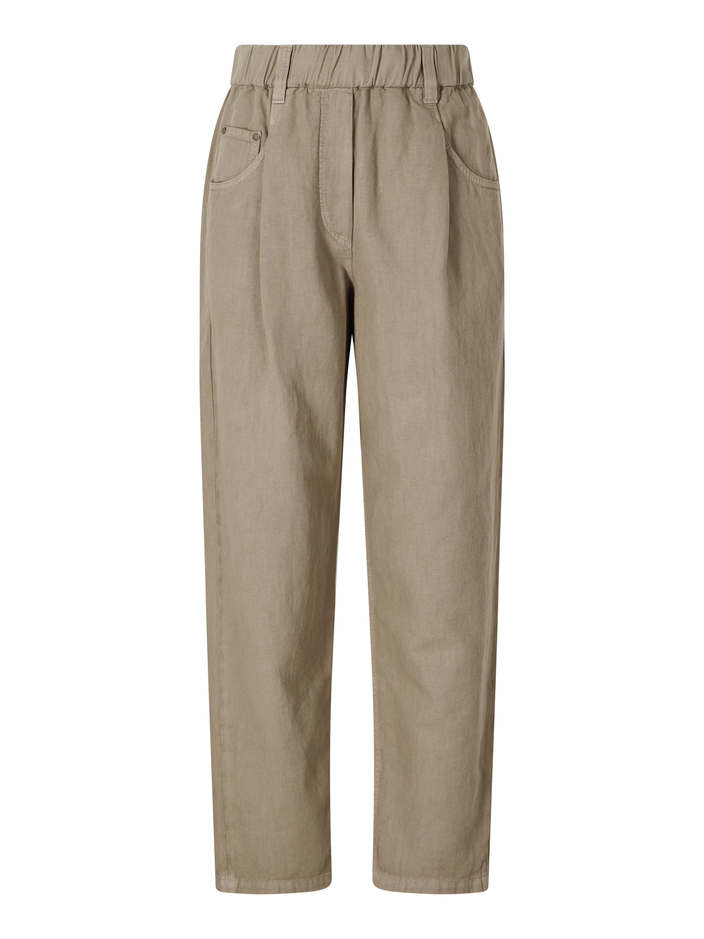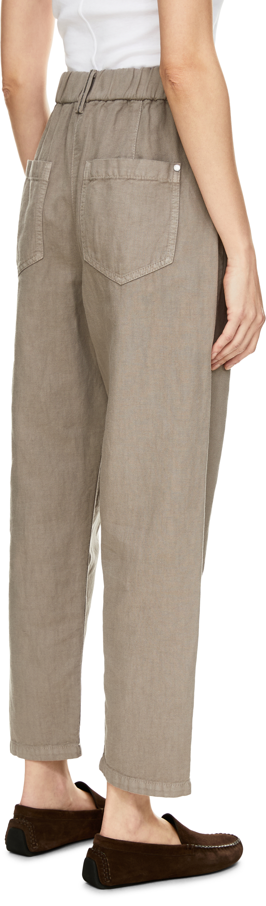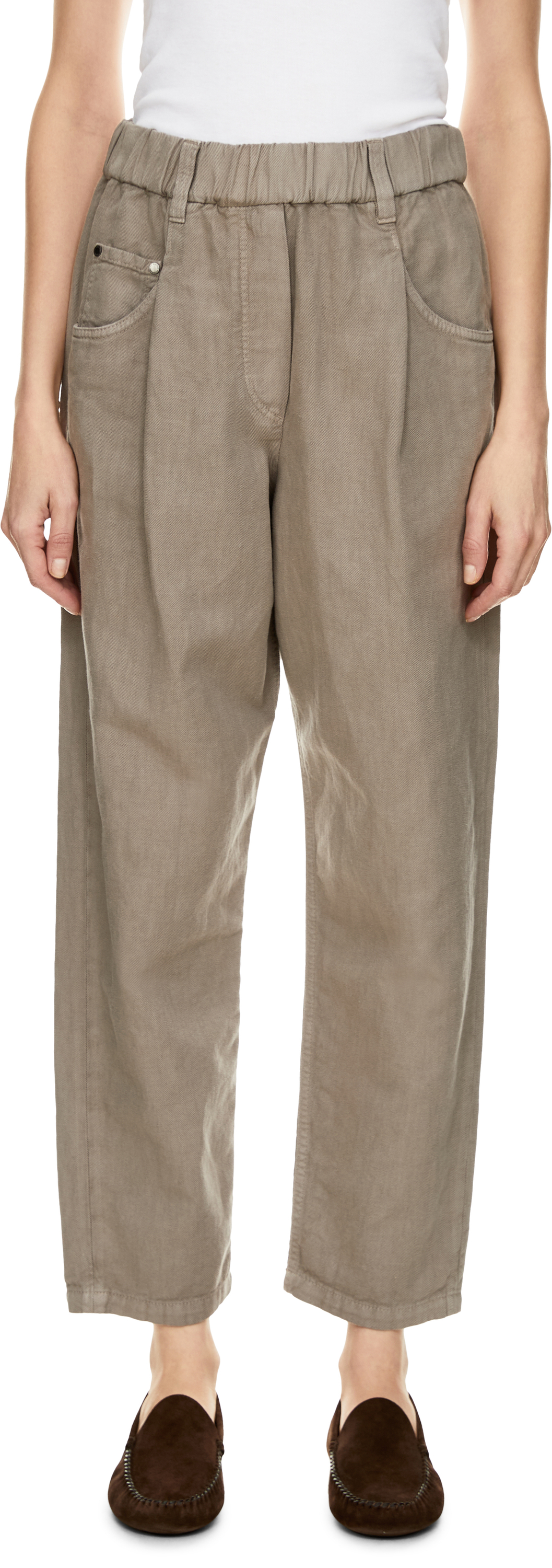 Die Hose in Braun von Brunello Cucinelli wurde aus stückgefärbter Baumwoll-Leinenmischung gefertigt und besticht durch die lässige Silhouette. Die sartorialen Bundfalten, das 5-Pocket-Design, der einfache Saum sowie die schimmernden Monili-Perlen an der hinteren Gürtelschlaufe unterstreichen das edle Design.