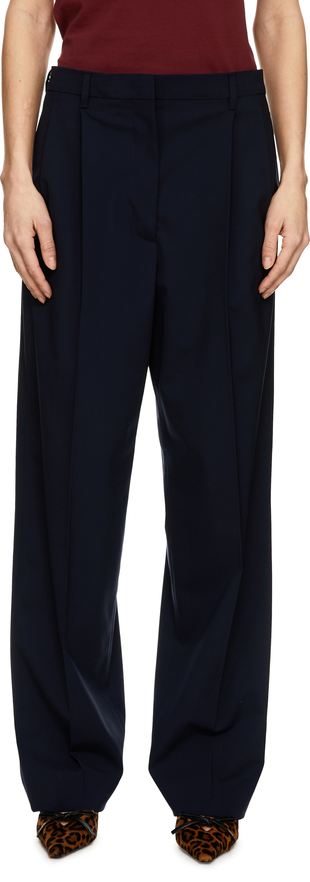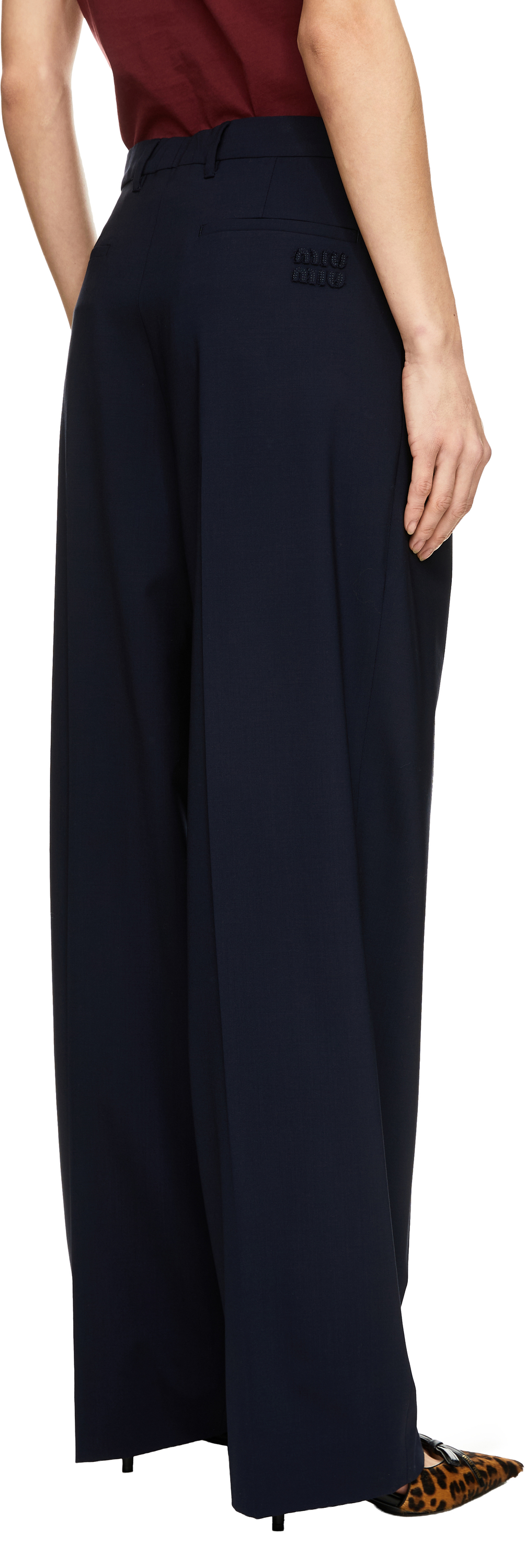 Diese Hose in Marineblau von miu miu wurde aus reiner Wolle gefertigt und besticht durch die fließende und klassische Eleganz. Der gestickte Logo-Schriftzug, das weite Bein sowie die Falten auf der Rückseite verleihen dem Modell eine elegante, legere Note, während die seitlichen Eingrifftaschen und die rückseitigen Paspeltaschen das Design funktional abrunden.