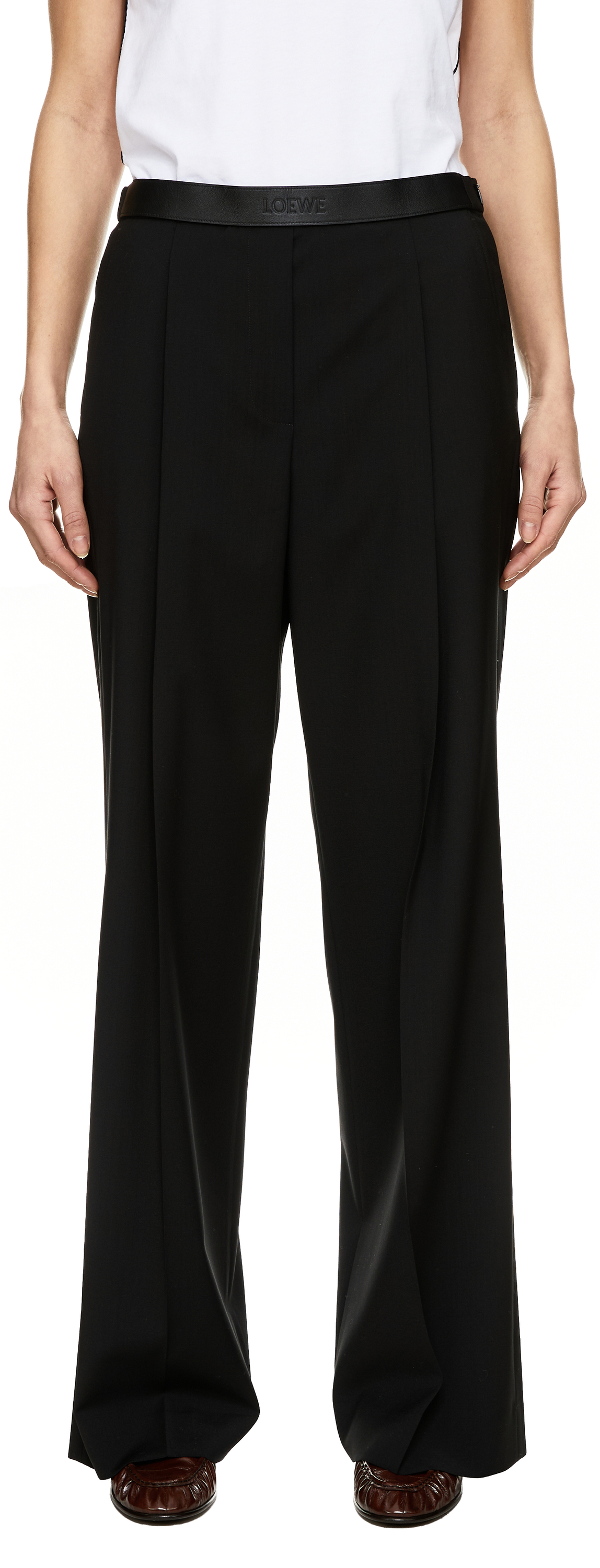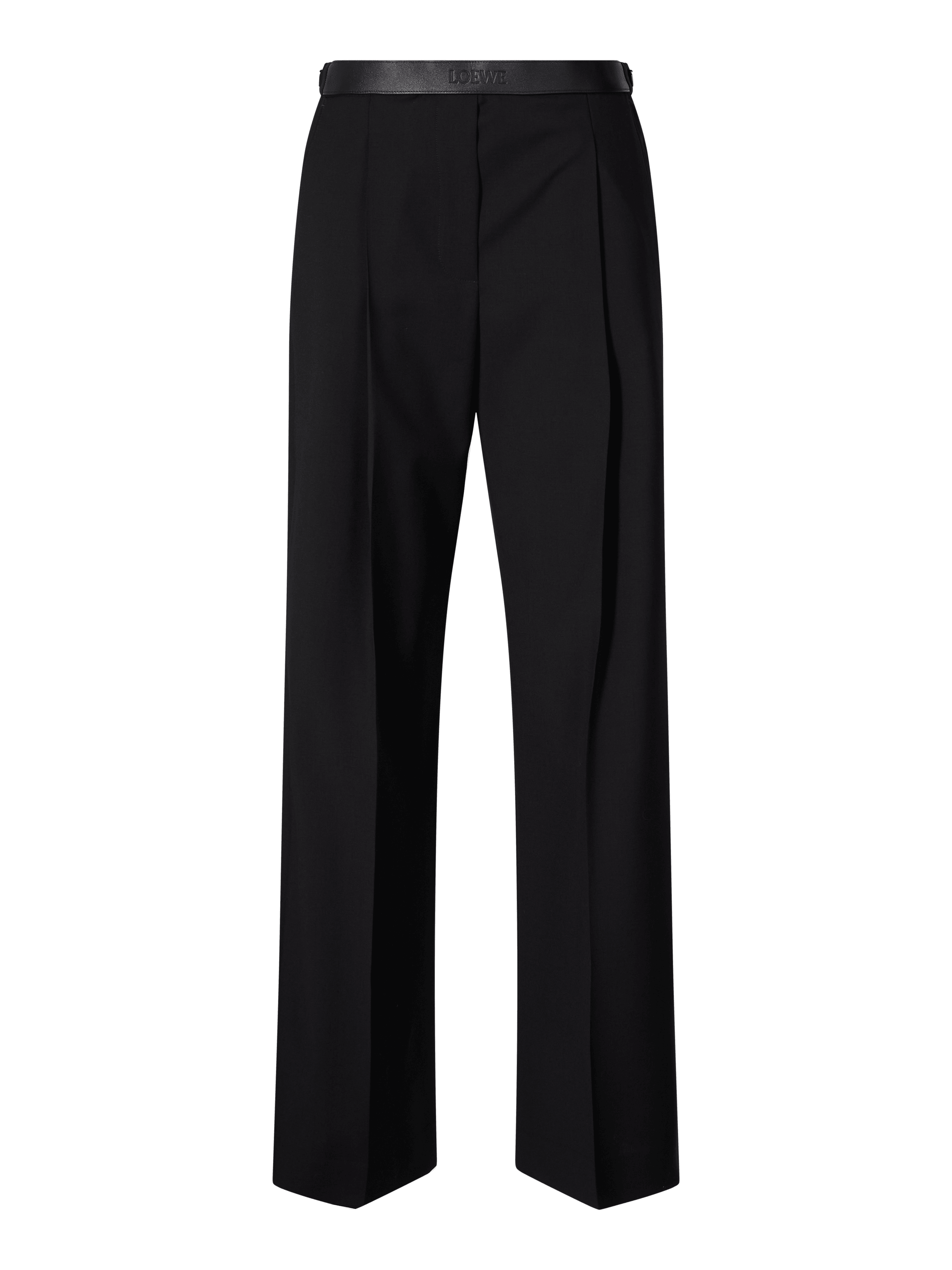 Diese Hose in Schwarz von LOEWE wurde aus leichter, fließend geschnittener Wolle gefertigt und besticht durch den LOEWE-geprägten Lederbund auf der Vorderseite. Die normale Passform, die mittlere Leibhöhe, das gerade Bein, die gepressten Falten auf der Vorder- und Rückseite sowie die Eingrifftaschen vollenden dieses Modell.