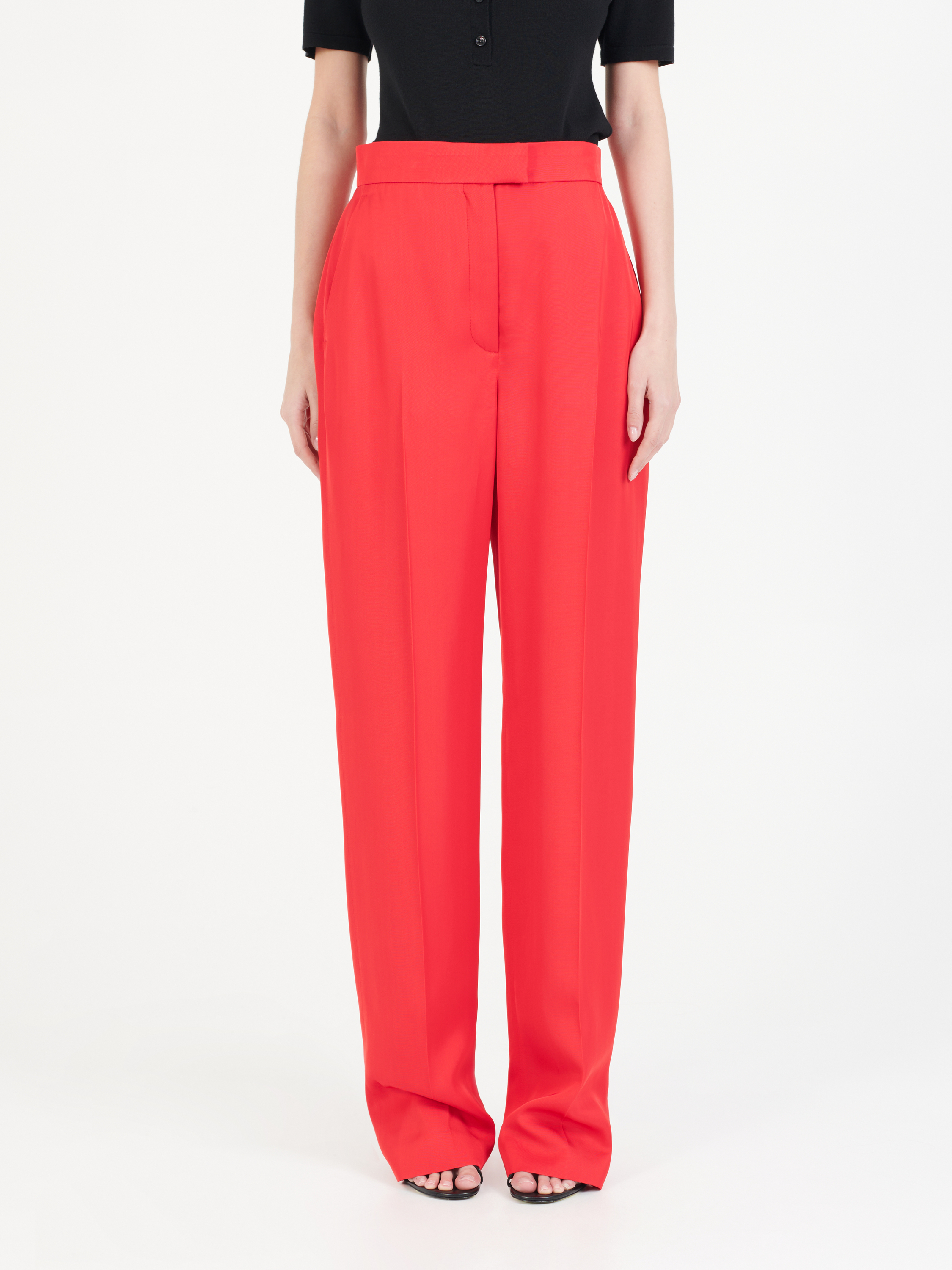 Diese Zigarettenhose von Alexander McQueen in Rot wurde aus einem hochwertigen Materialgemisch gefertigt. Die gerade Silhouette, die seitlichen Eingriffstaschen und die rückseitigen Paspeltaschen runden das Design stilvoll ab.