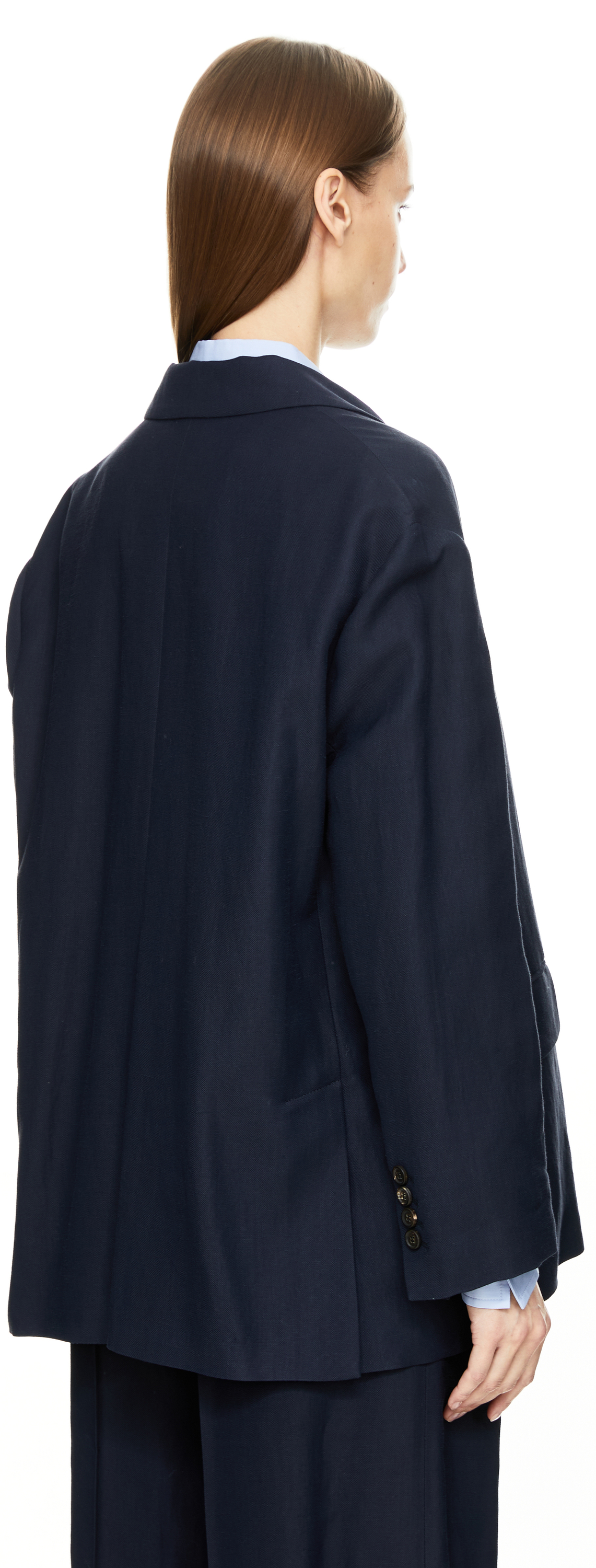 Dieser Blazer in Marineblau von Brunello Cucinelli wurde aus einer Leinenmischung gefertigt und besticht durch die strukturierte Optik und Haptik. Das Modell wird durch die einreihige Knopfleiste, die Paspeltaschen sowie den Doppelschlitz auf der Rückseite stilvoll ergänzt. Einen stimmigen Abschluss schaffen der steigende Reverskragen sowie die Monili-Perlen am Kragen.