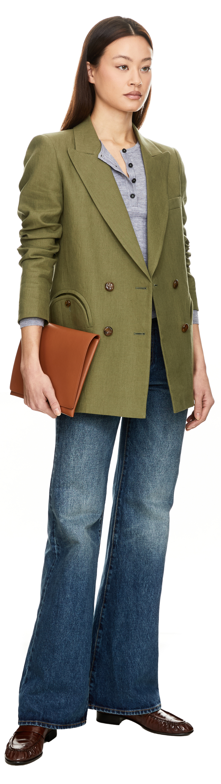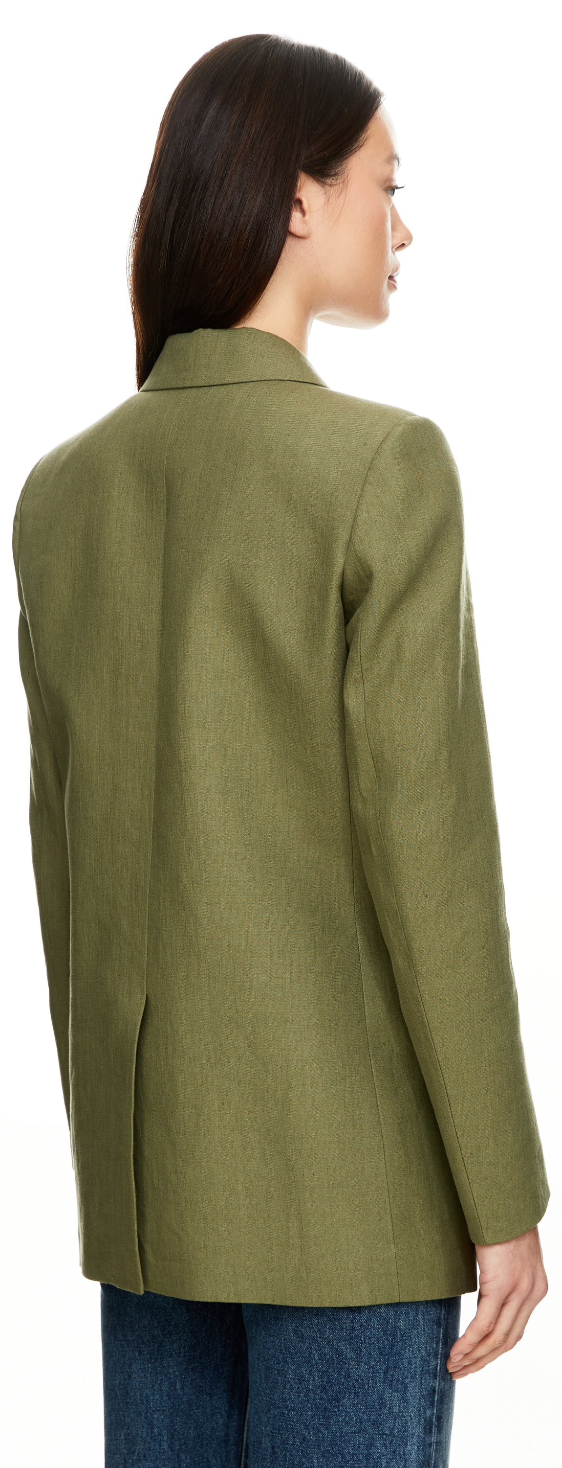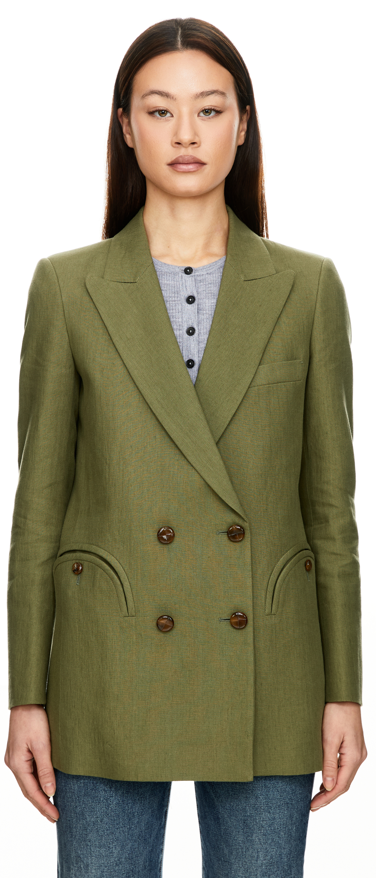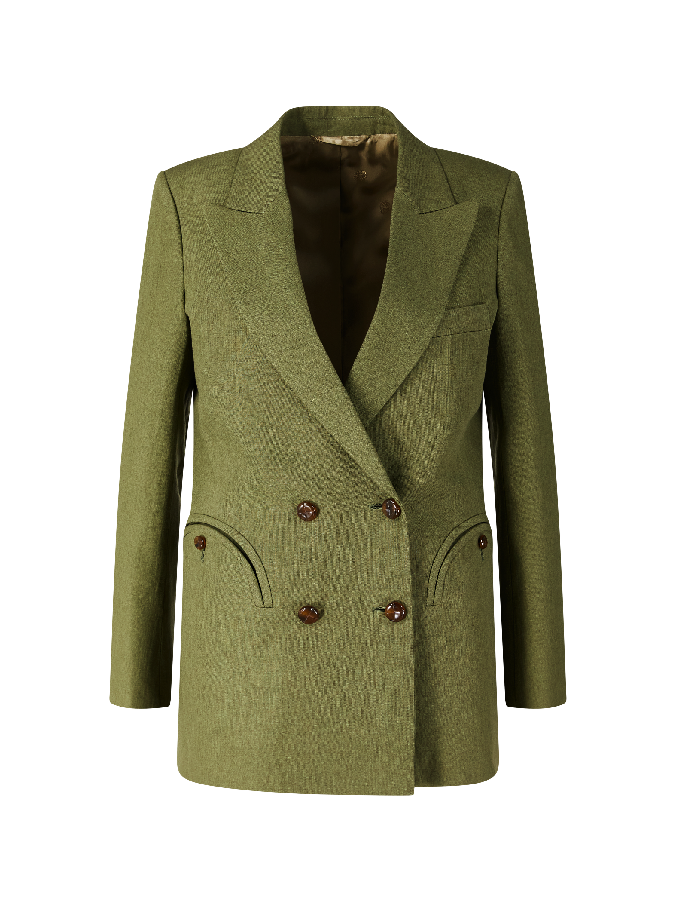 Der Blazer 'Midday Sun Everyday' in Hellgrün von Blazé Milano wurde aus reinem Leinen gefertigt und besticht durch charakteristische geschwungene „Smiley“-Taschen. Die gerade Silhouette sorgt für einen lässigen Akzent, während die doppelreihige Knopfleiste das Design komplettieren.