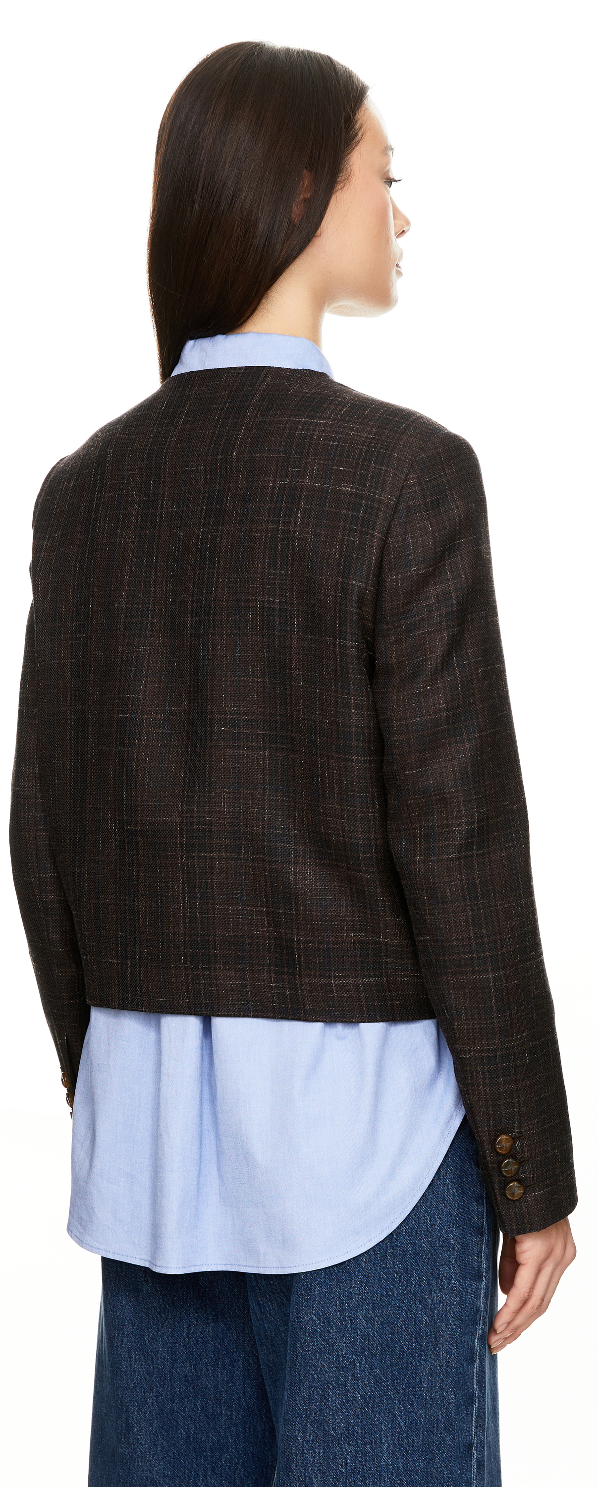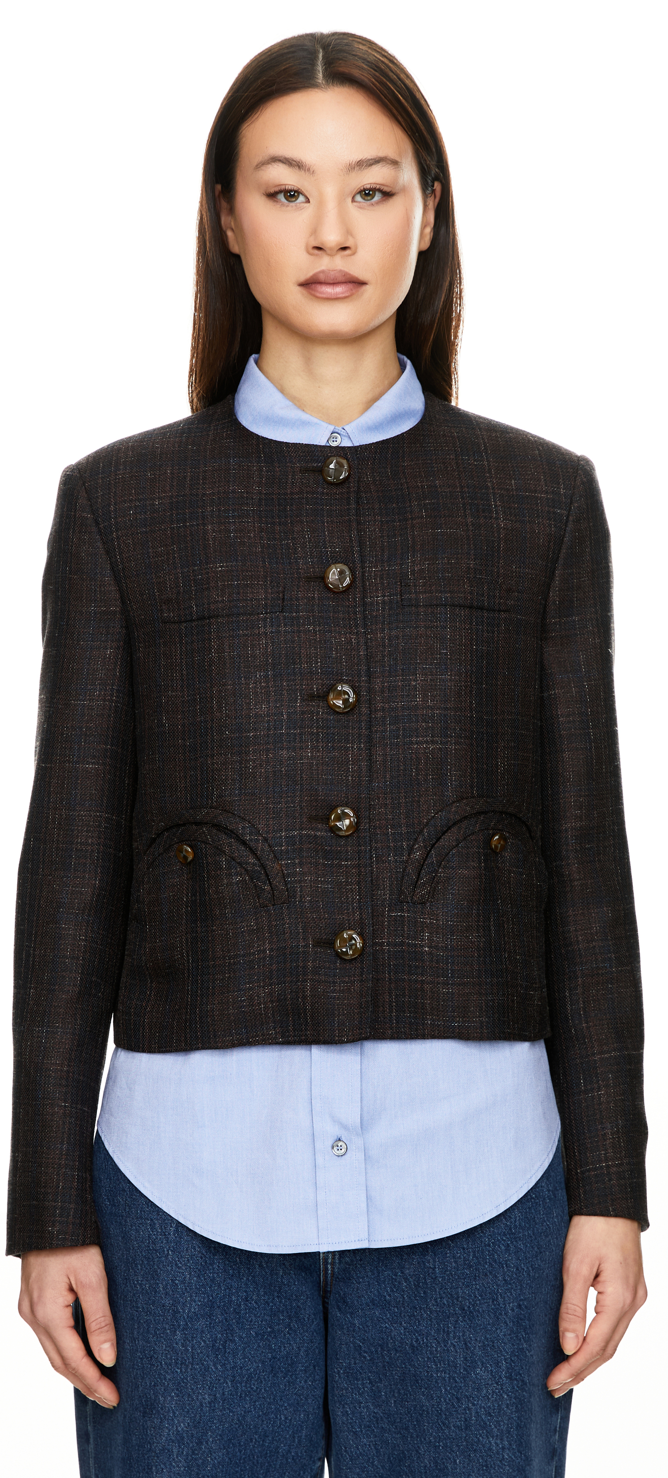 Der Bolero 'Askari Shamo' in Dunkelbraun von Blazé Milano wurde aus einer hochwertigen Woll-Seidenmischung gefertigt und besticht durch die verkürzte Oversize-Passform. Das Karomuster, die leicht gepolsterten Schultern, die aufgesetzten Smiley-Taschen sowie die Knöpfe in Schildpatt- und Lodenoptik runden das Modell stilvoll ab.