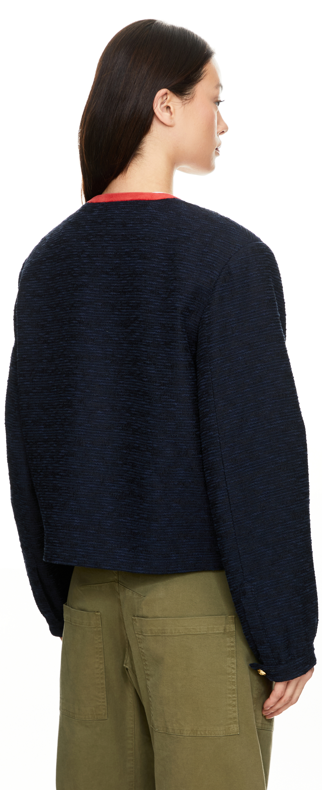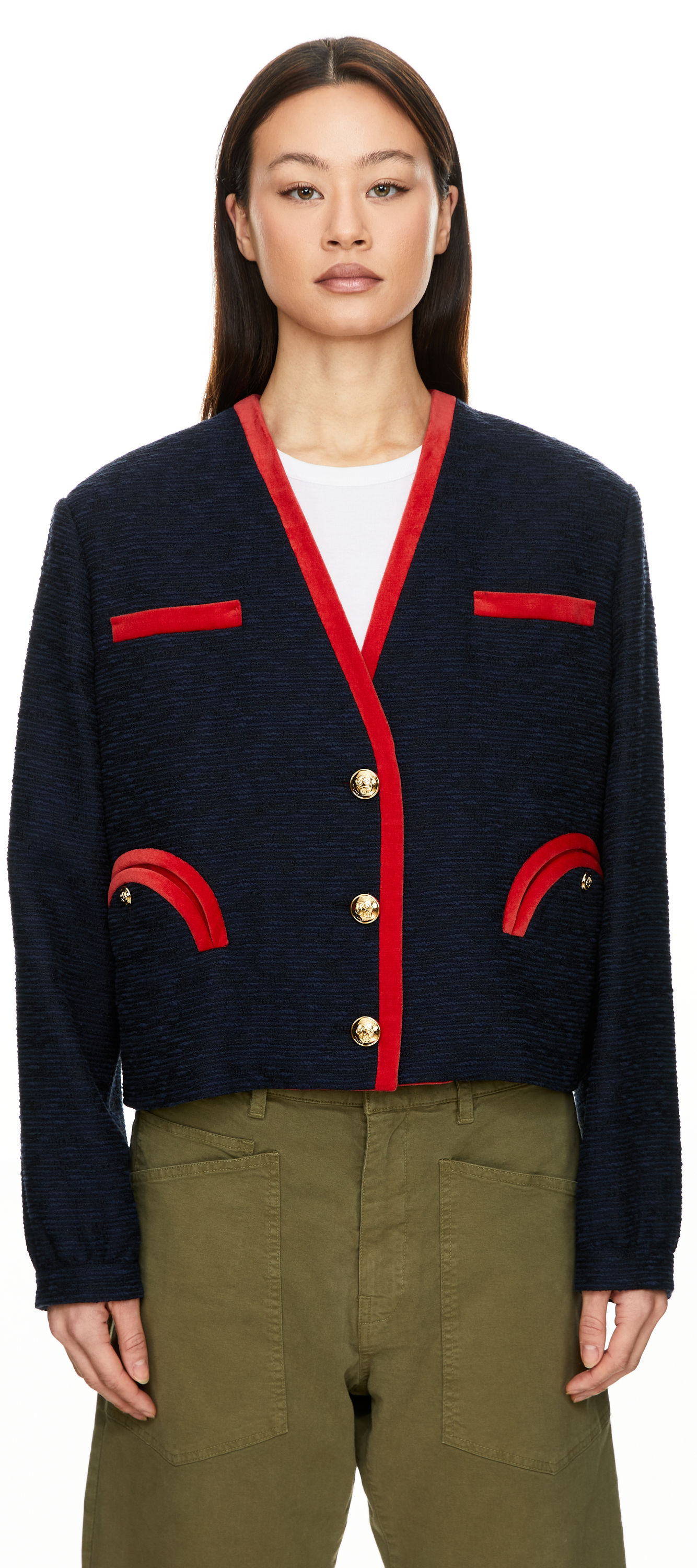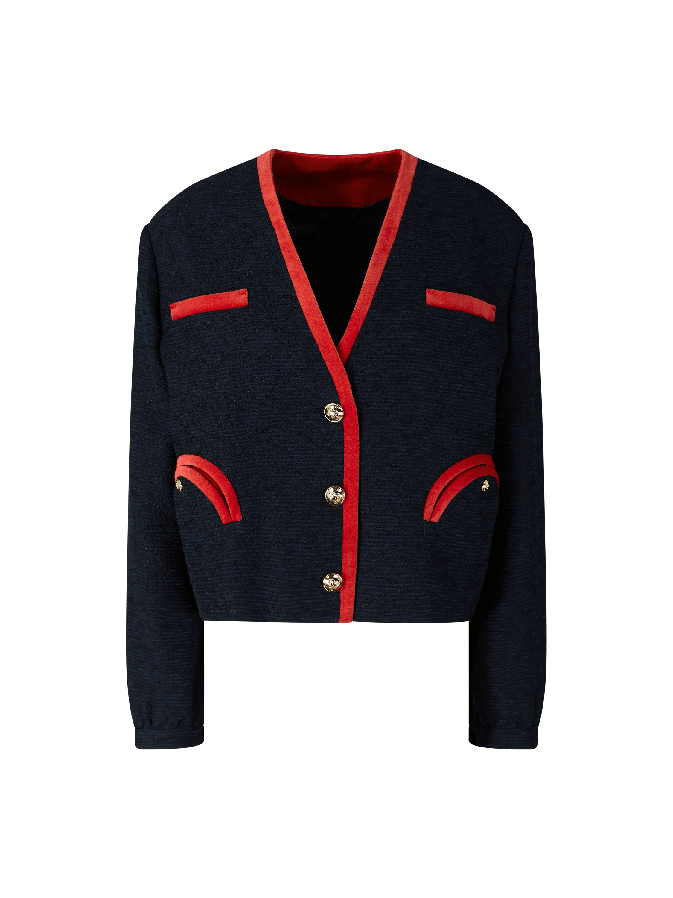 Der Bolero 'Esense Riviera' in Marineblau von Blazé Milano wurde aus einer Baumwollmischung gefertigt und besticht durch die kastige Passform. Der V-Ausschnitt, die roten Samtbesätze und die großen goldfarbenen Knöpfe mit geprägtem Logo sowie die aufgesetzten Taschen mit Smiley-Motivstilvoll ergänzt.