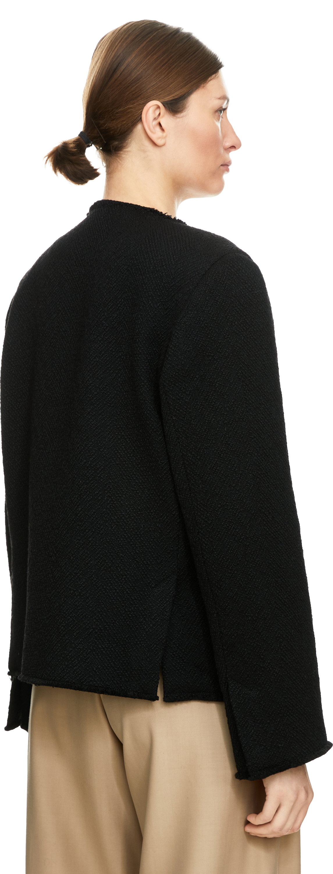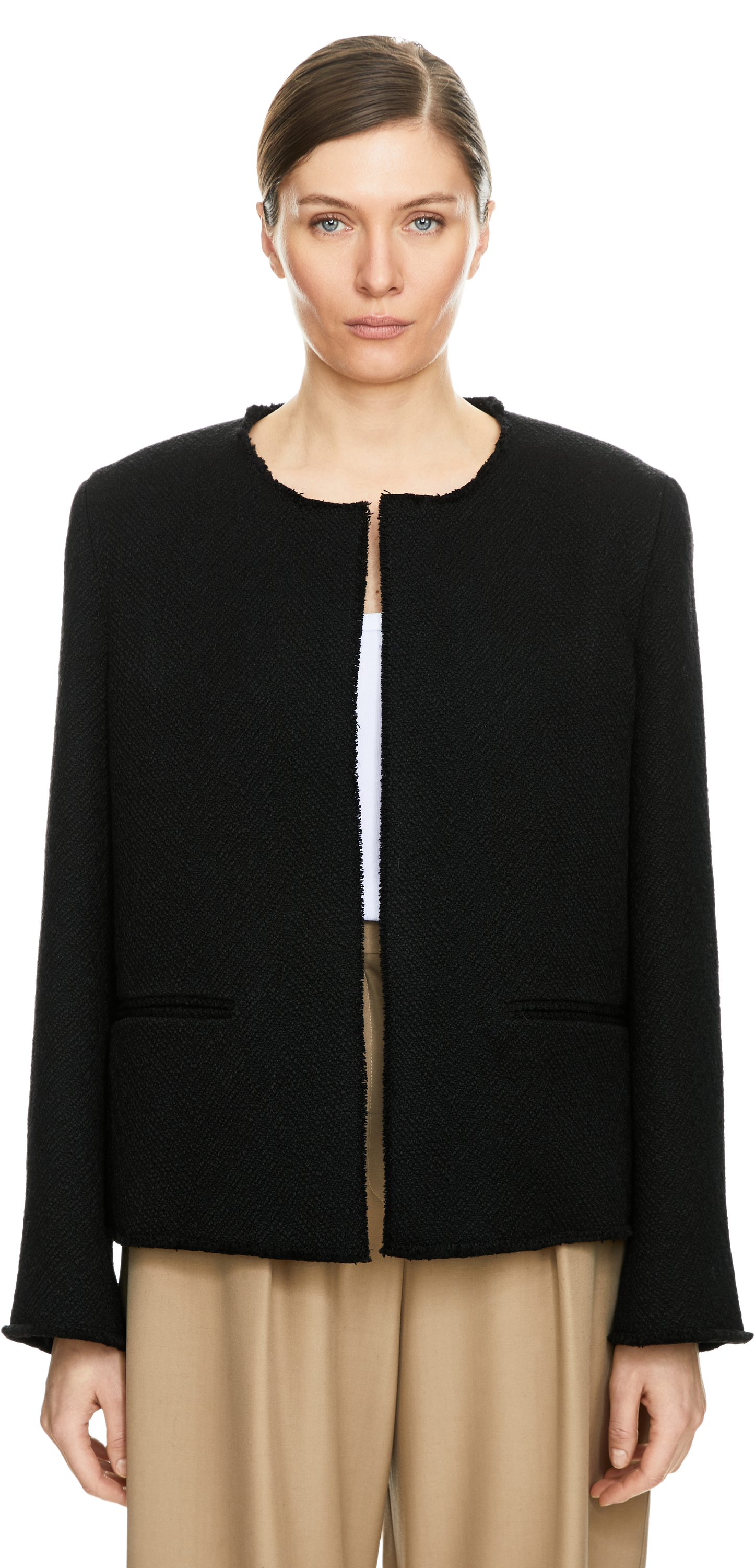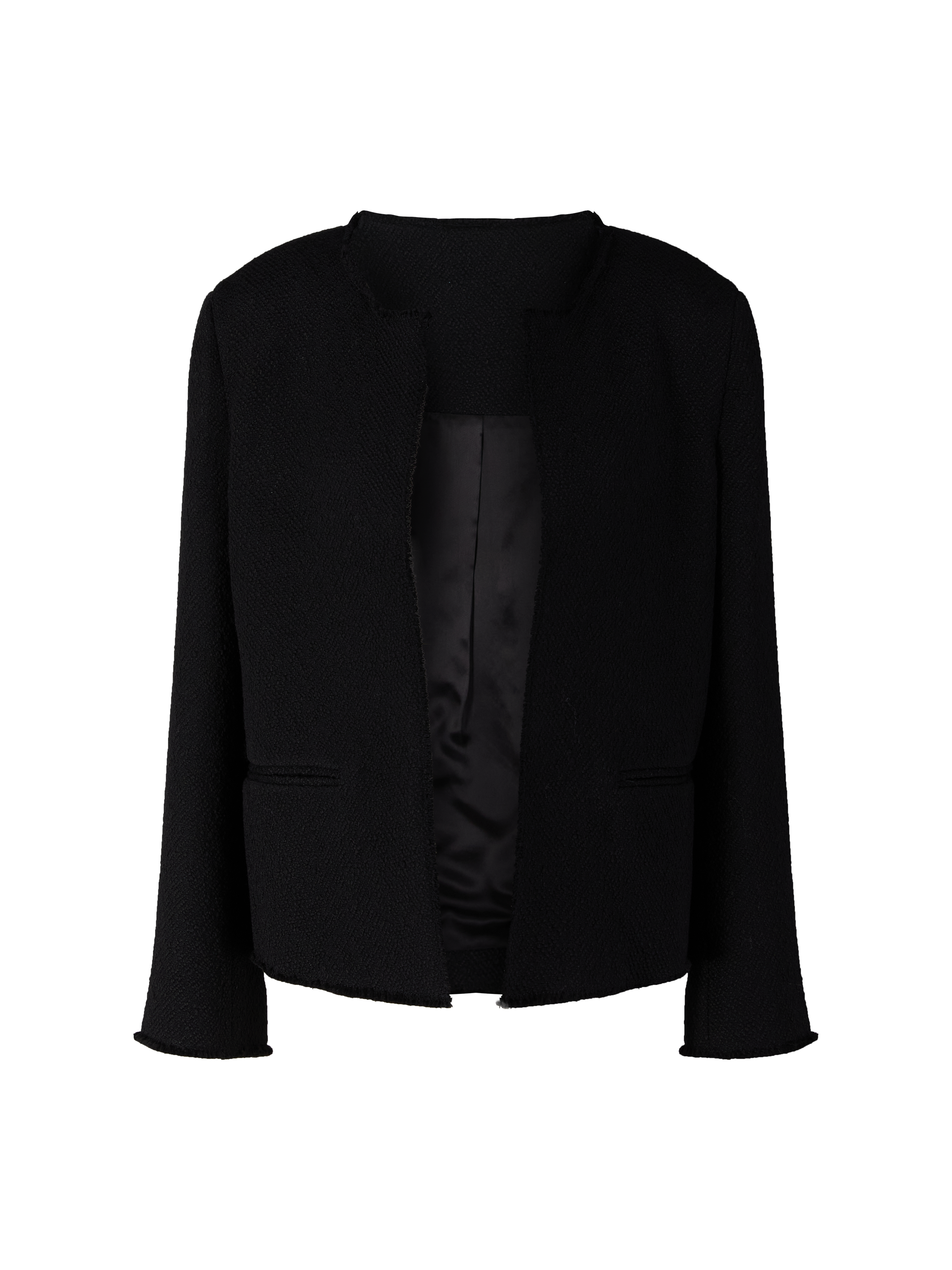 Dieser Blazer in Schwarz von TOTEME wurde aus einer Wollmischung gefertigt und besticht durch die kastenförmige Silhouette. Das strukturierte Bouclé, die Paspeltaschen auf der Vorderseite sowie die offenen Kanten verleihen dem Blazer eine moderne, elegante Note.