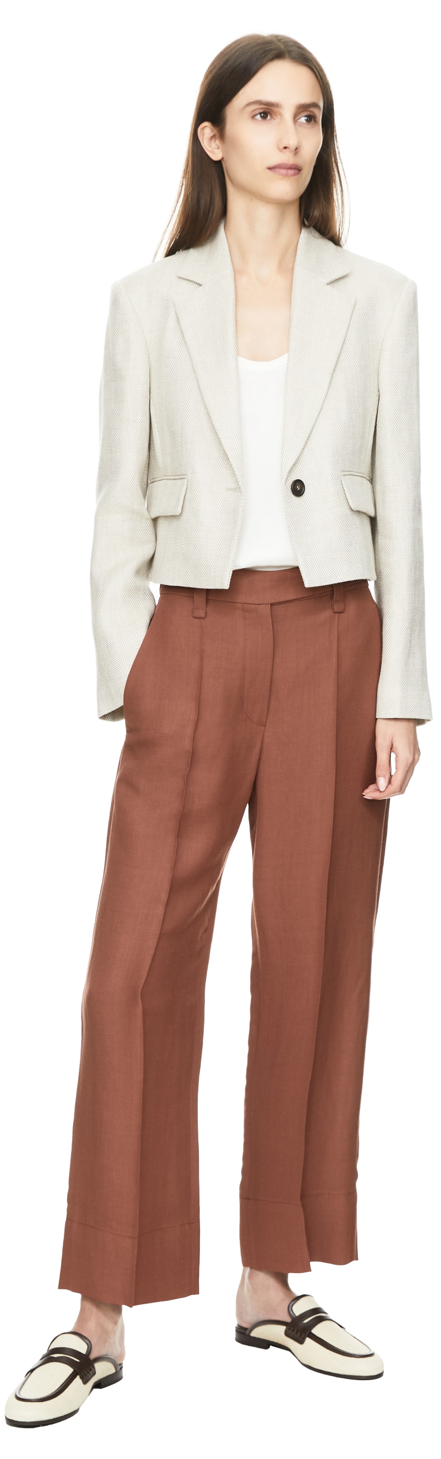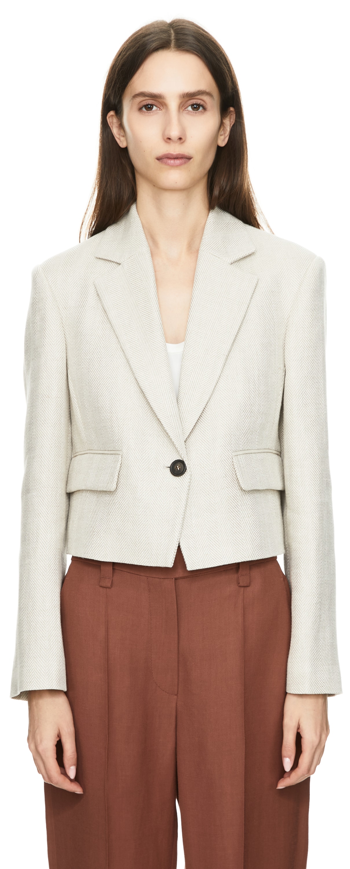 Dieser Blazer in Crème von Brunello Cucinelli wurde aus einer hochwertigen Leinenmischung gefertigt und besticht durch die strukturierte Optik und Haptik. Der klassische, verkürzte Schnitt, die Paspeltaschen und der steigende Reverskragen zeichnen dieses hochwertige Modell aus. Die Monili-Perlen am Nacken vollenden das moderne Design der Jacke.
