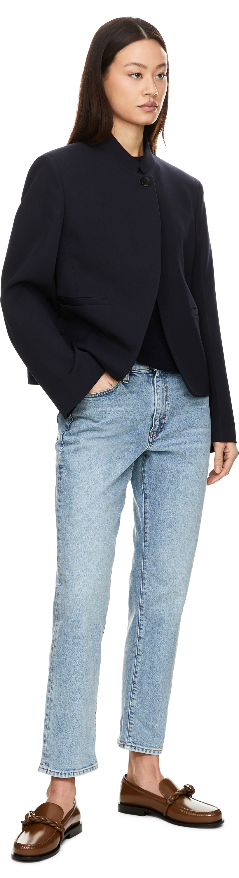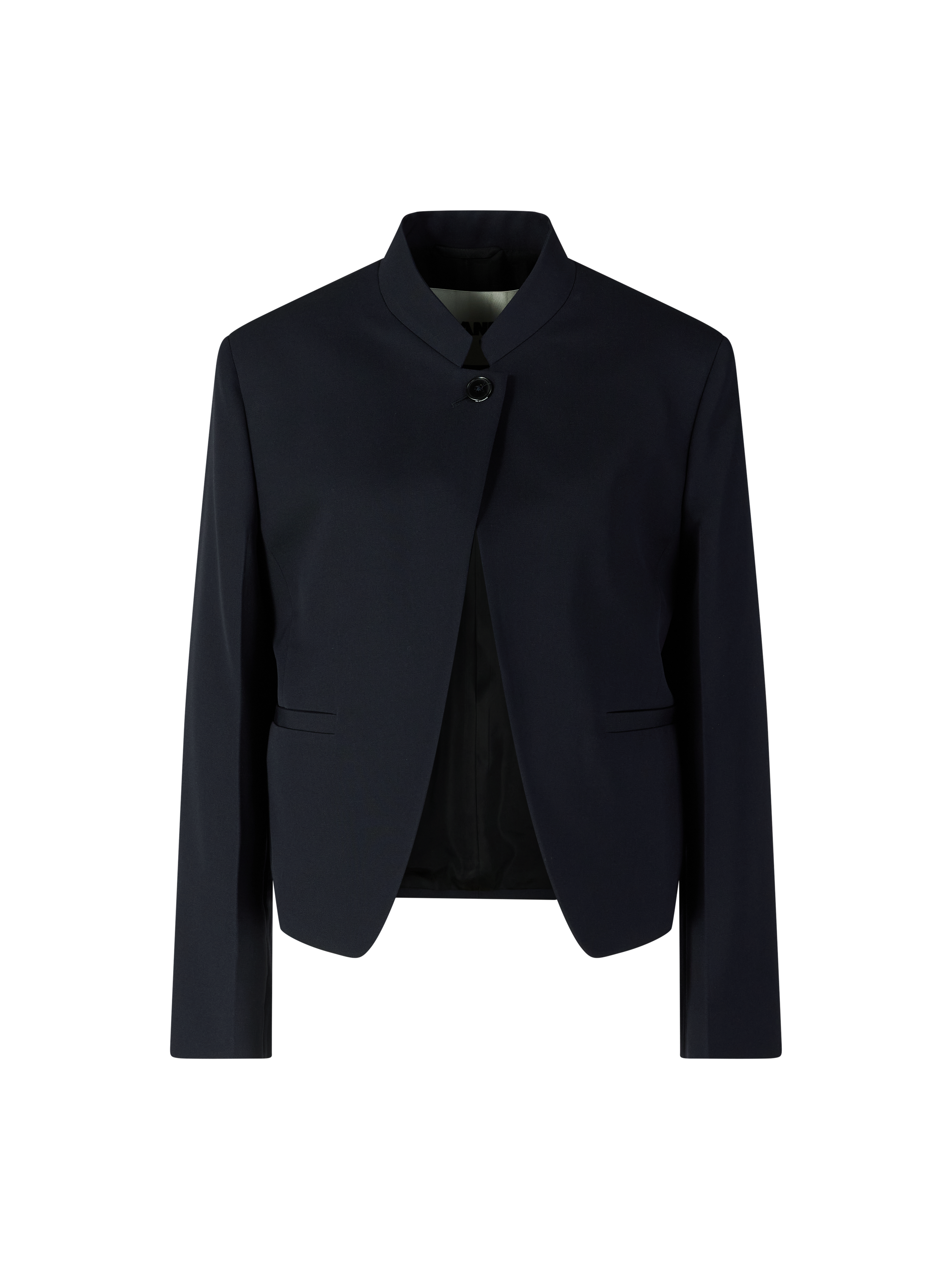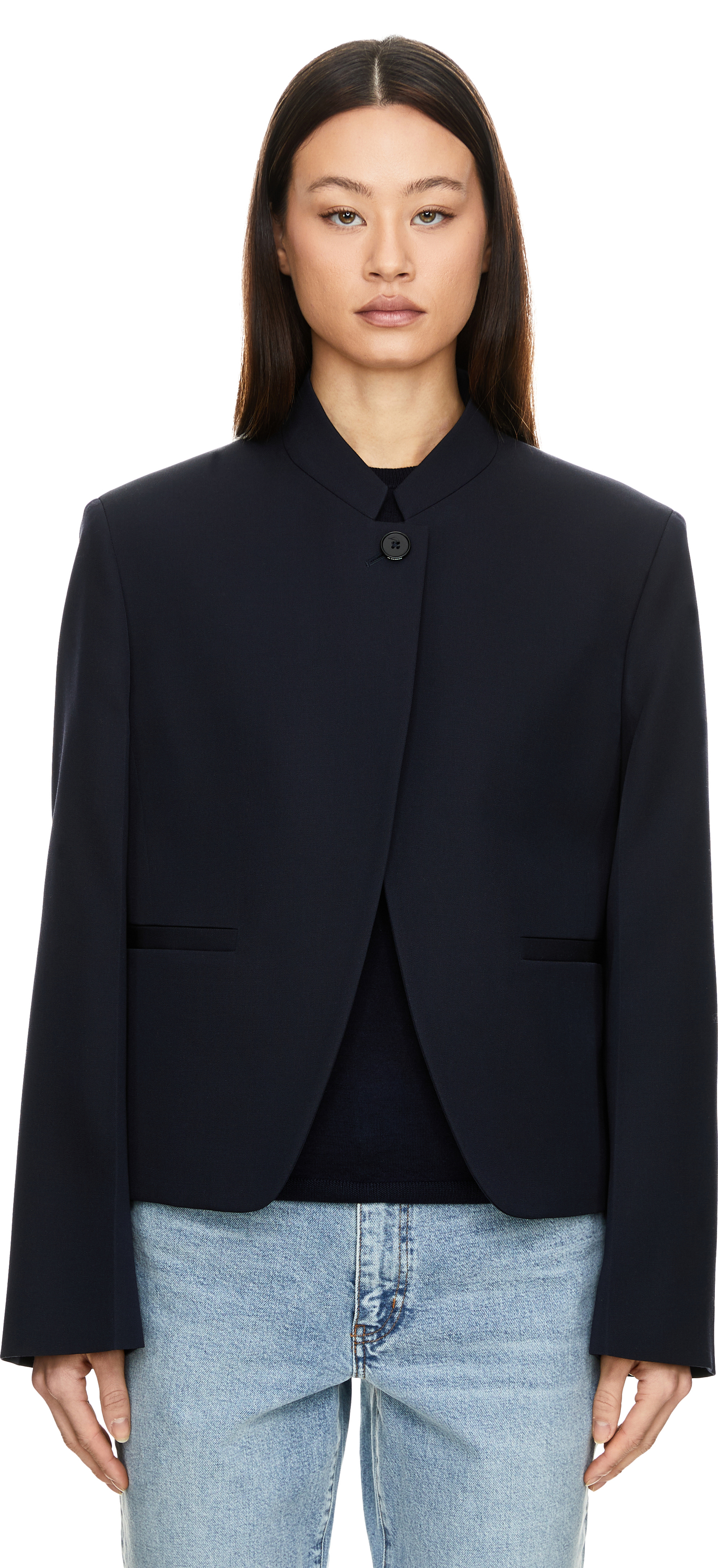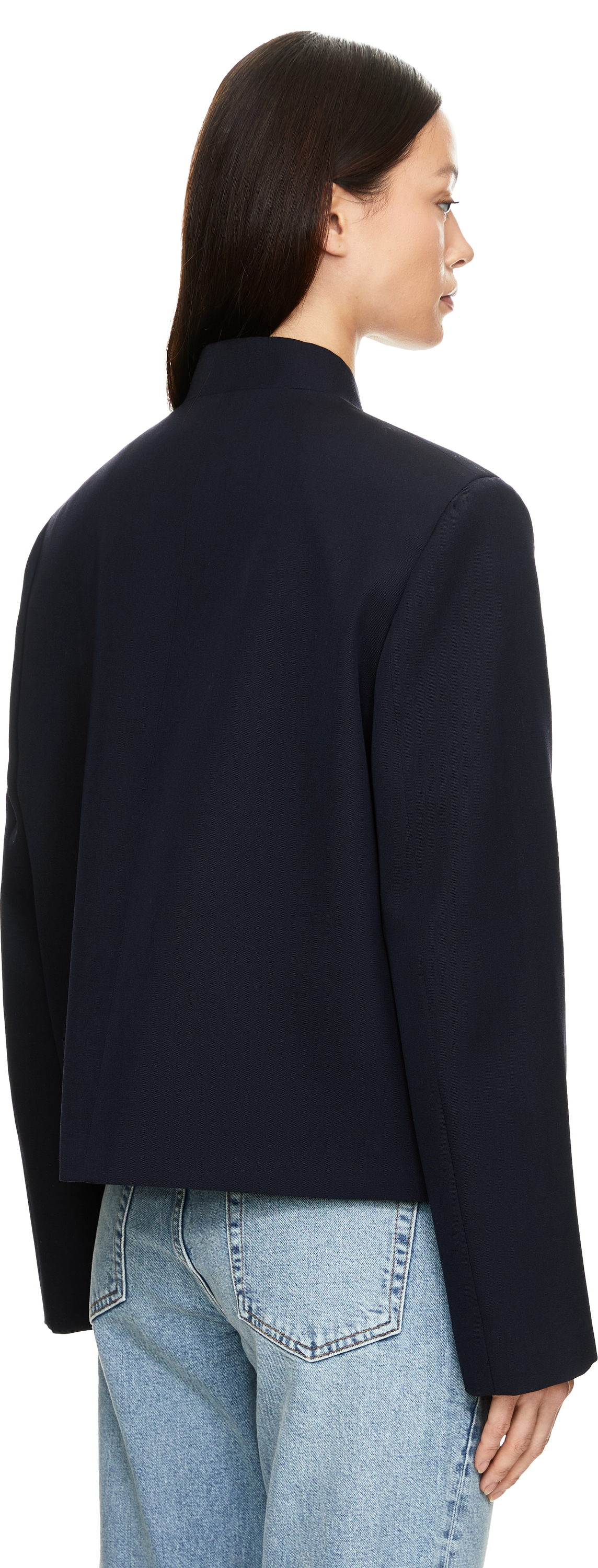 Dieser Blazer in Marineblau von JIL SANDER wurde aus hochwertiger Wolle gefertigt und besticht durch klare Linien. Der Mandarinkragen, die zwei vorderen Ziertaschen sowie der Knopfverschluss mit Logoprägung vollenden diesen stilvollen Hingucker.