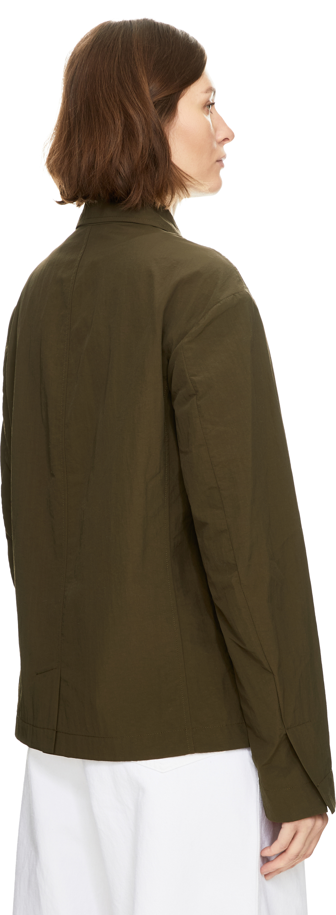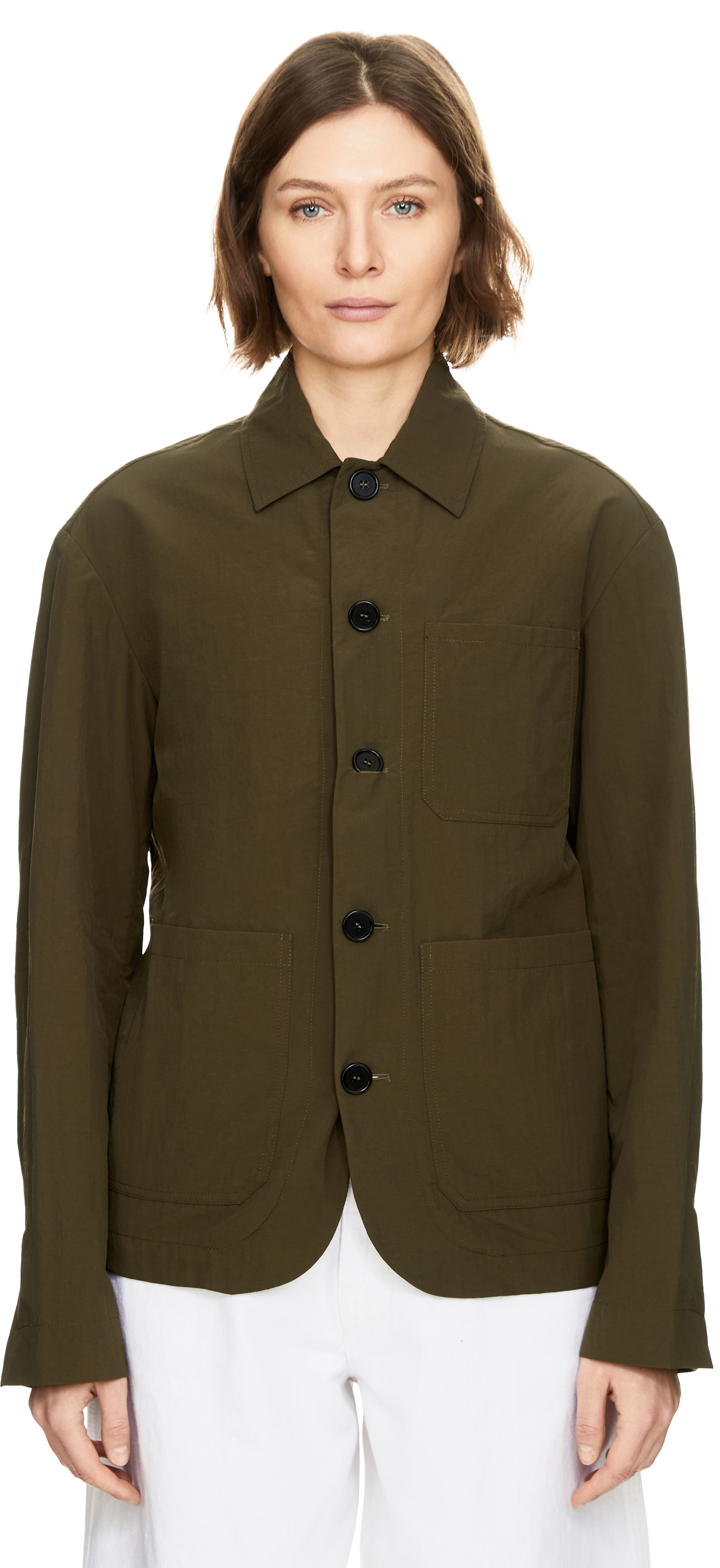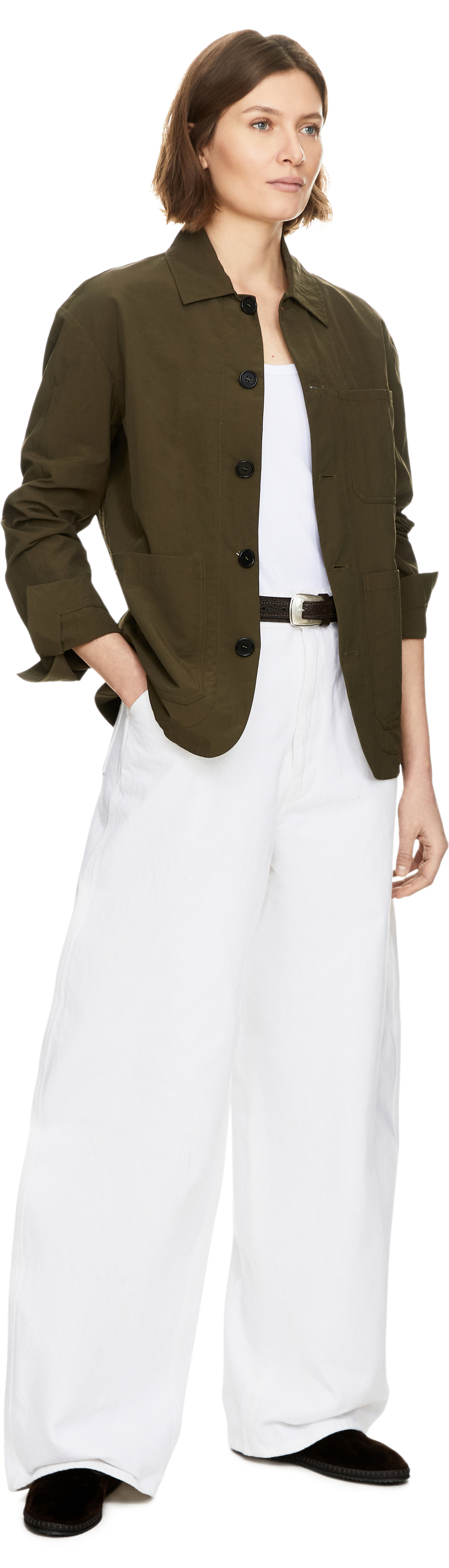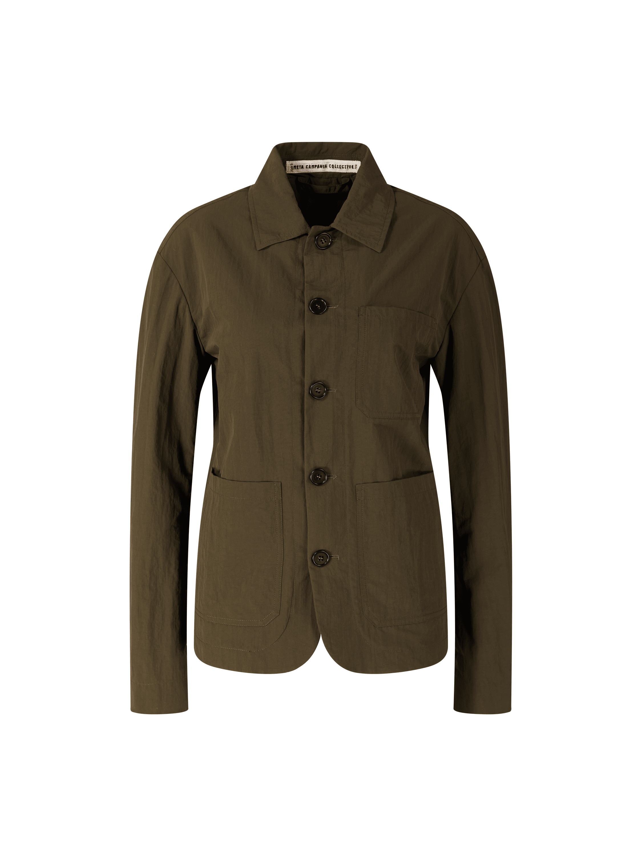Diese Hemdjacke 'Julian' in Olivgrün von META CAMPANIA COLLECTIVE wurde aus Bio-Baumwollpopeline gefertigt und besticht durch die lockere Passform. Die anliegenden, unstrukturierten Schultern, die große aufgesetzte Brusttasche sowie zwei weitere aufgesetzte Taschen an der Taille verleihen dem Modell einen charakteristischen Look. Das Monogramm-Intarsienmuster am linken Ärmel und die Zickzack Naht unter dem Kragen runden das hochwertige Design ab.