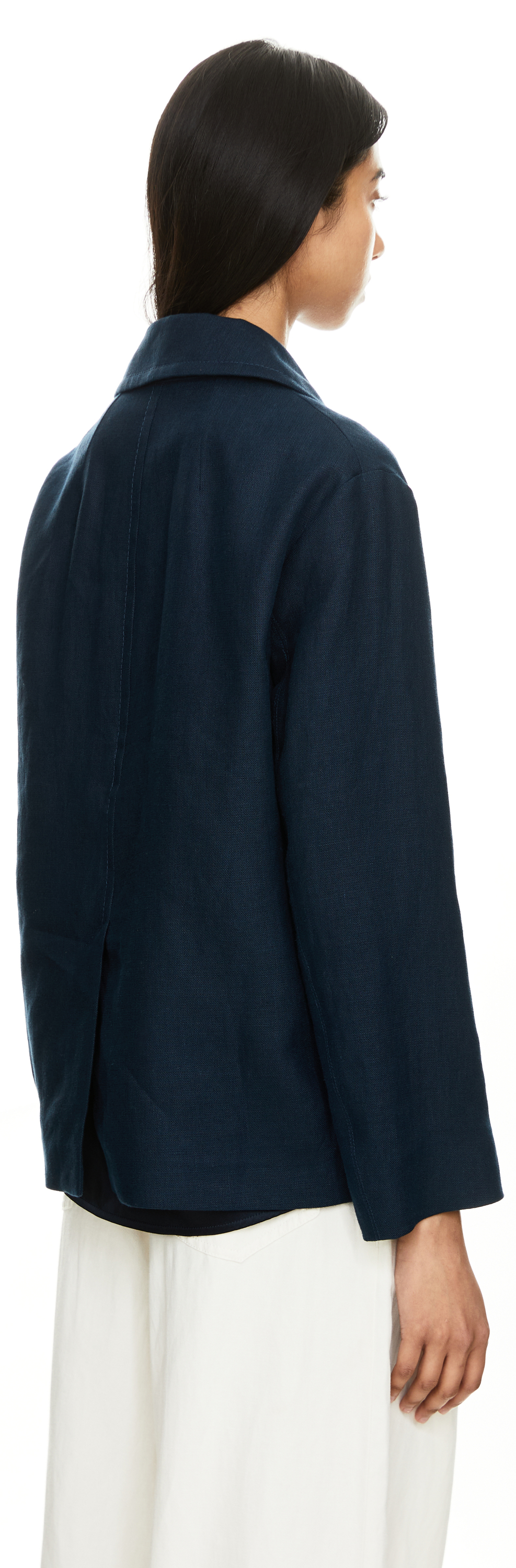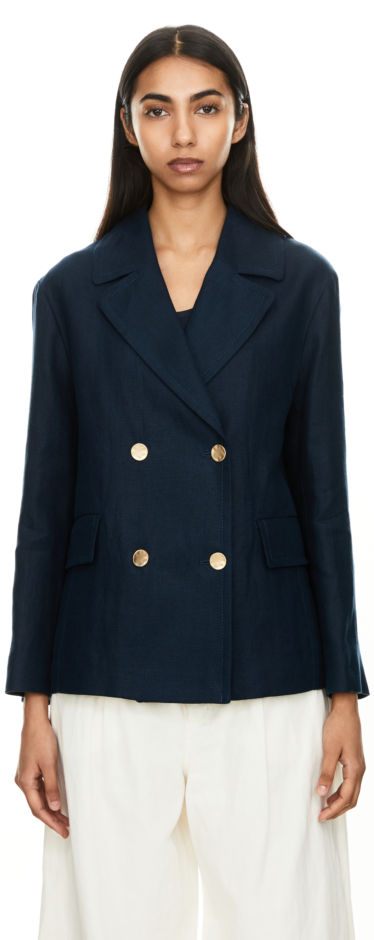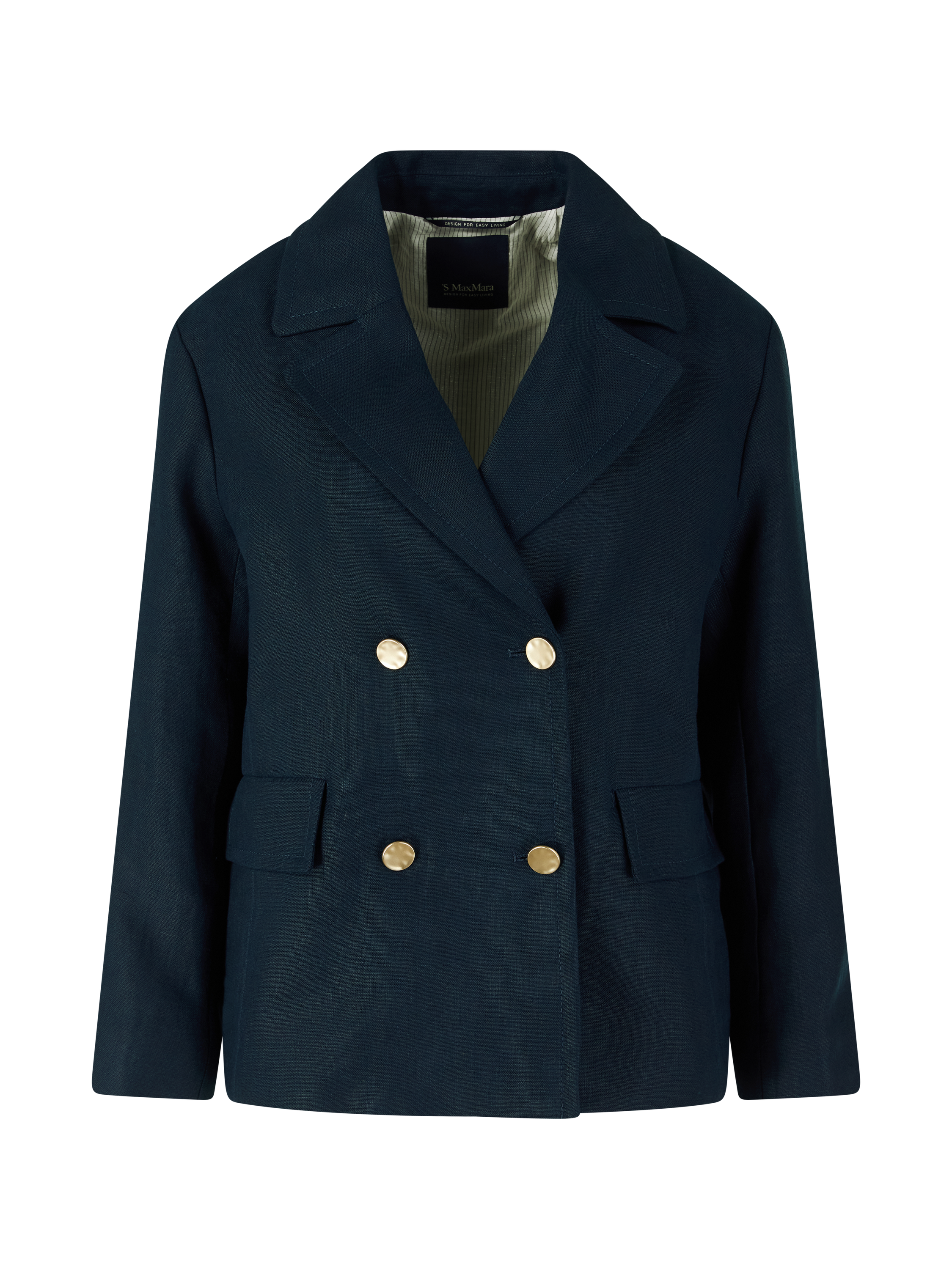 Der Blazer 'Avenue' in Marineblau von 'S Max Mara wurde aus hochwertigem Flachsleinen gefertigt und besticht durch die doppelreihige, goldfarbene Knopfleiste. Der lockere Schnitt mit Reverskragen sorgt für entspannte Eleganz, während Pattentaschen und ein rückseitiger Schlitz praktische Details setzen und die Silhouette stilvoll abrunden. Das hochwertige Flachsleinen ist besonders strapazierfähig, atmungsaktiv und sorgt mit seinen kühlenden Eigenschaften für ein angenehm leichtes Tragegefühl an warmen Tagen.