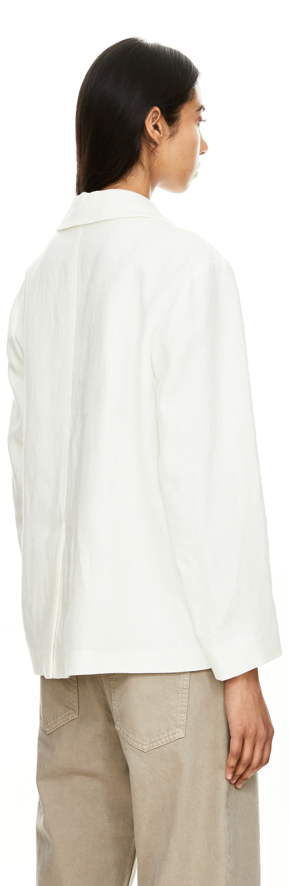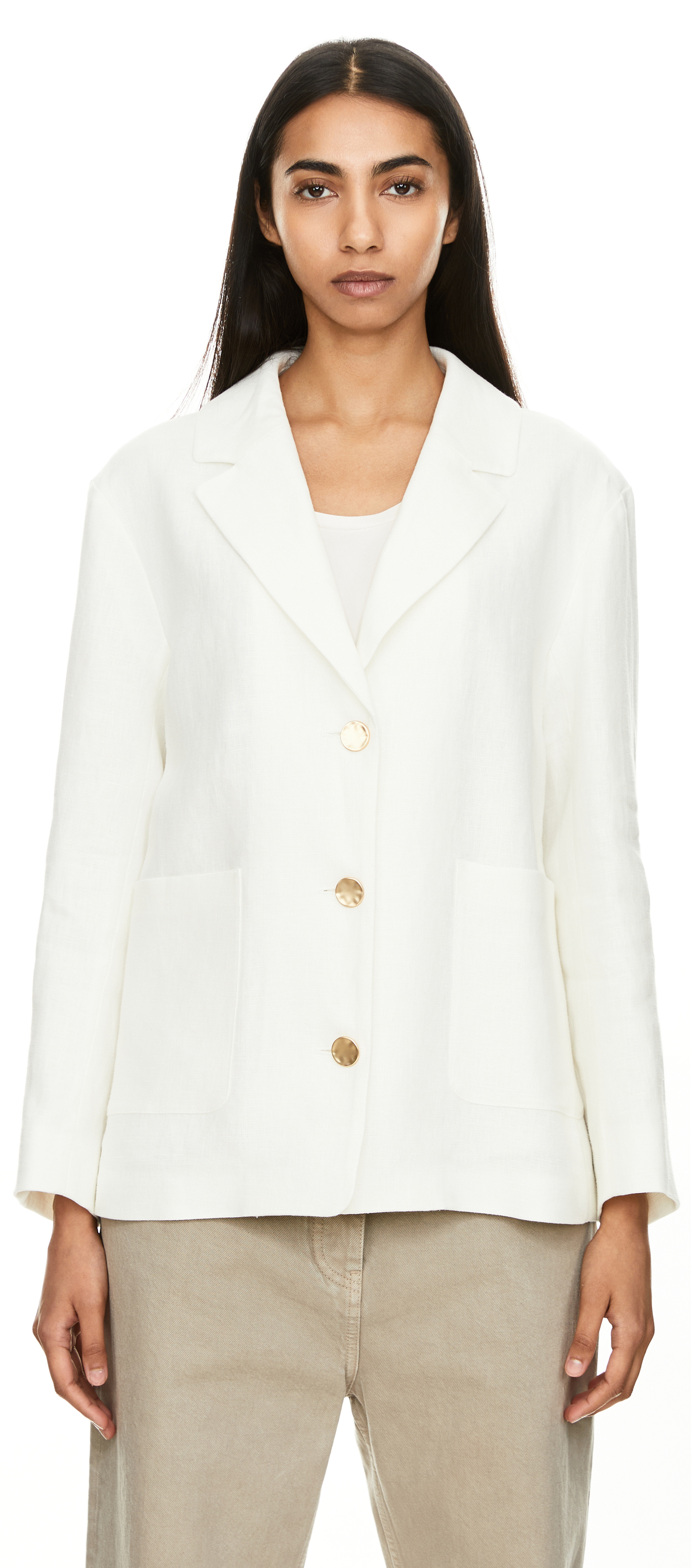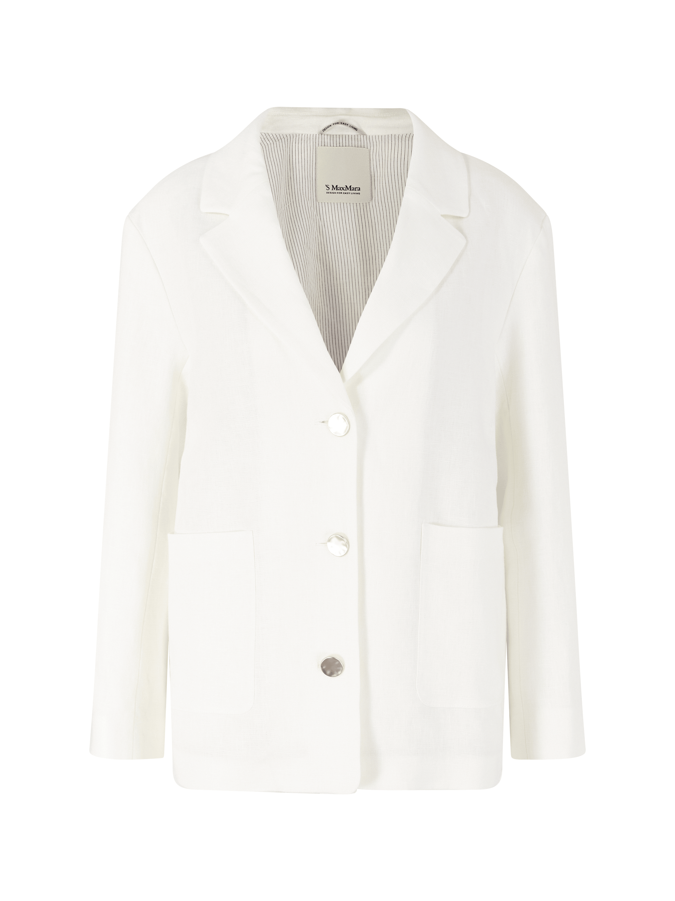 Der Blazer 'Carlotta' in Weiß von 'S Max Mara' wurde aus hochwertigem Flachsleinen gefertigt und besticht durch die markante goldfarbene Knopfleiste. Der lockere Schnitt mit Reverskragen sorgt für entspannte Eleganz, während aufgesetzte Taschen und ein rückseitiger Schlitz praktische Details setzen und die Silhouette stilvoll abrunden. Das hochwertige Flachsleinen ist besonders strapazierfähig, atmungsaktiv und sorgt mit seinen kühlenden Eigenschaften für ein angenehm leichtes Tragegefühl an warmen Tagen.