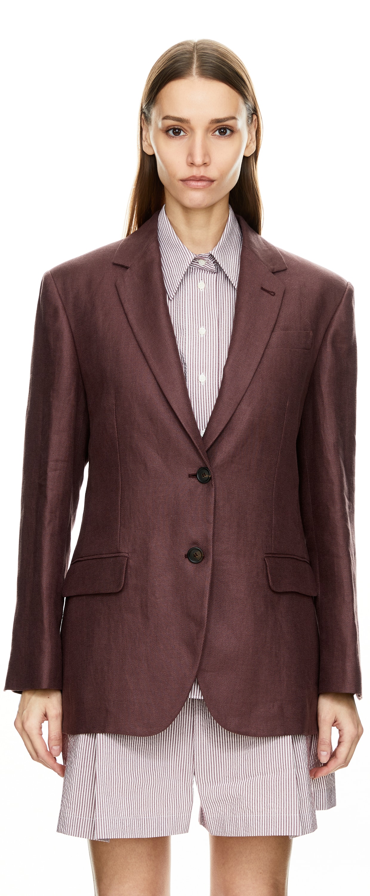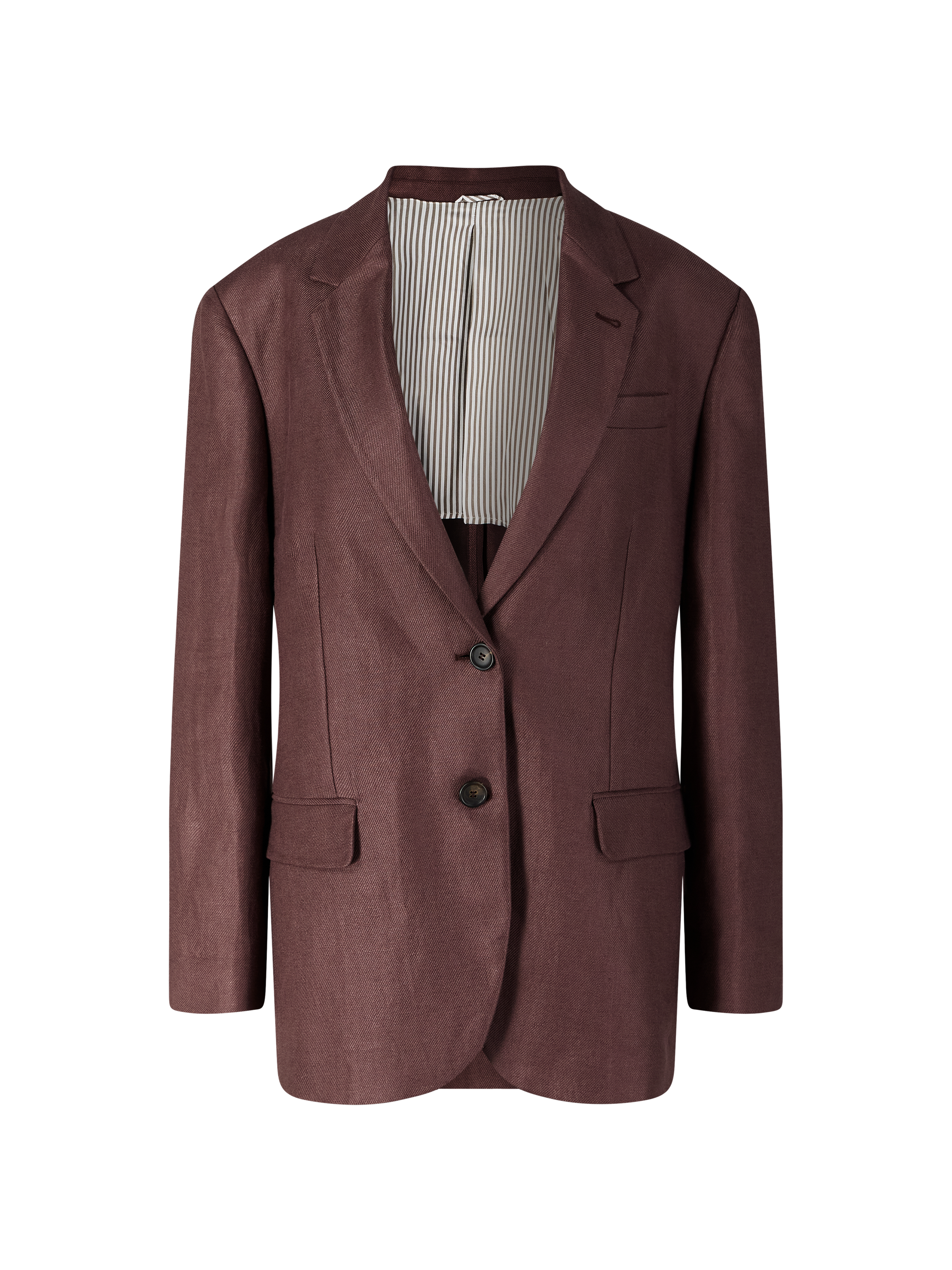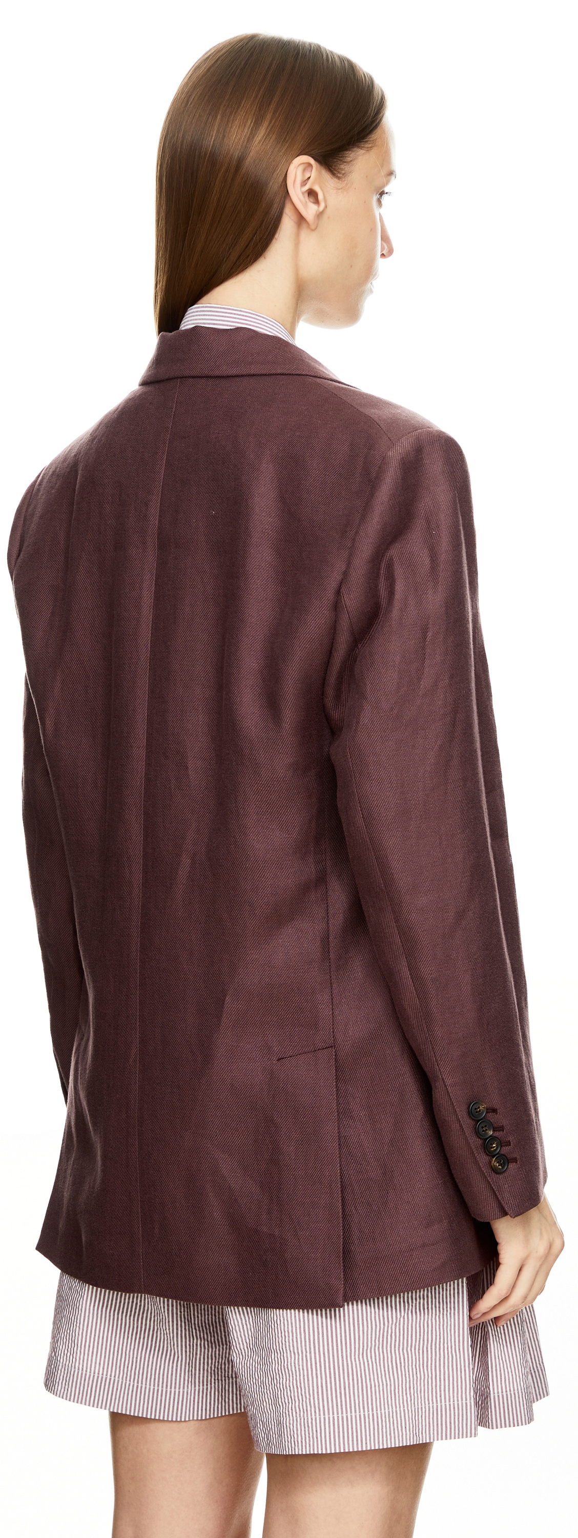 Dieser Blazer in Bordeaux von Brunello Cucinelli wurde aus reinem Leinen gefertigt und besticht durch die Monili-Perlen um den Kragen. Das Modell wird durch die einreihige Knopfleiste, den abfallenden Reverskragen und die zwei Pattentaschen perfekt ergänzt und zeichnet sich durch seine elegante Ausführung aus.