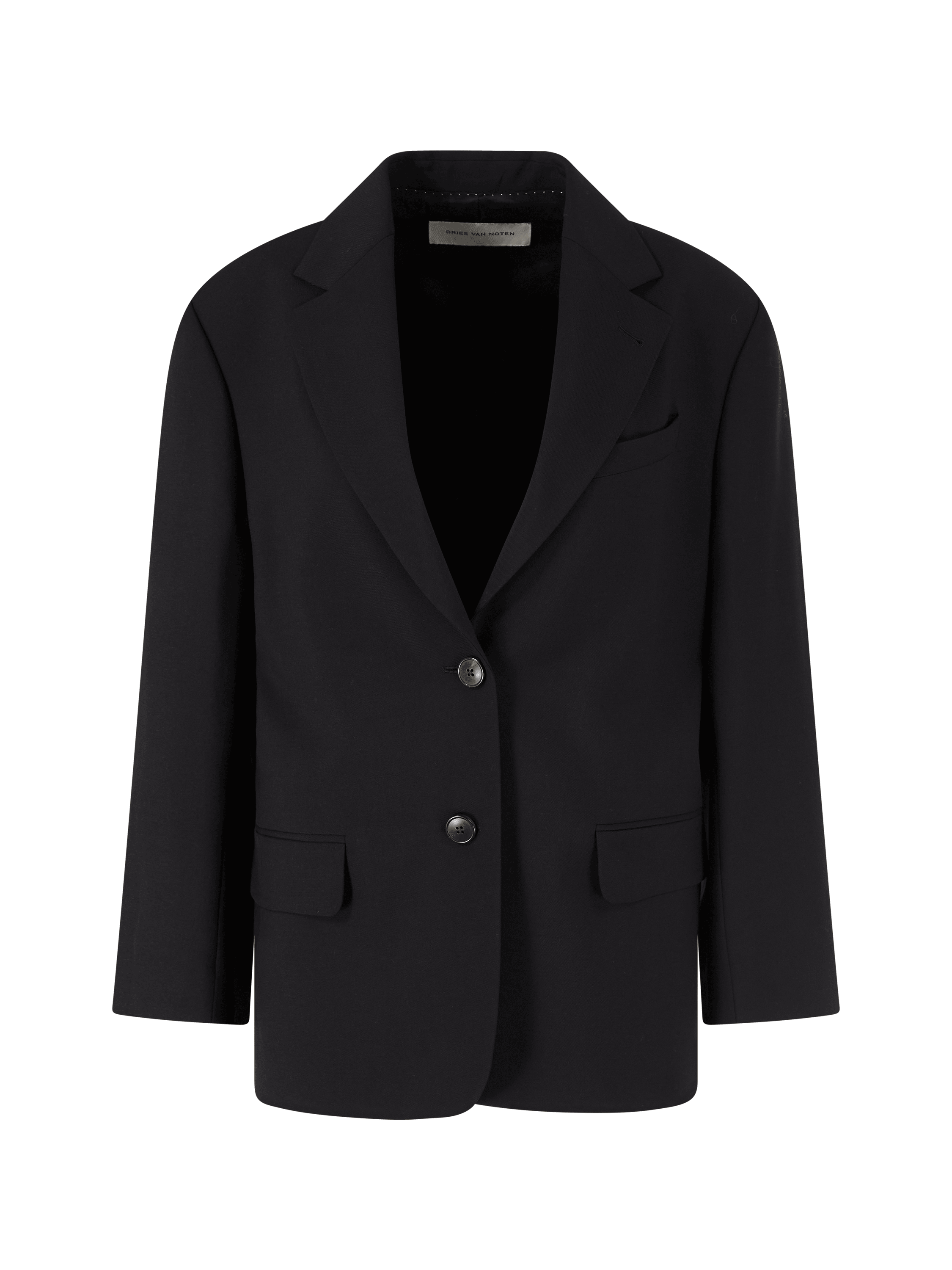 Der Blazer 'Birdy' in Schwarz von Dries van Noten wurde aus einer hochwertigen Woll-Mohair-Mischung gefertigt und besticht durch die lockere Passform. Die zwei Knöpfe auf der Vorderseite, die Pattentaschen sowie der Rückenschlitz verleihen dem Look einen casual-eleganten Look.