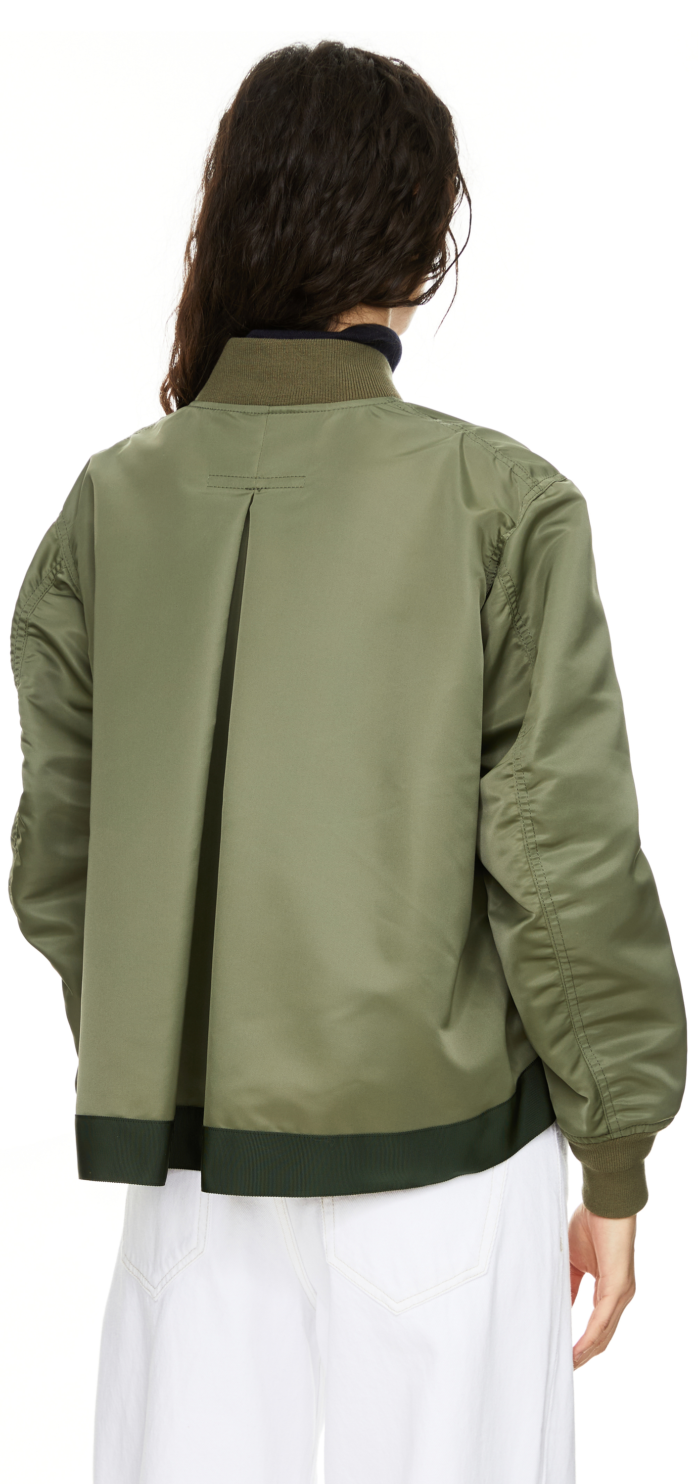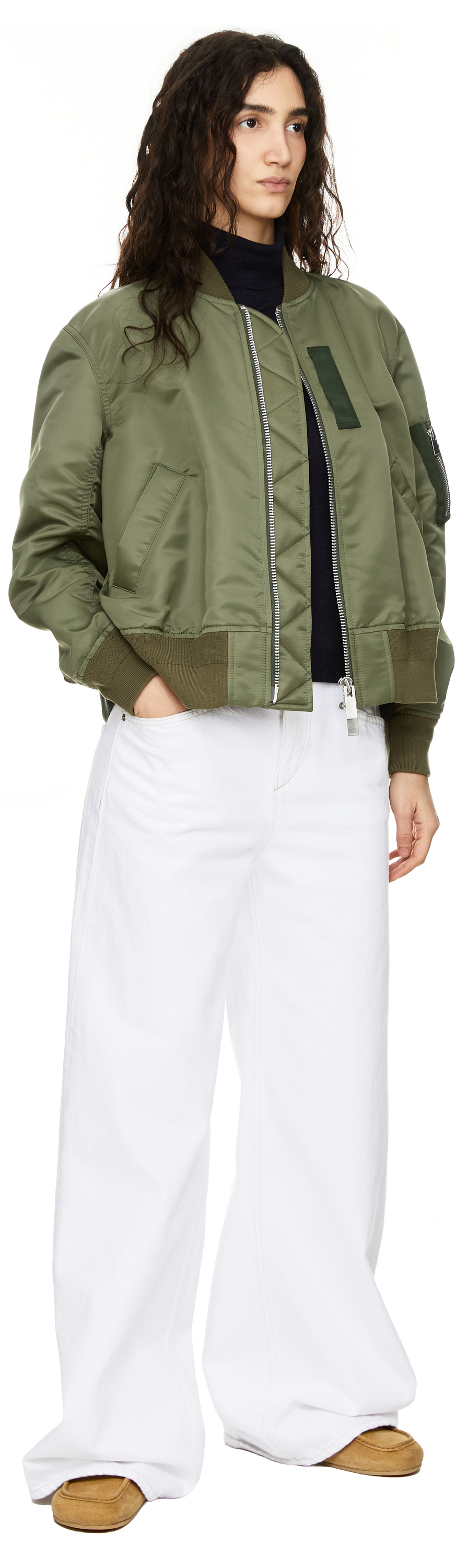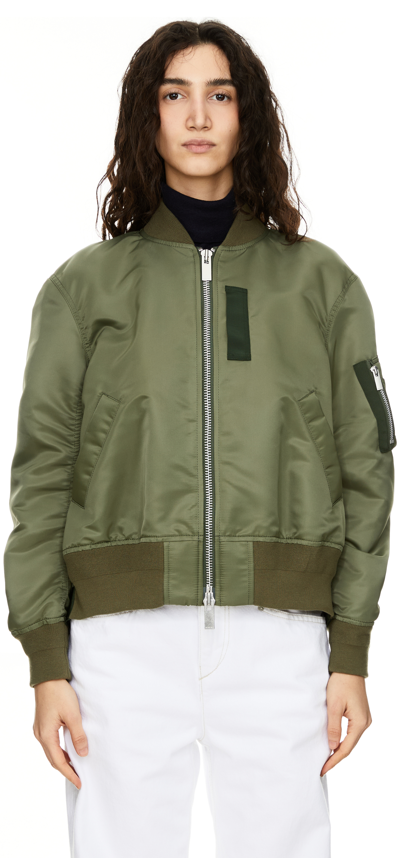 Diese Bomberjacke in Khaki von Sacai wurde aus technischem Nylon-Twill gefertigt und besticht durch die Oversize-Passform. Die gerippten Abschlüsse, die Ärmeltasche sowie die Paspeltaschen vollenden den modernen Look. Der Zwei-Wege-Reißverschluss und der schmale Stehkragen zeichnen dieses Modell aus.