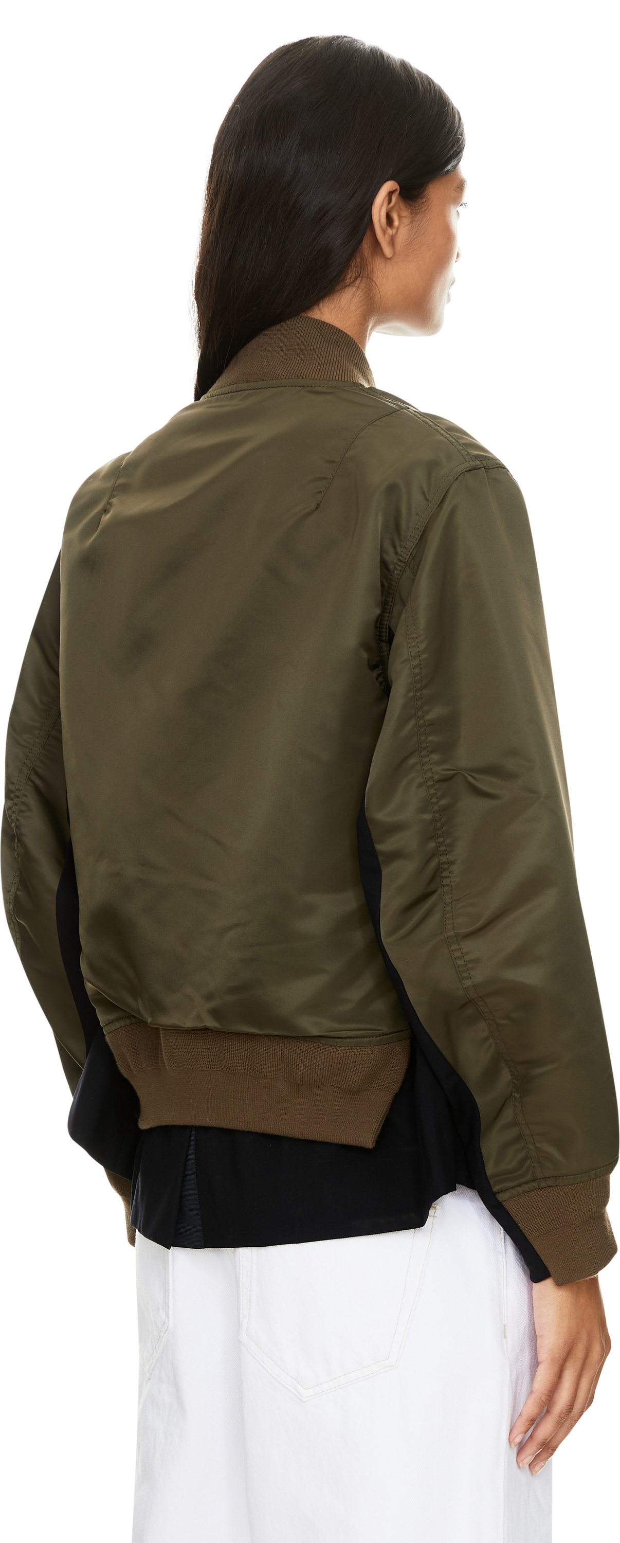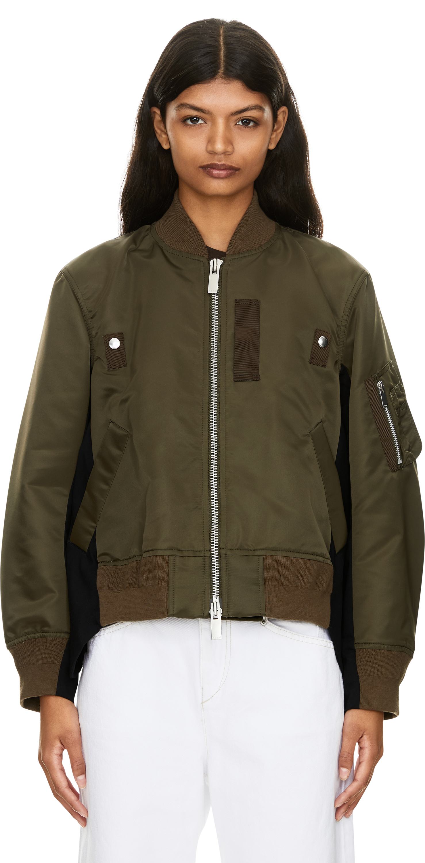 Diese Bomberjacke in Khaki von Sacai wurde aus einer hochwertigen Materialmischung gefertigt und besticht durch den charakteristischen Layering-Look. Die Rippstrickabschlüsse sowie die zwei Leistentaschen vollenden den modernen Look. Der silberfarbene Zwei-Wege-Reißverschluss und der schmale Stehkragen zeichnen dieses Modell aus.