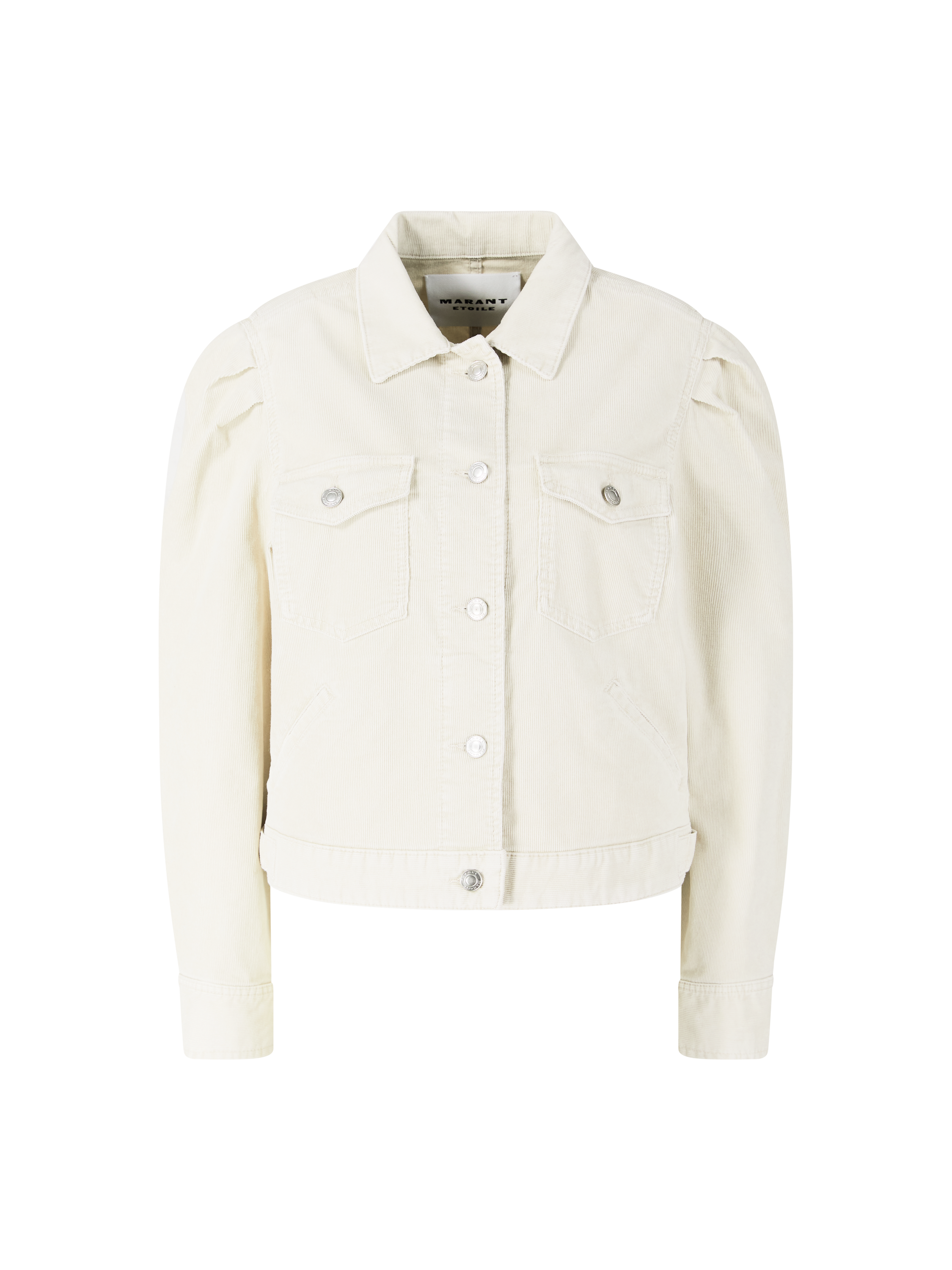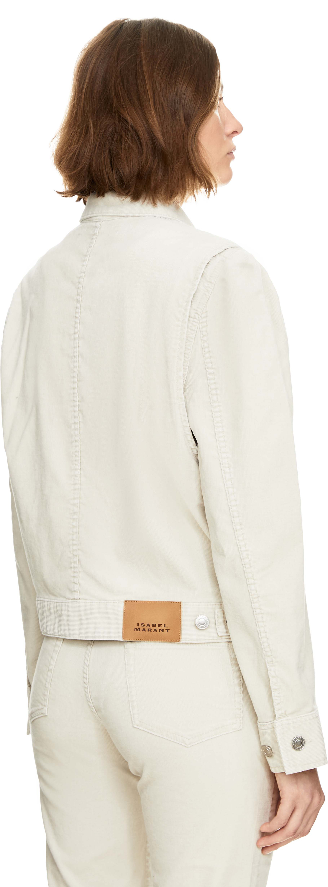 Die Cordjacke 'Bolineav' in Crème von Marant Étoile wurde aus einer Baumwollmischung gefertigt und besticht durch den Workwear-Stil. Der Hemdkragen, der durchgehende Knopfverschluss mit Logoprägung, die plissierten Schultern, die zwei aufgesetzten Brusttaschen mit geknöpften Patten sowie die Reglantaschen an den Seiten verleihen diesem hochwertigen Modell seinen charakteristischen Look.