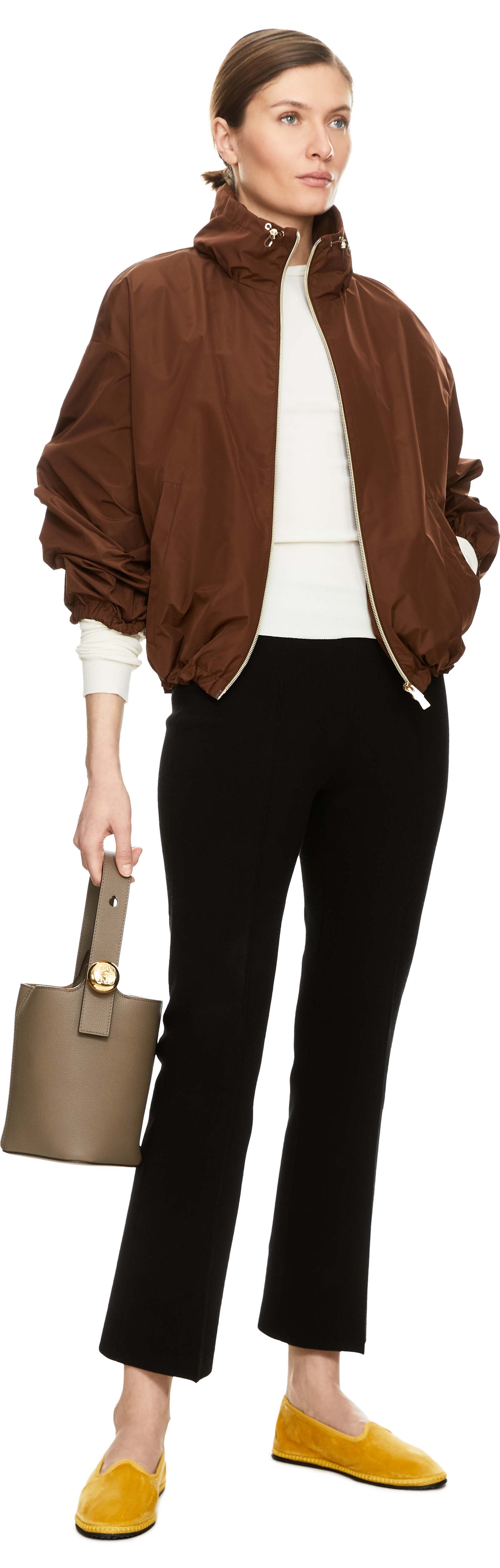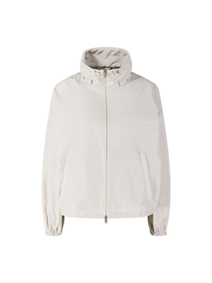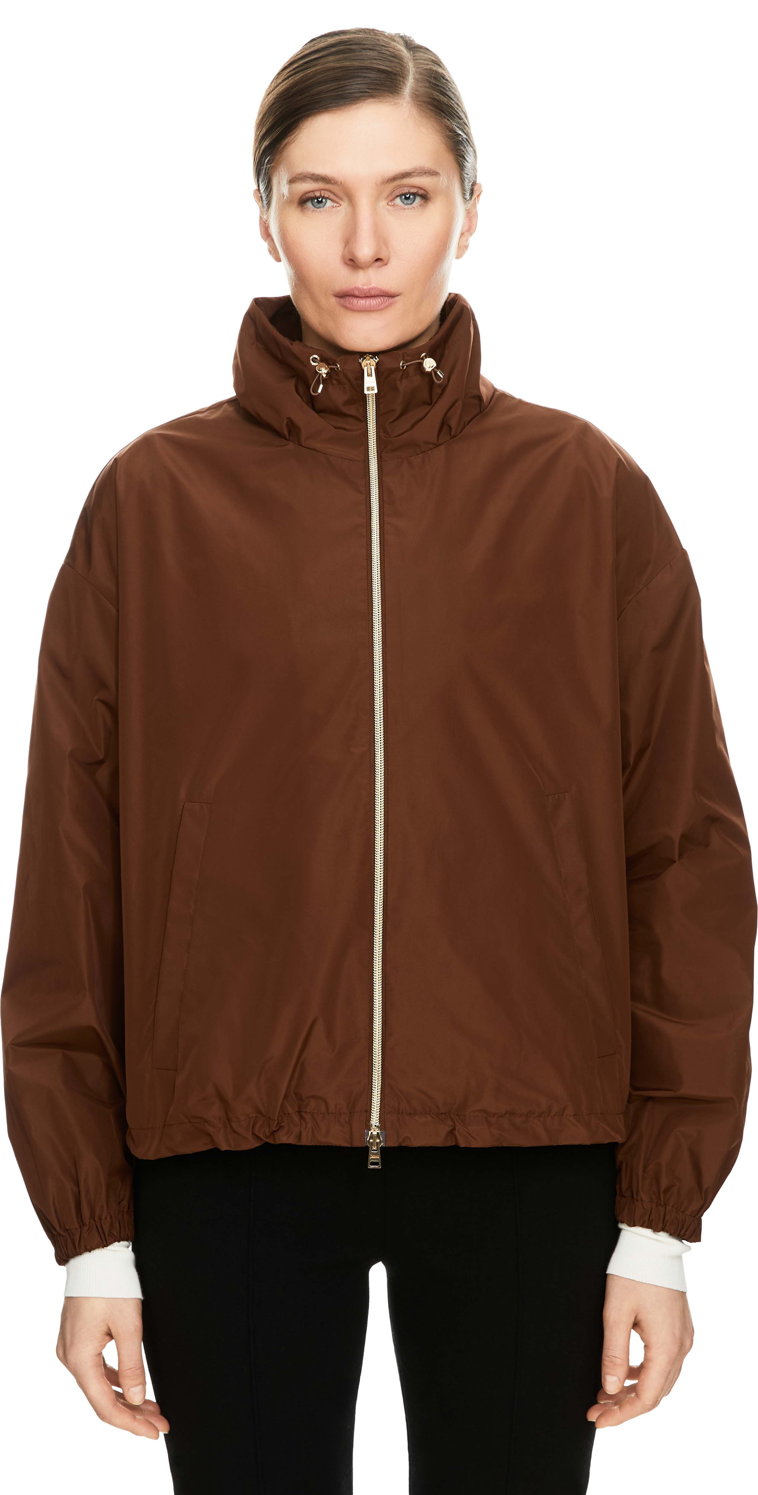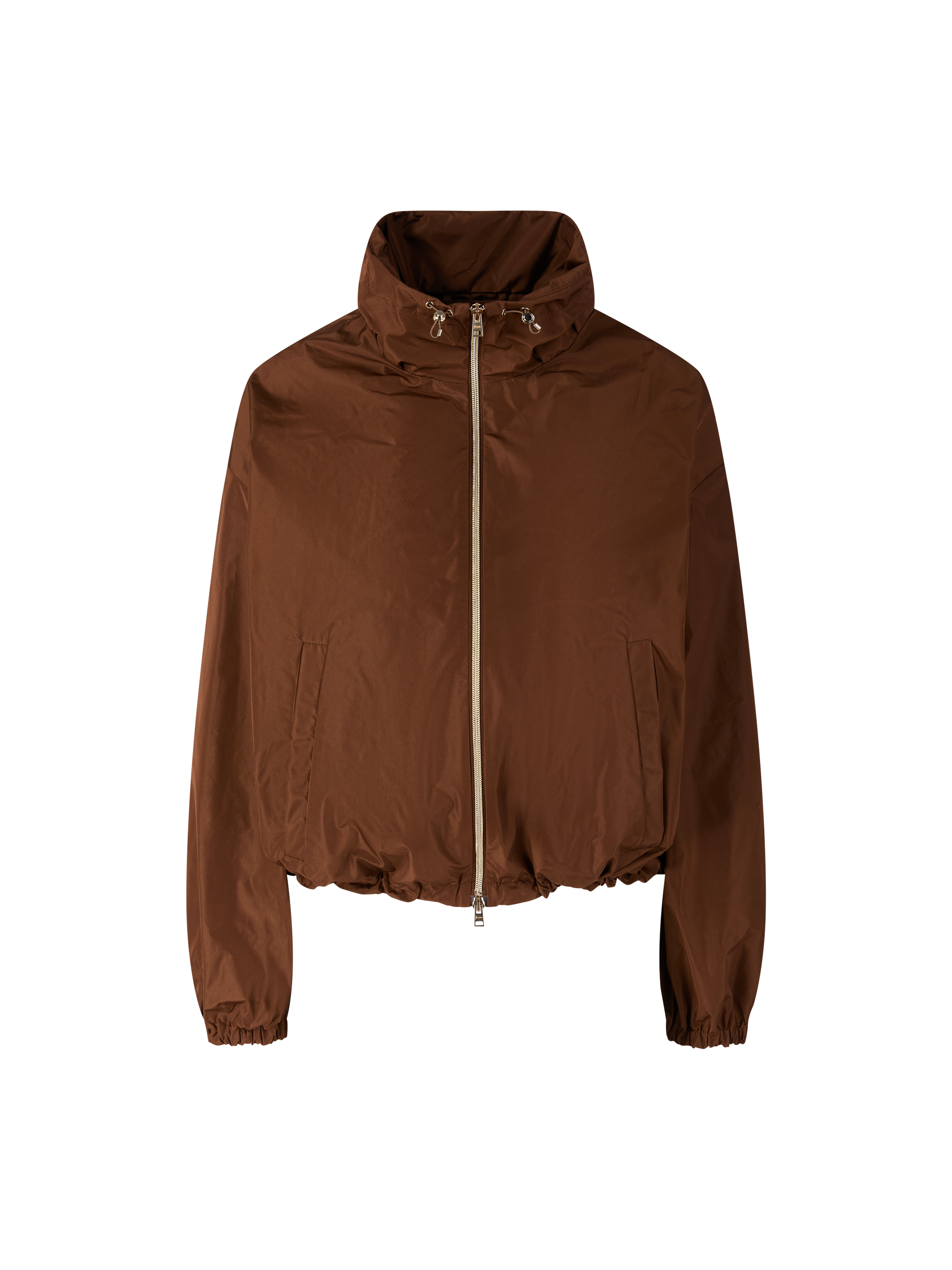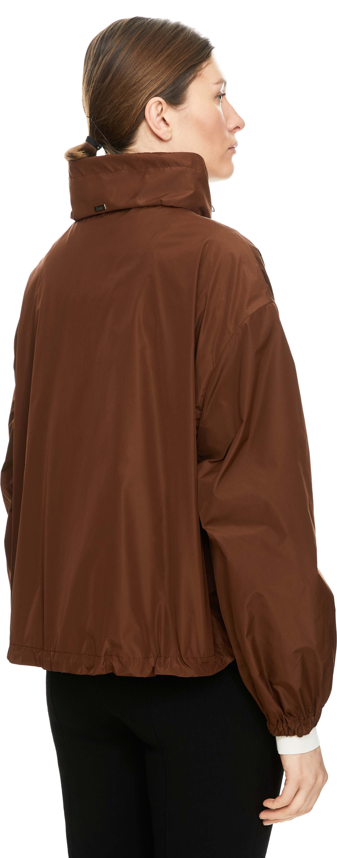 Diese Jacke in Braun von Herno wurde aus leichtem Material gefertigt und besticht durch das sportive Design. Der Stehkragen mit Tunnelzug sowie der von innen verstellbare Saum sorgen für individuellen Tragekomfort. Die verlängerte Schulterpartie in Kombination mit der lockeren Passform unterstreicht den modernen Look. Ein metallisches Label an der Rückseite des Kragens setzt einen dezenten Akzent und rundet das Modell hochwertig ab.