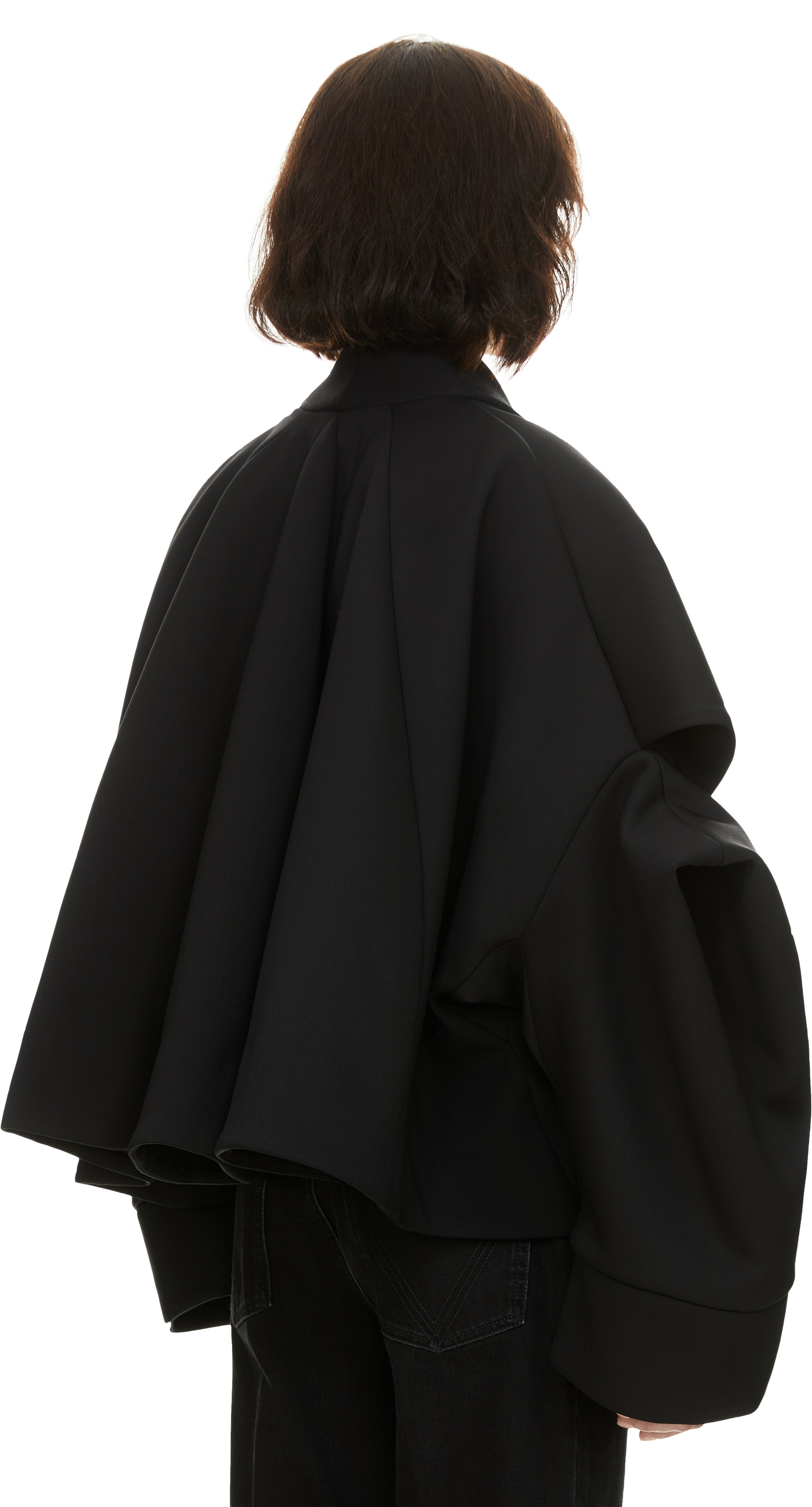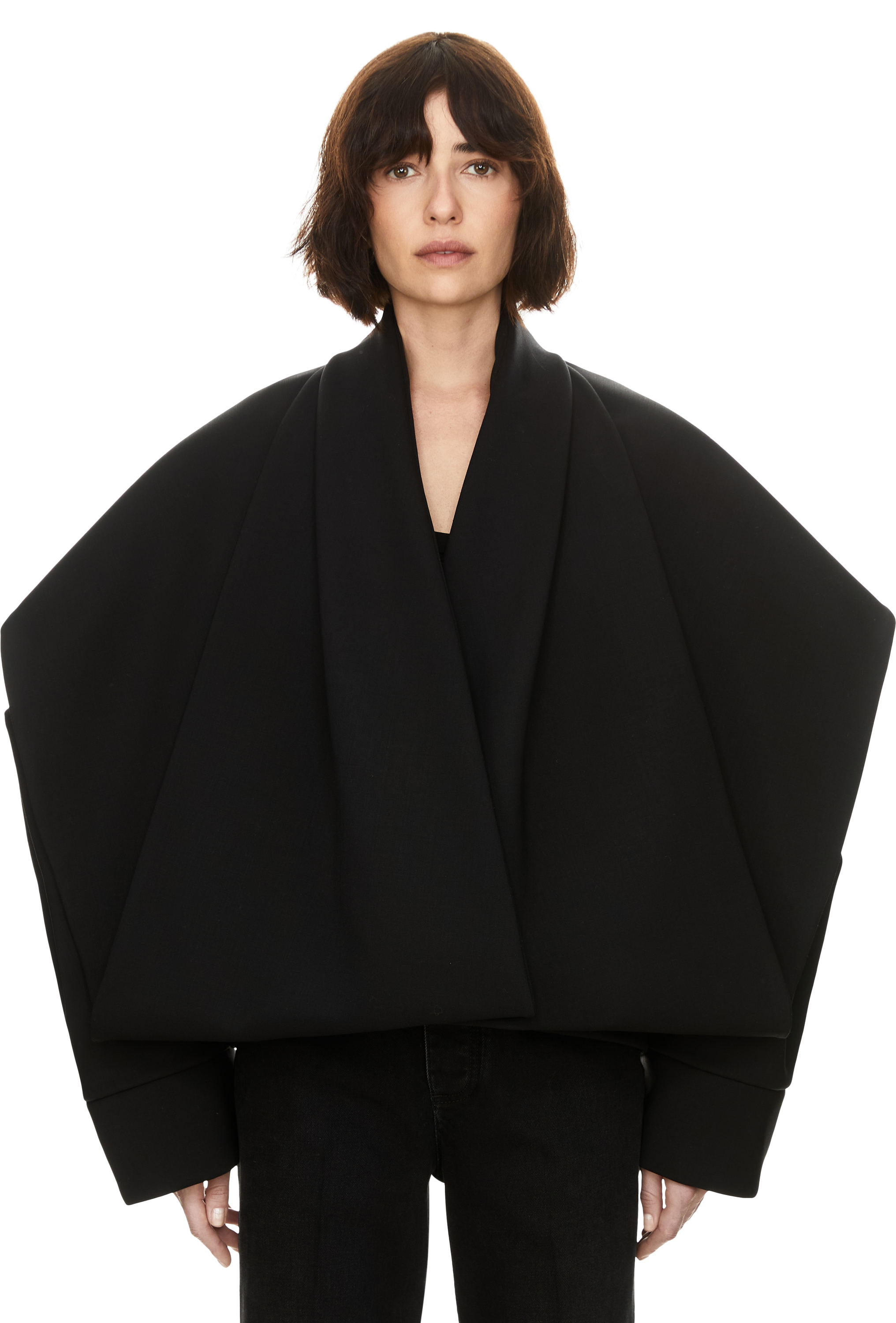 Die Jacke 'La Meunier' in Schwarz von JACQUEMUS wurde aus einer Stretch-Polyesterwolle gefertigt und besticht durch die Godets. Die abgerundete Form, der dekonstruierte Schalkragen, die weiten Ärmel mit überschnittenen, gestuften Schultern sowie die schrägen Nähte unterstreichen das Design.