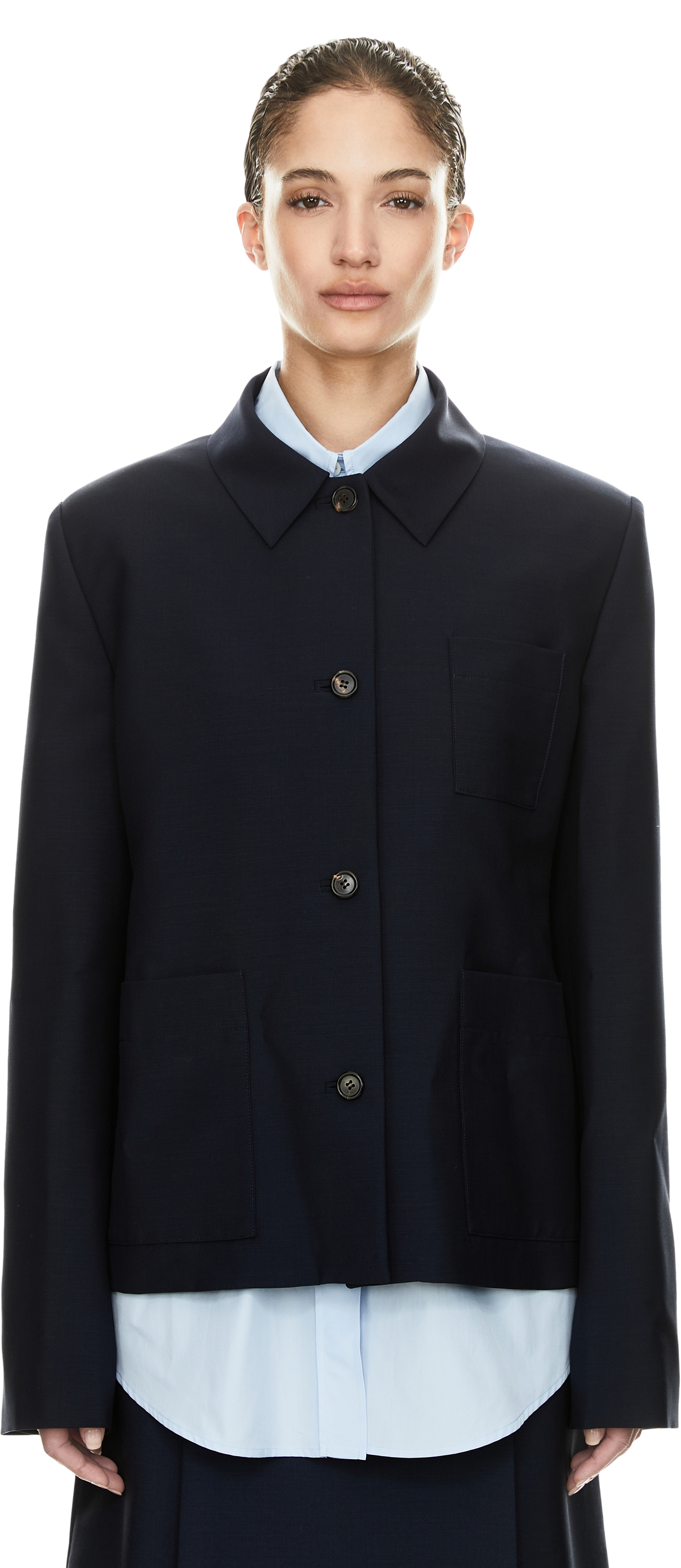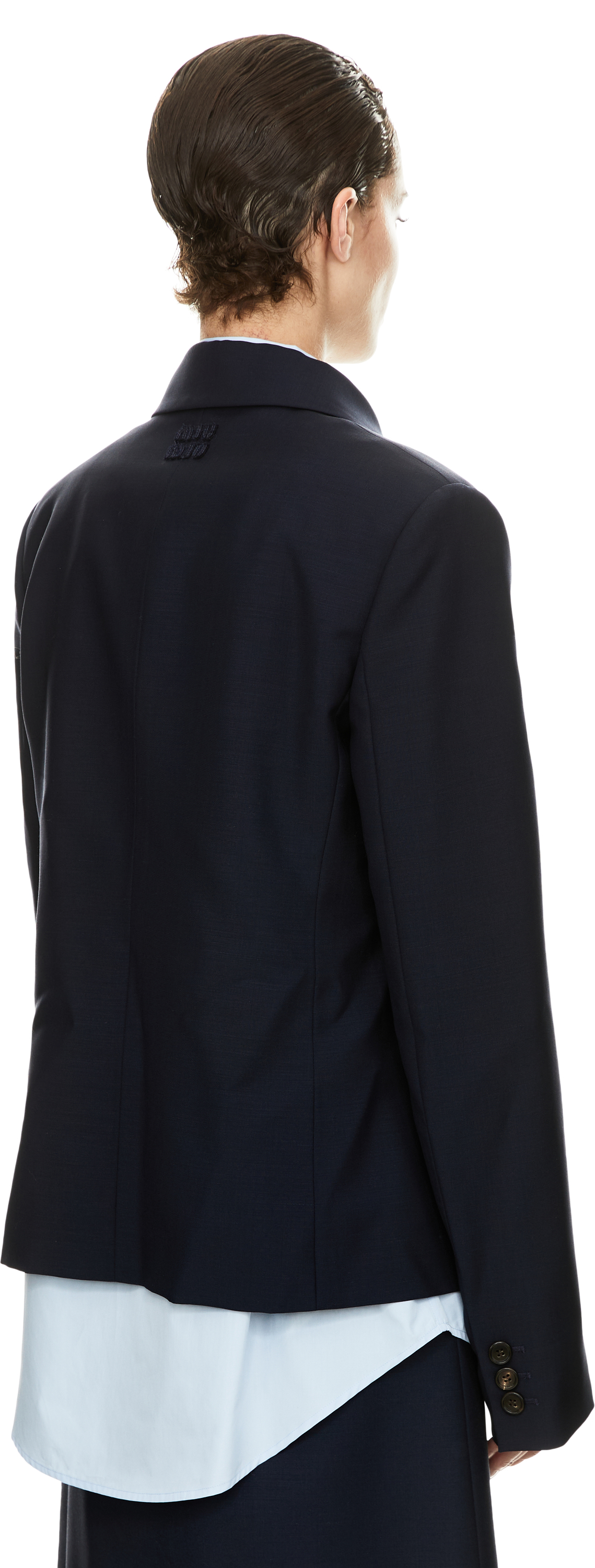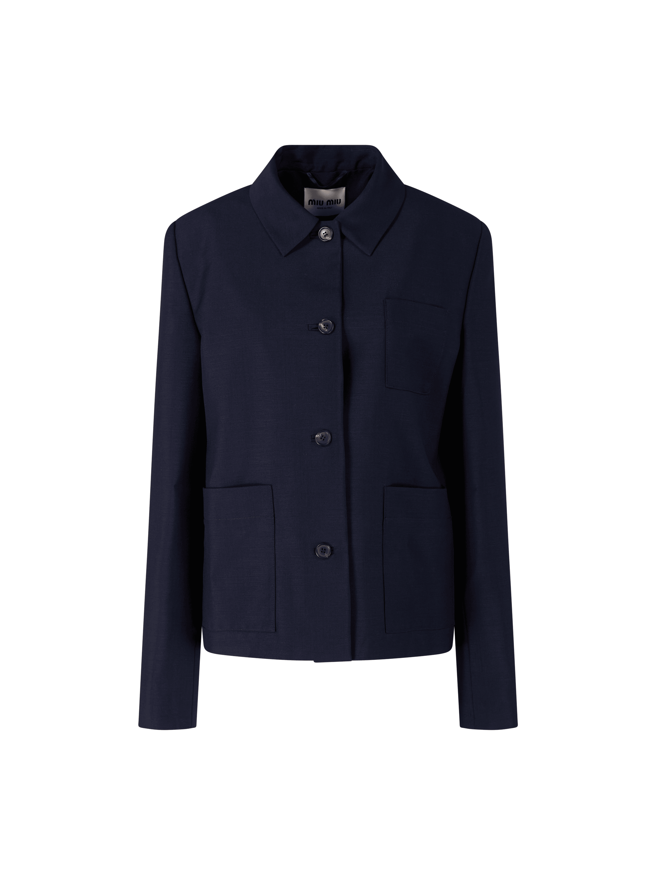 Diese Jacke in Marineblau von miu miu wurde aus Kid Mohair gefertigt und besticht durch die schmale Passform. Der Hemdkragen, die durchgehende Knopfleiste sowie die zwei Vordertaschen und Brusttaschen verleihen dem Modell eine elegante und hochwertige Ausstrahlung. Das ikonische Sticklogo auf der Rückseite rundet das Design ab.