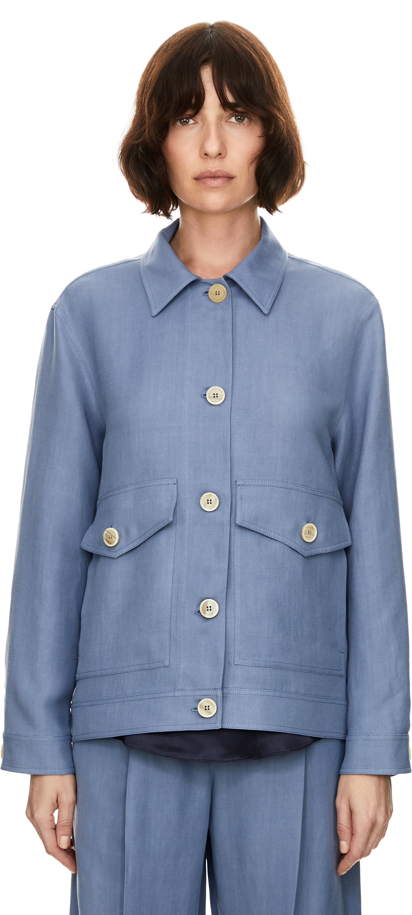 Diese Jacke in Hellblau von Brunello Cucinelli wurde aus einer hochwertigen Leinenmischung gefertigt und besticht durch den klassischen Schnitt. Der Hemdkragen, die durchgehende Knopfleiste, die zwei aufgesetzten Vordertaschen sowie die seitlichen Eingrifftaschen verleihen dem Modell eine elegante und hochwertige Ausstrahlung.