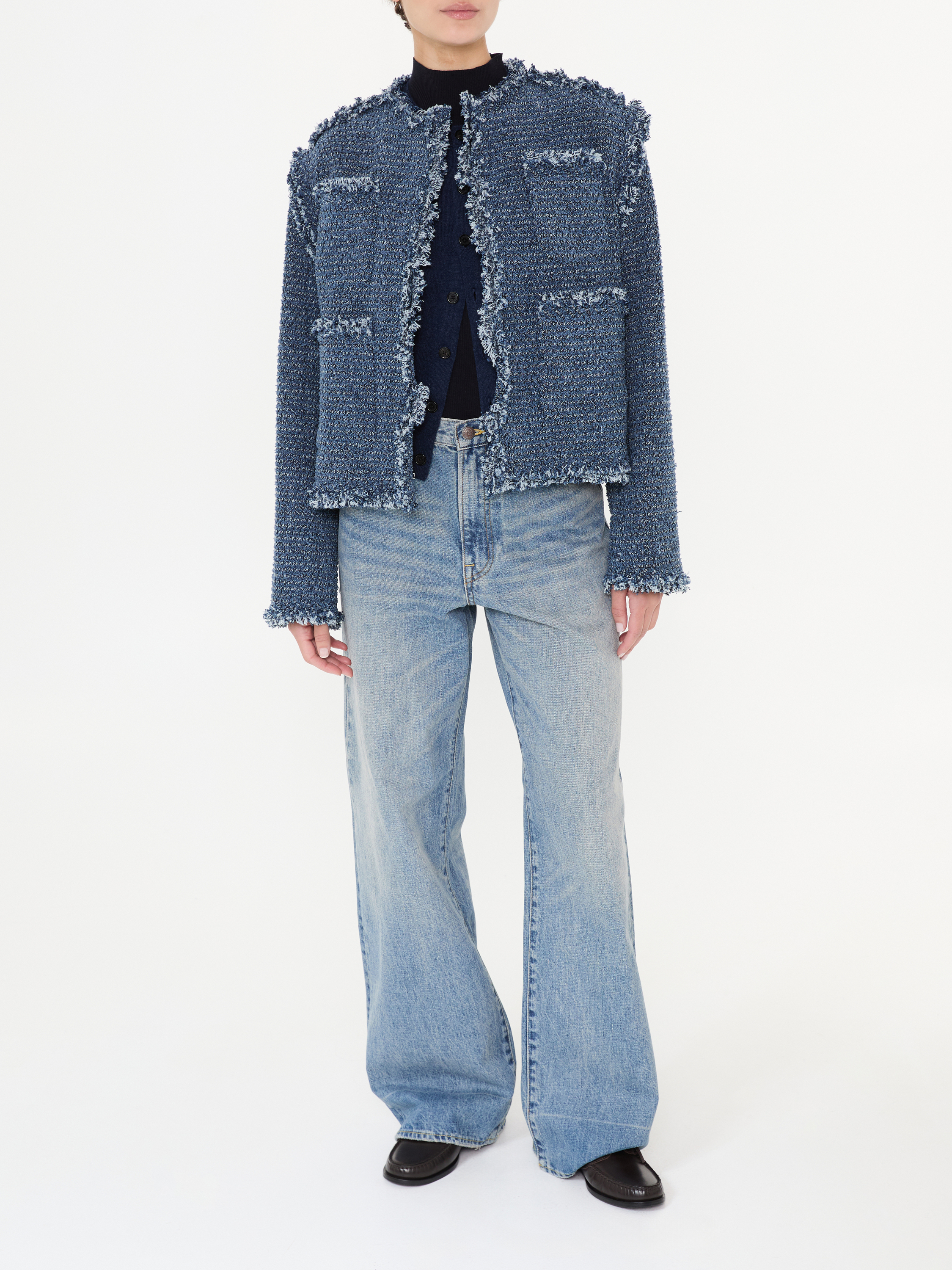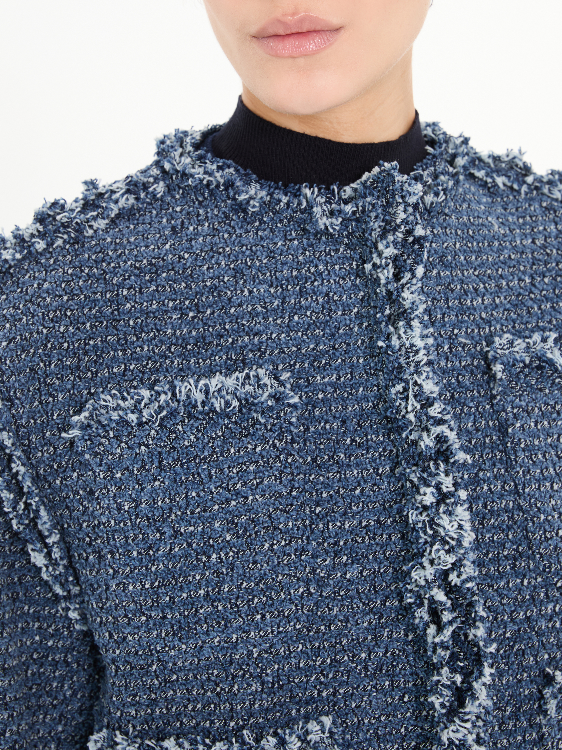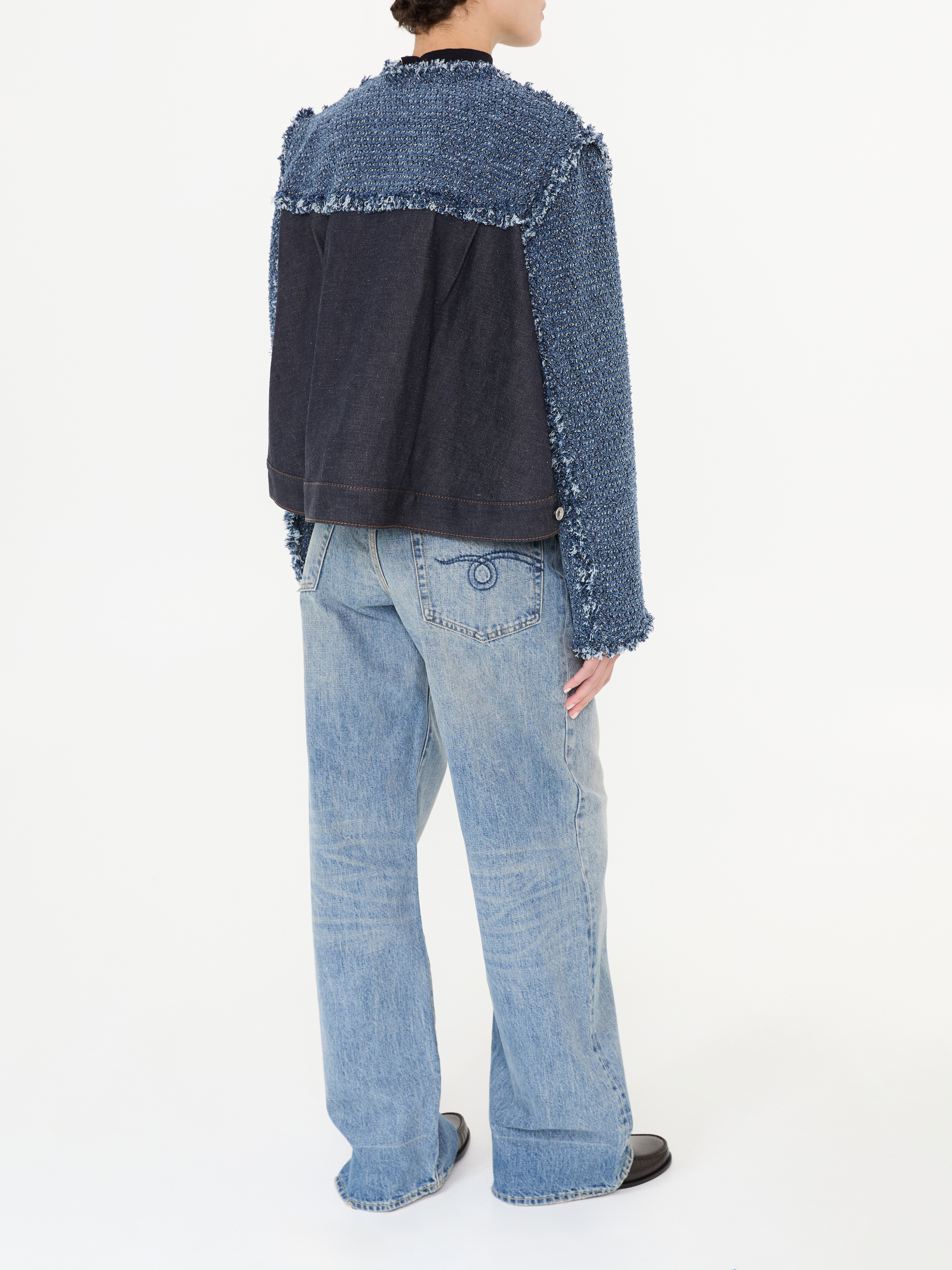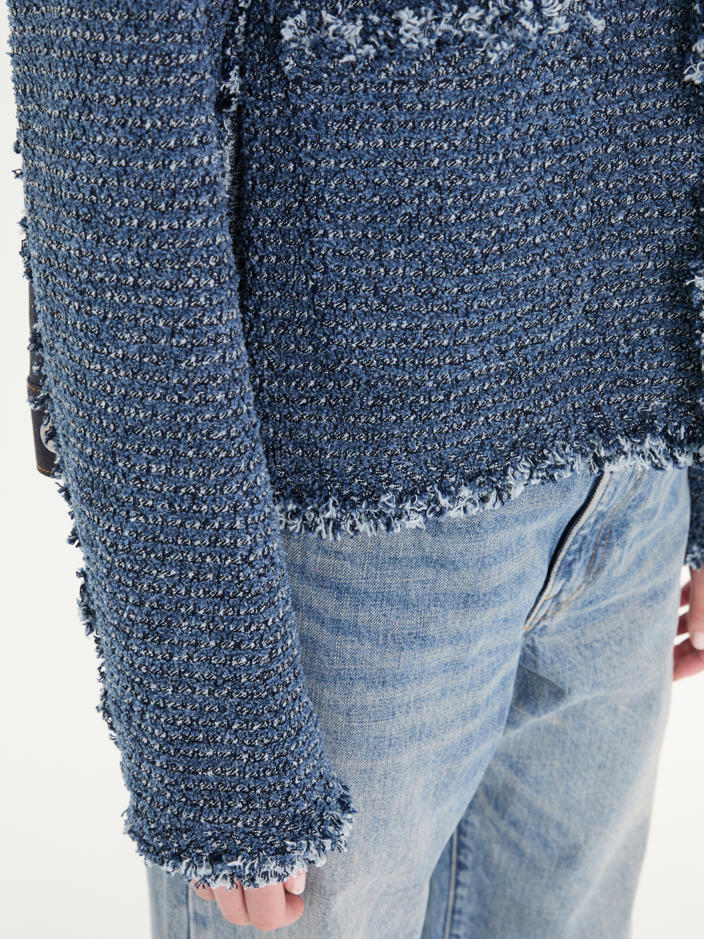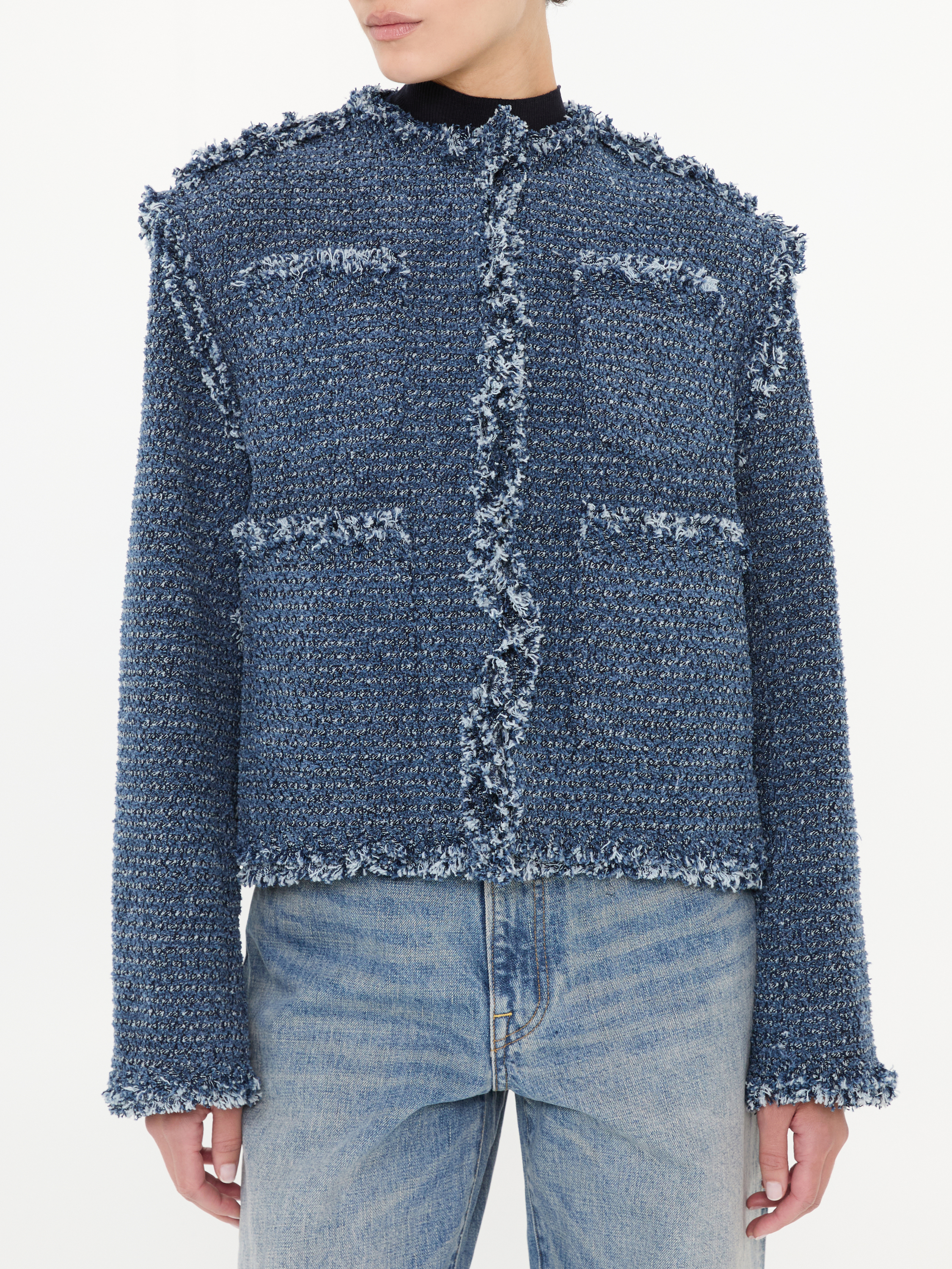 Die Jacke 'Punching Denim' in Blau von Sacai wurde aus reiner Baumwolle gefertigt und besticht durch ihr innovatives Design. Der Rundhalsausschnitt, die verdeckte Knopfleiste vorne und die aufgesetzten Taschen zeichnen dieses modische Modell aus. Ein besonderer Hingucker sind die Fransen, die das Modell zu einem modernen, lässigen Piece machen.