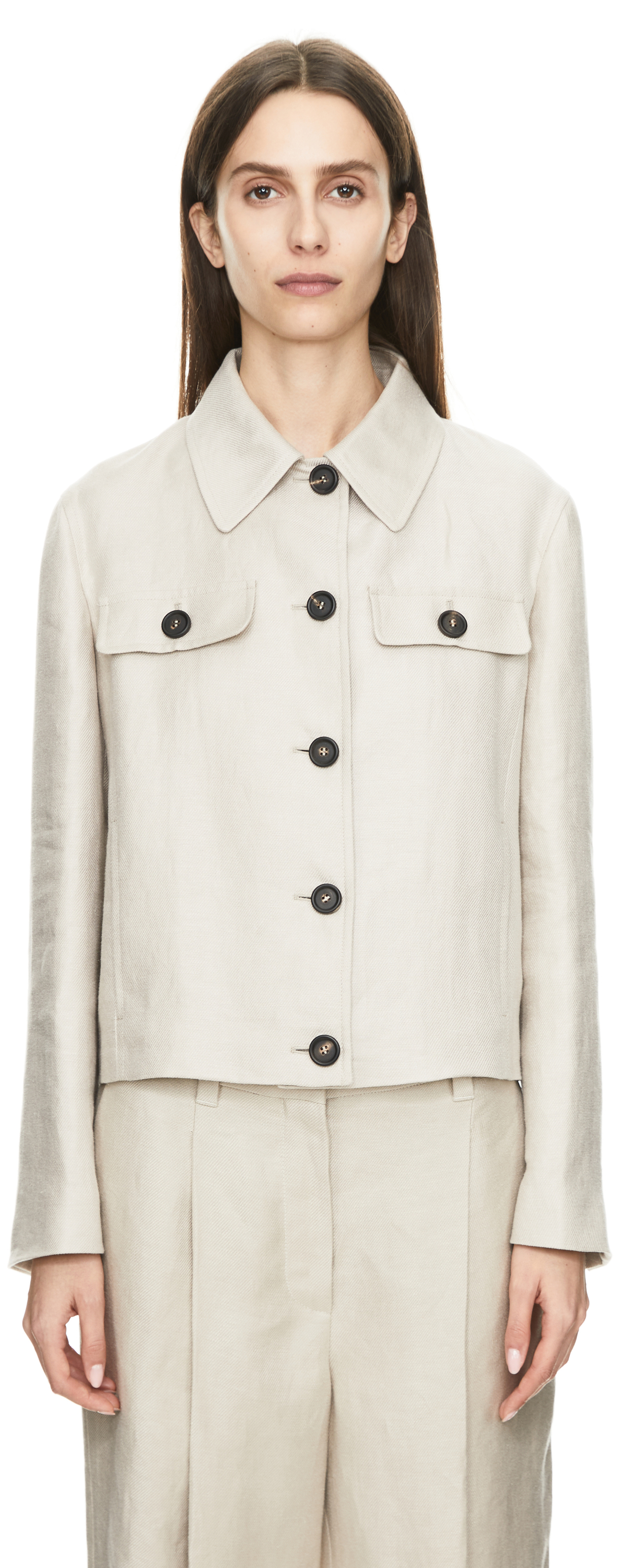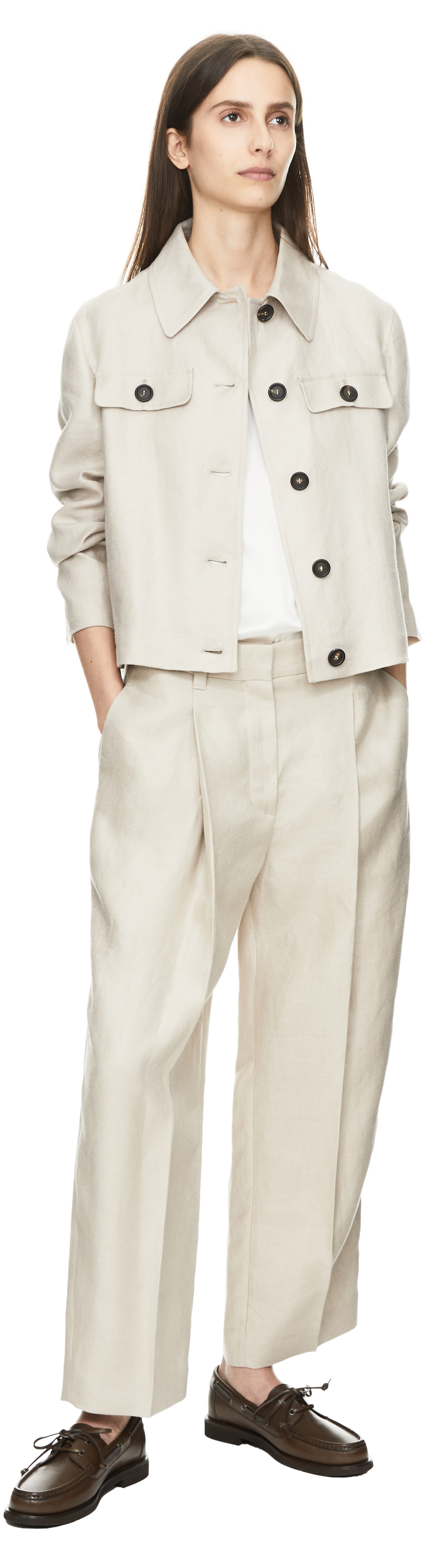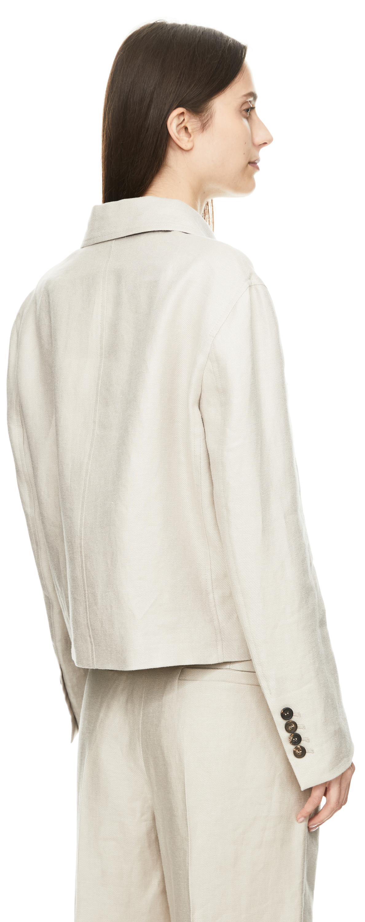 Diese Jacke in Beige von Brunello Cucinelli wurde aus hochwertigem Leinen gefertigt und besticht durch den klassischen Schnitt. Die taillierte Passform, die Pattentaschen und die geknöpften Ärmelschlitze zeichnen dieses elegante Modell aus. Die Monili-Perlen hinten am Kragen schaffen einen stimmigen Abschluss.
