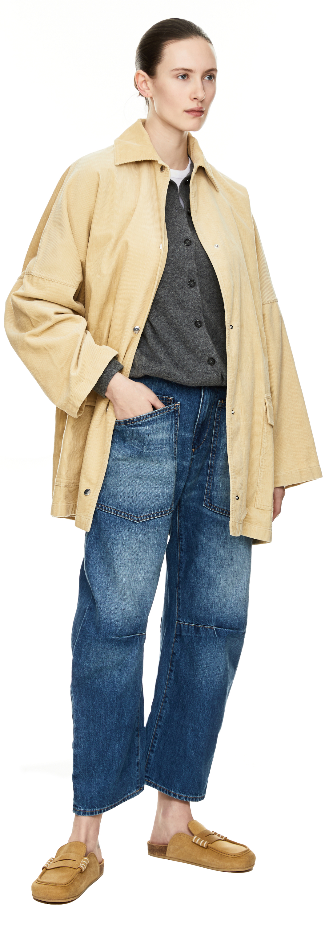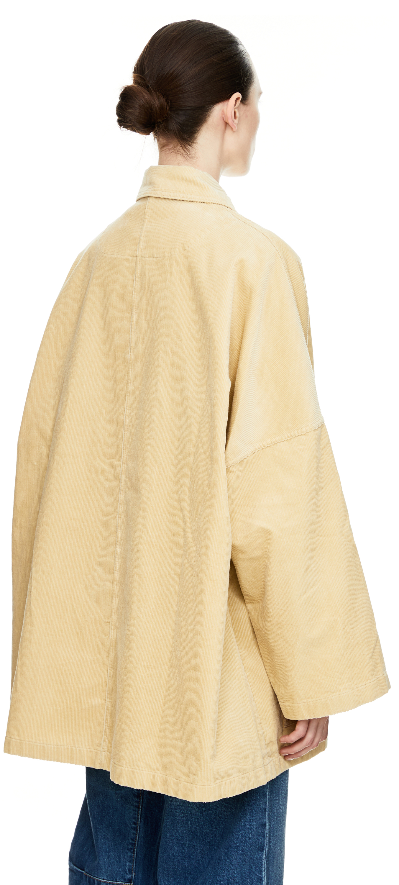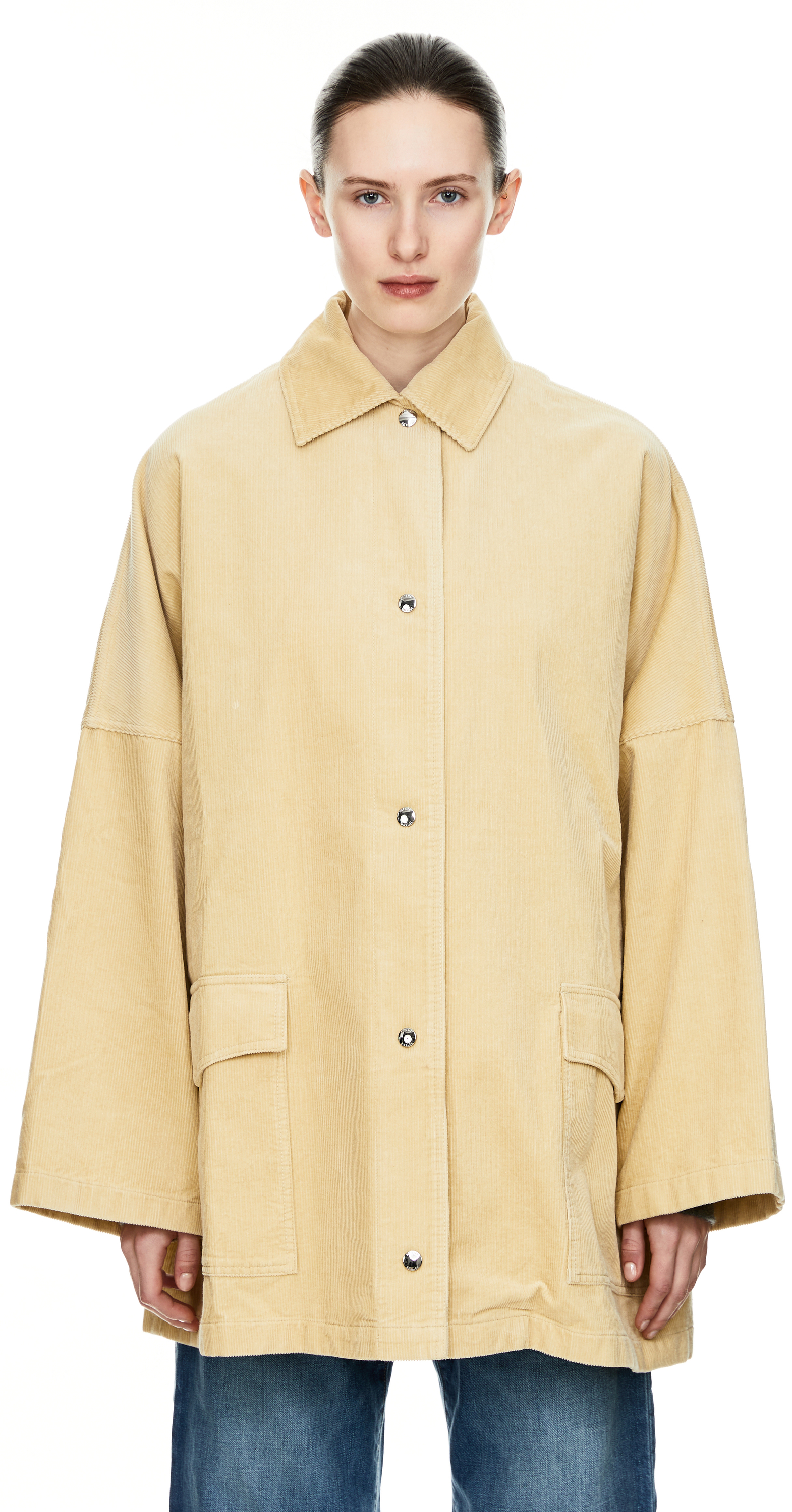 Diese Jacke in Beige von TOTEME wurde aus einem Baumwoll-Cord gefertigt und besticht durch die Oversize-Passform. Die silberfarbene Druckknopfleiste auf der Vorderseite mit Logoprägung, die zwei aufgesetzten Taschen, die überschnittenen Schultern sowie die weiten Ärmel zeichnen dieses Modell aus.