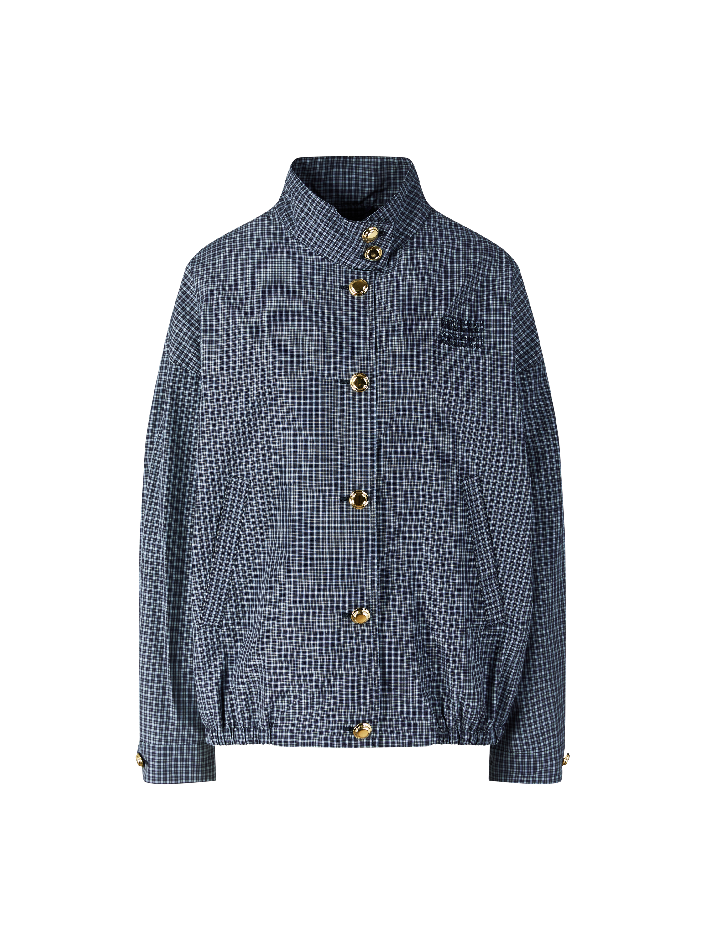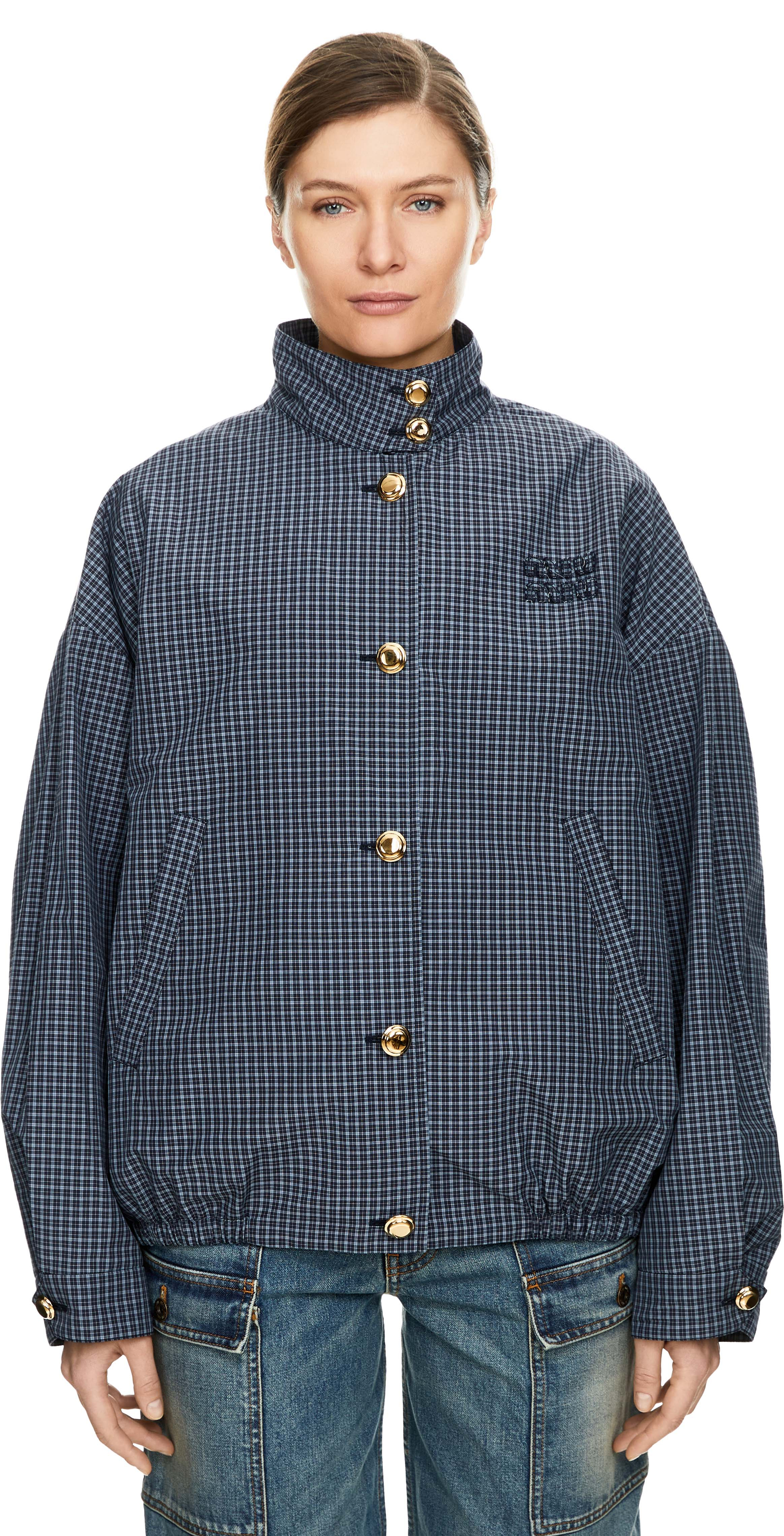 Diese Jacke in Blau von miu miu wurde aus einem Funktionsgewebe gefertigt und besticht durch das Prince-of-Wales-Karomuster. Der Oversized Fit und der elastische Saum verleihen dem Modell einen sportiven Look, während die goldfarbene Knopfleiste einen eleganten Kontrast bildet. Das charakteristische Sticklogo auf der Brust sorgt für dezente Markenakzente und rundet das Modell ab.