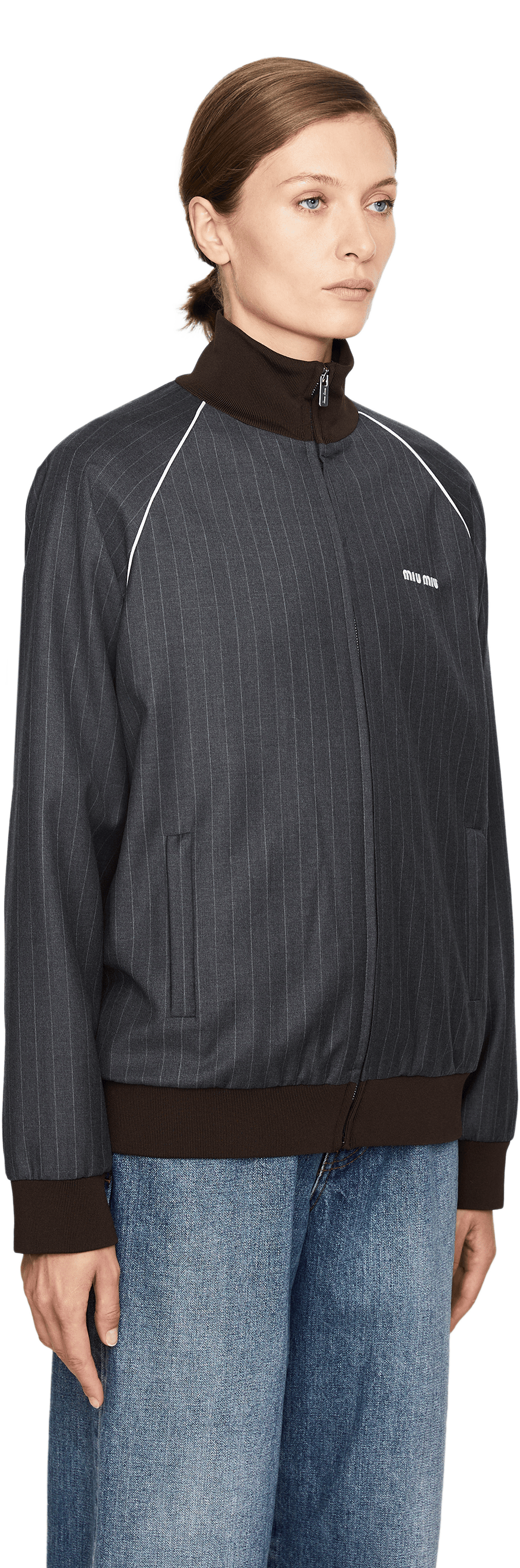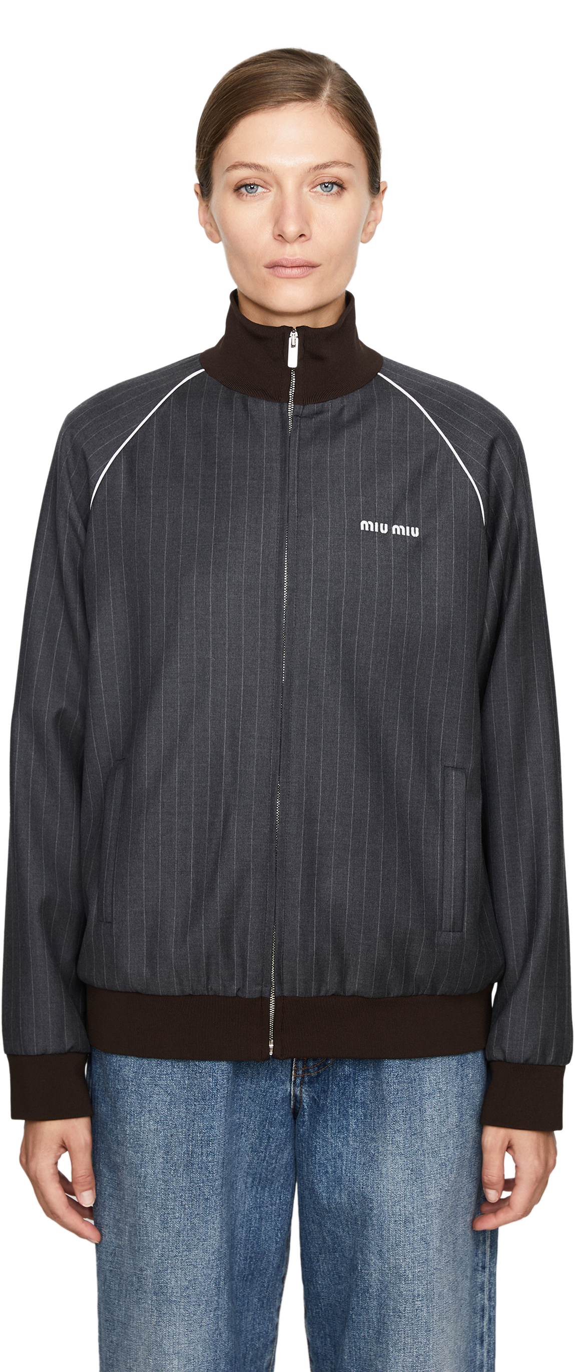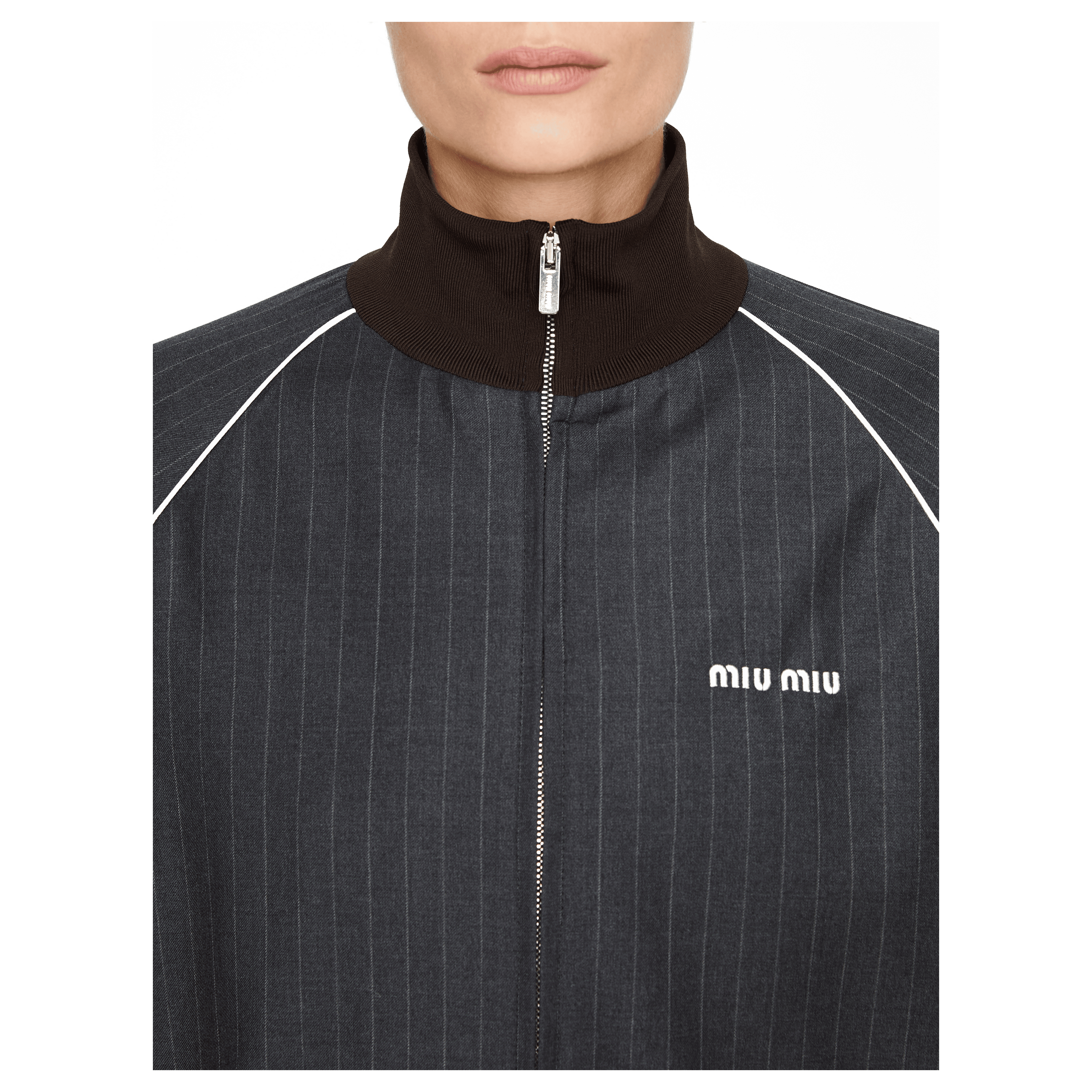 Diese Blousonjacke in Grau von miu miu wurde aus hochwertiger Schurwolle gefertigt und besticht durch den Hemdkragen. Die seitlichen Eingrifftaschen, der Reißverschluss und das Sticklogo zeichnen dieses moderne Modell aus.