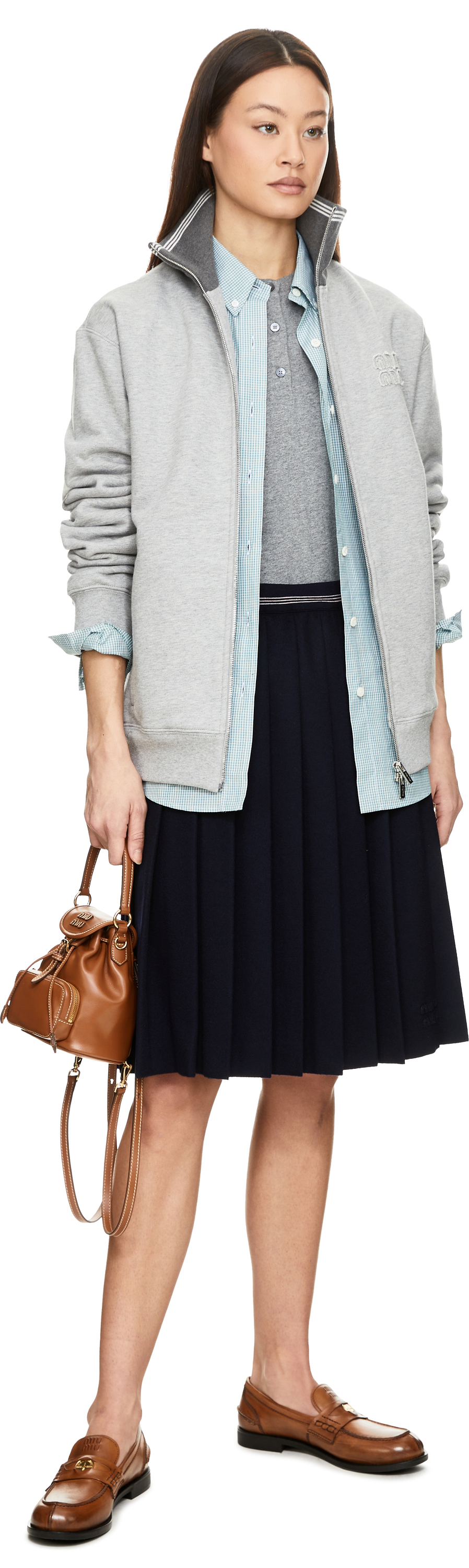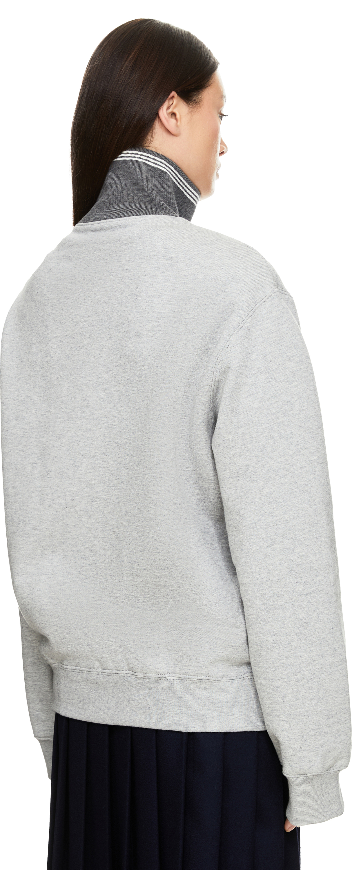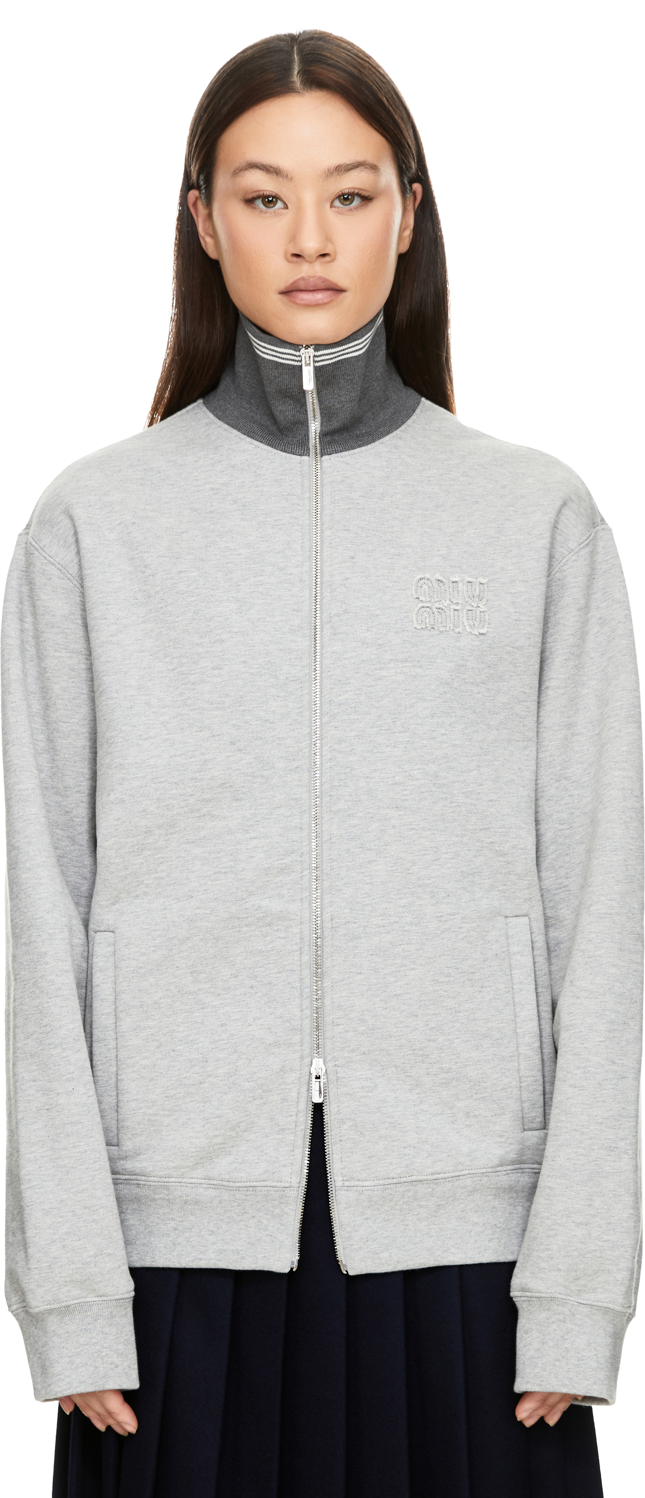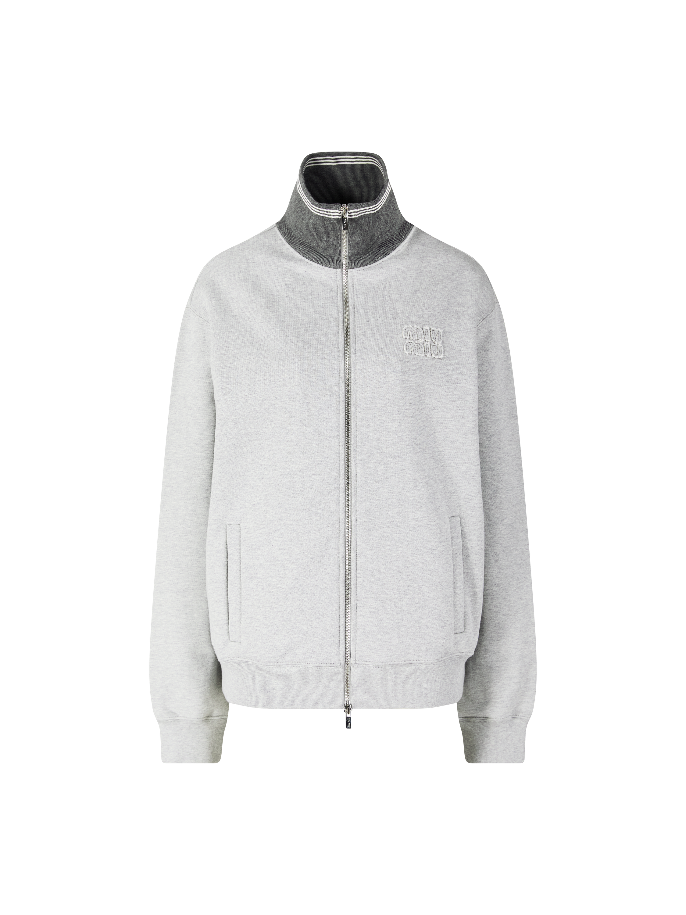 Diese Jacke in Grau von miu miu wurde aus Baumwollfleece gefertigt und besticht durch die Oversize-Passform. Der Stehkragen, die langen Ärmel mit Bündchen aus Rippstrick, der Reißverschluss auf der Vorderseite sowie das Sticklogo verleihen dem Design einen modernen, sportiven Charakter.