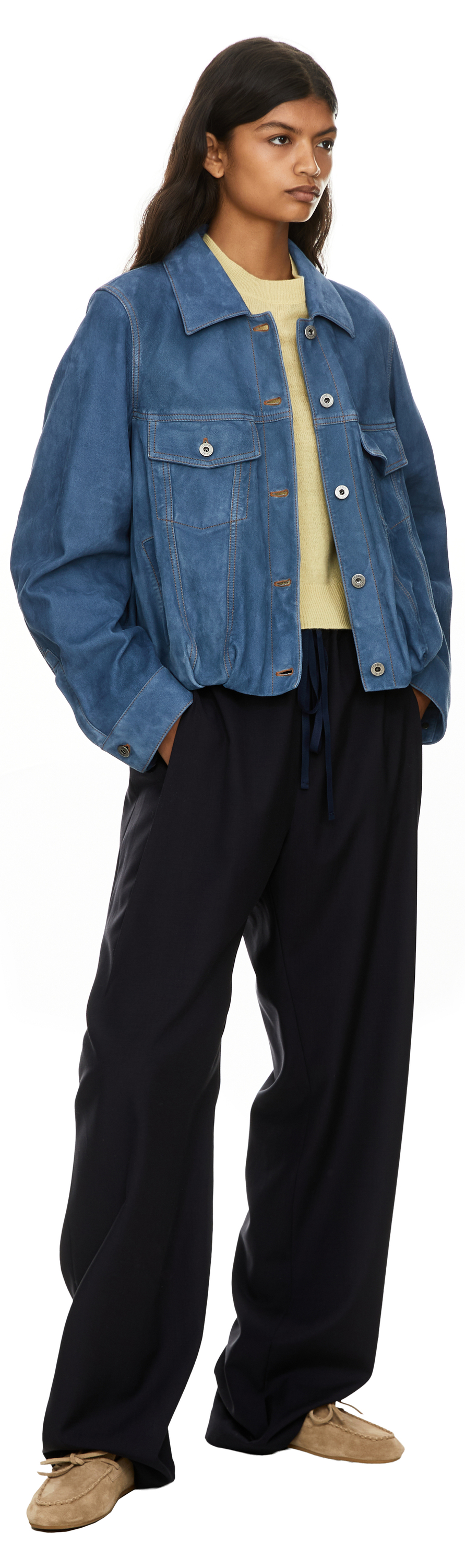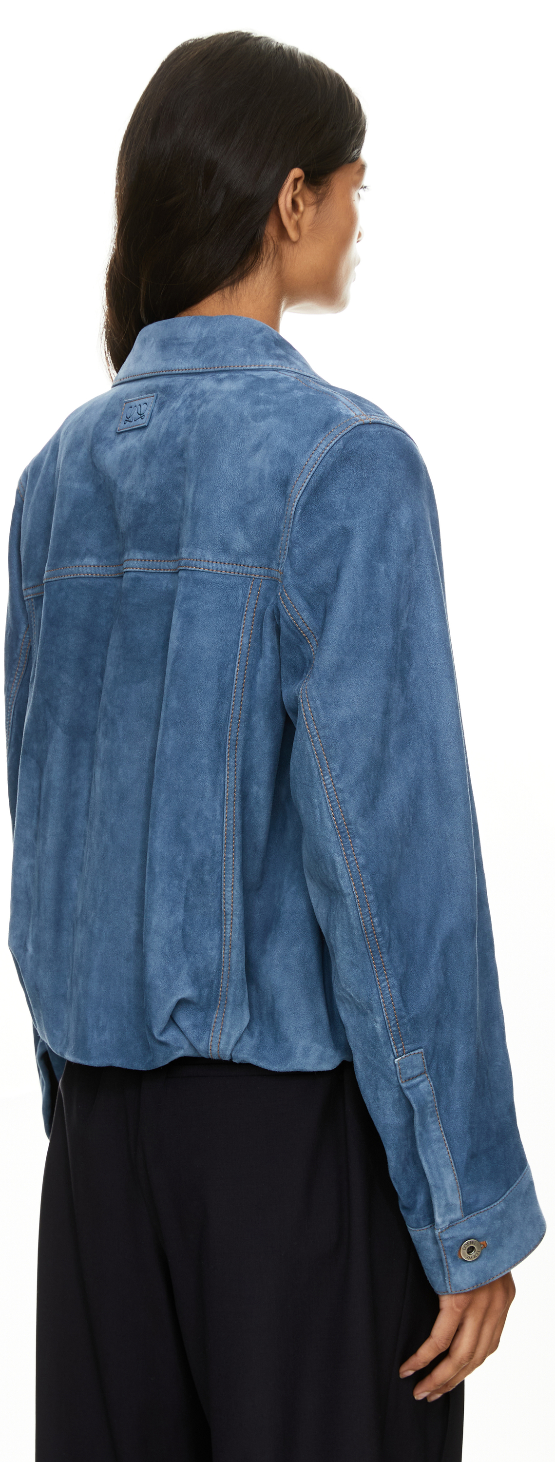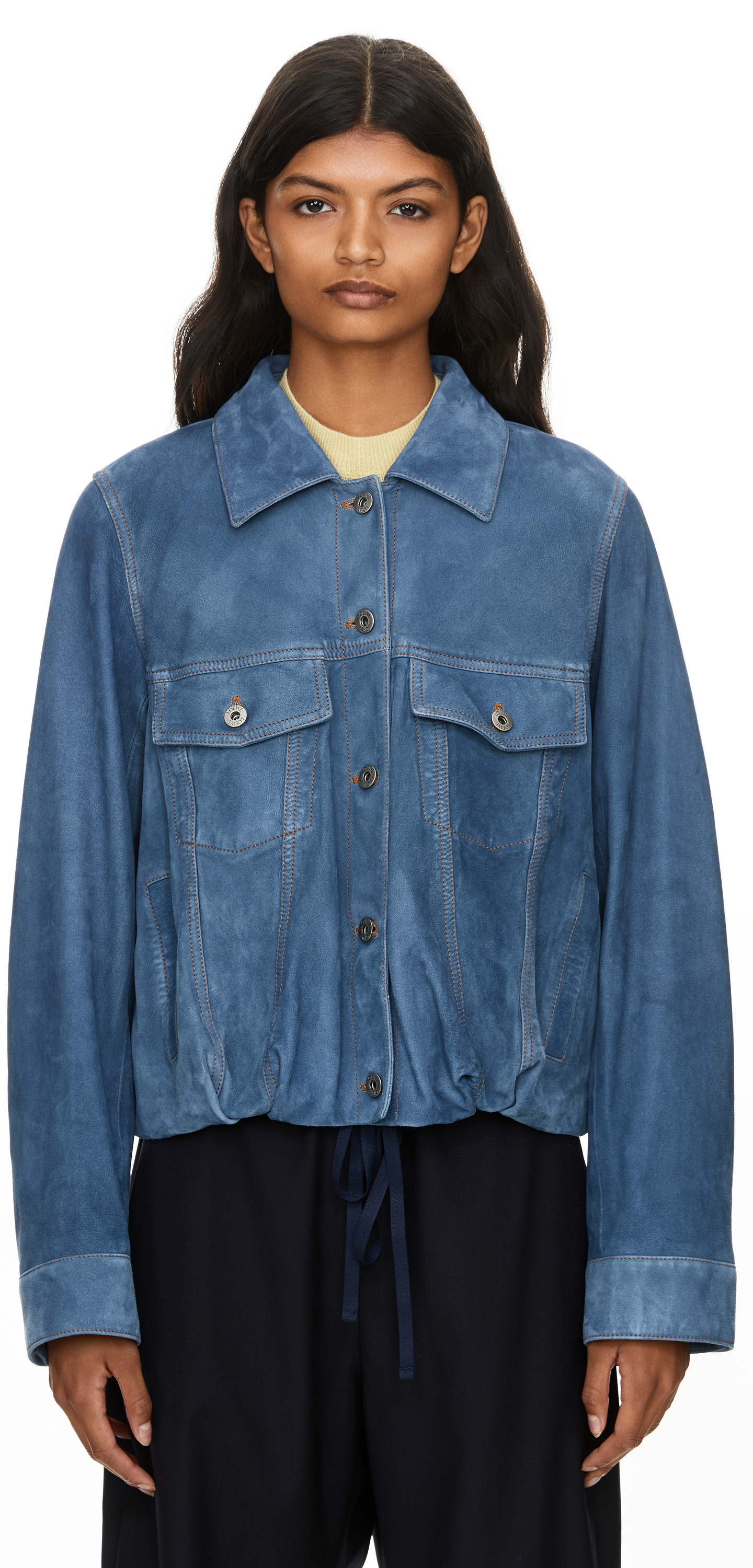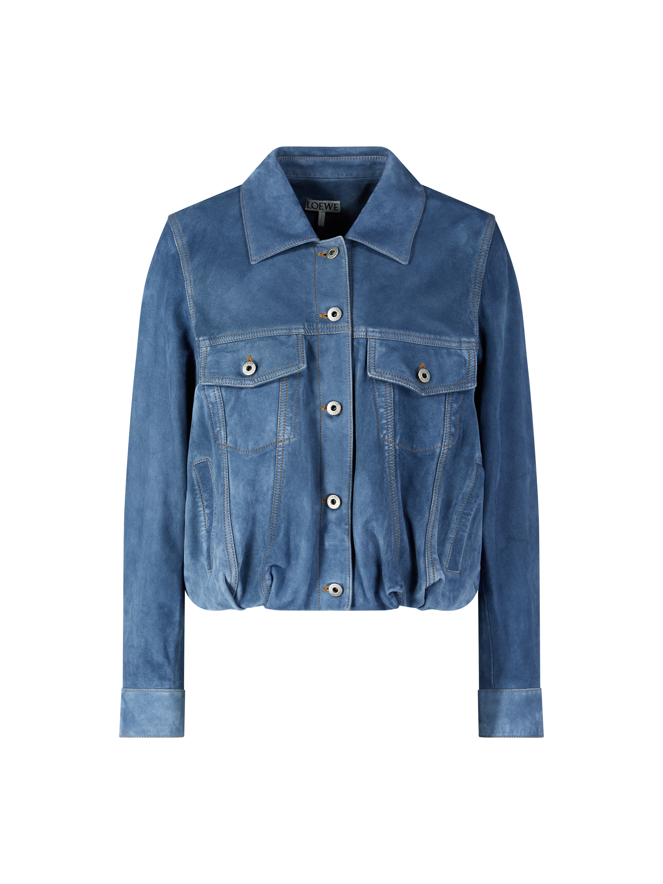 Diese Jacke in Mittelblau von LOEWE wurde aus leichtem, behandeltem Ziegenveloursleder gefertigt und besticht durch die ballonförmige Silhouette. Die geschwungenen Ärmel, die kurze Länge, der klassische Kragen und die Knopfleiste vorne prägen das Design. Die aufgesetzten Brusttaschen mit Knöpfen sowie die vertikale Leistentasche runden den Look ab.