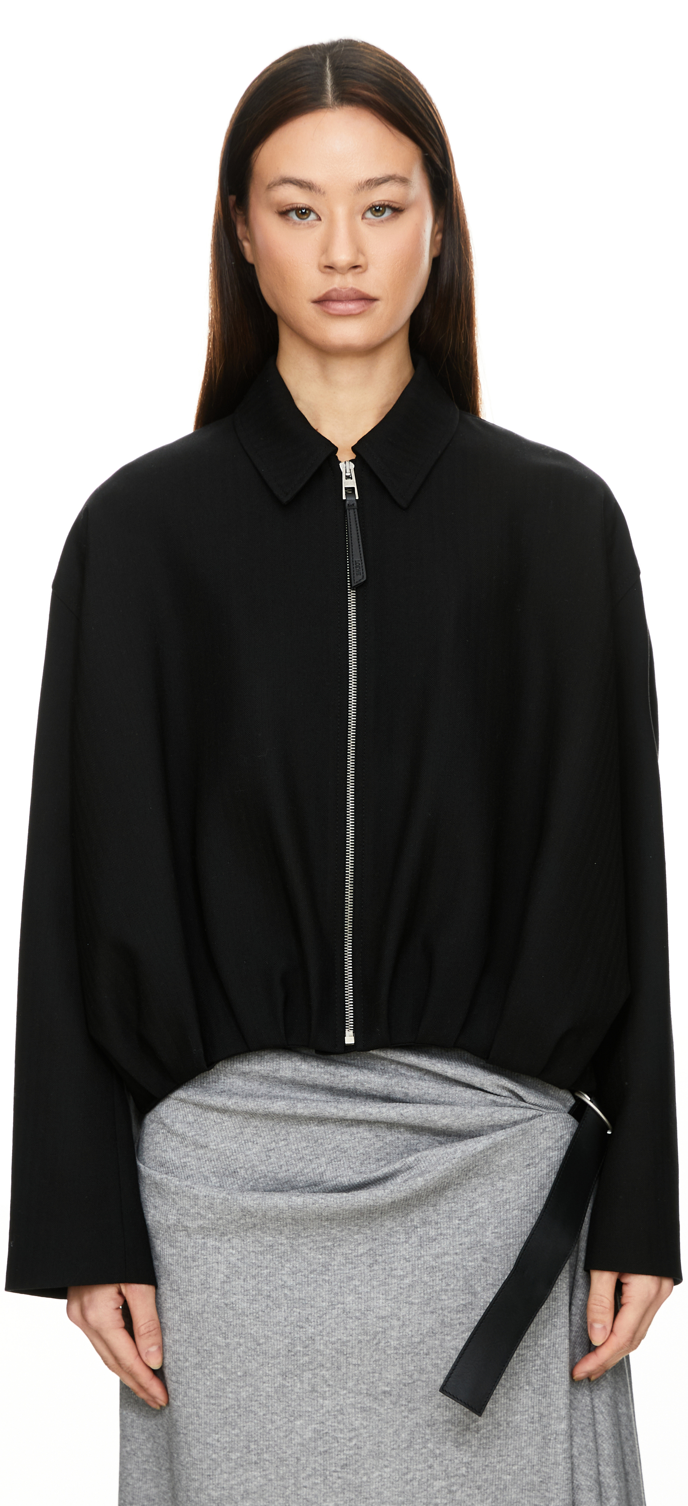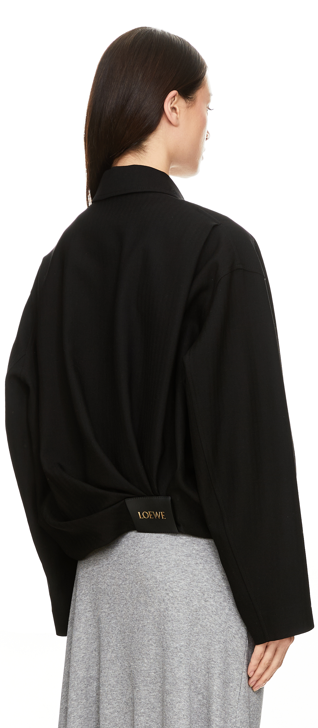 Die Jacke 'Draped' in Schwarz von LOEWE wurde aus Woll-Crêpe gefertigt und besticht durch die ballonförmige Silhouette. Die asymmetrische, handgeraffte Drapierung auf der Rückseite, die kurze Länge, der klassische Kragen, der Reißverschluss vorne sowie der LOEWE-Lederaufnäher mit Prägung auf der Rückseite runden das Design ab.