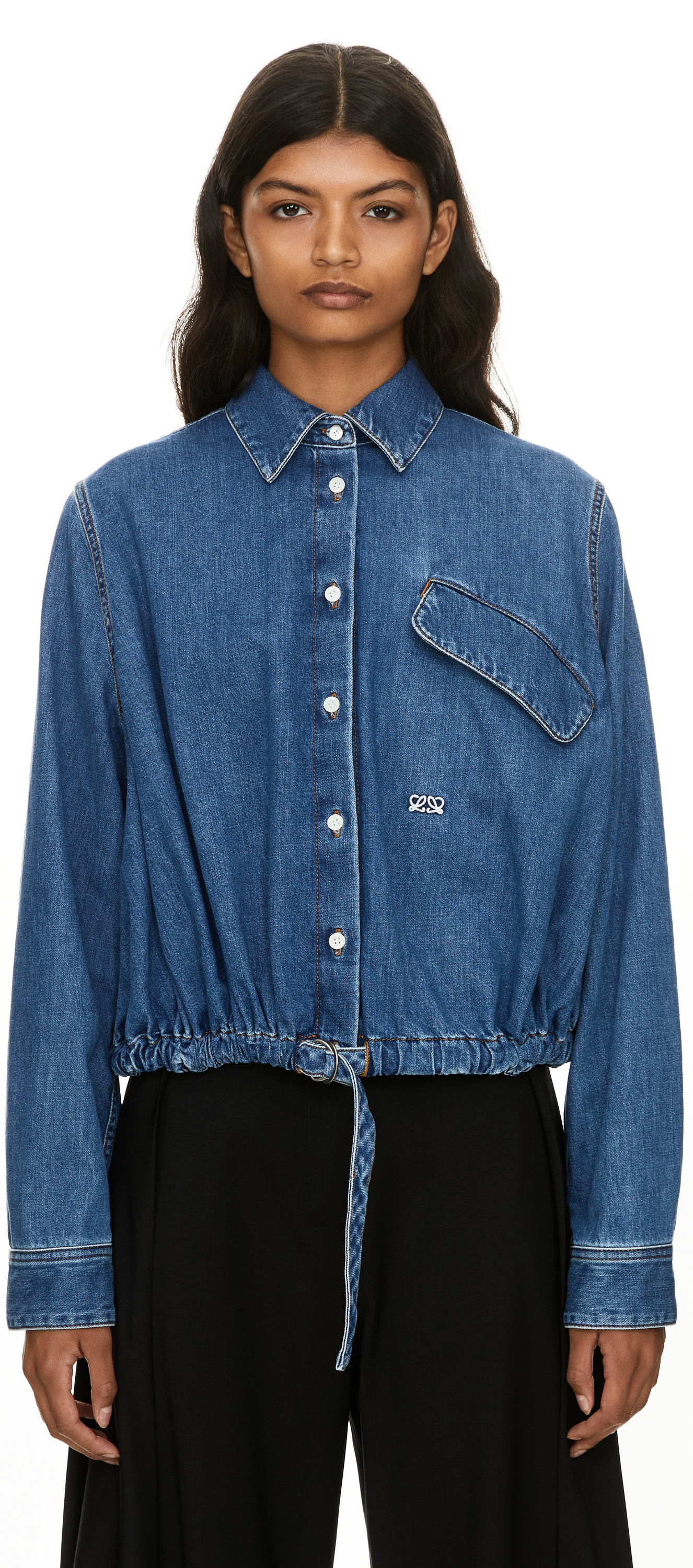 Die Jeansjacke 'Belted' in Blau von LOEWE wurde aus leichtem, gewaschenem Baumwolldenim gefertigt und besticht durch eine ballonförmige Silhouette. Die kurze Länge, der verstellbare Saum mit Riegel, der klassische Kragen sowie die durchgehende Knopfleiste unterstreichen das Design. Die diagonale Brustpattentasche sowie die Doppel-L-Stickerei auf der Vorderseite runden den Look ab.