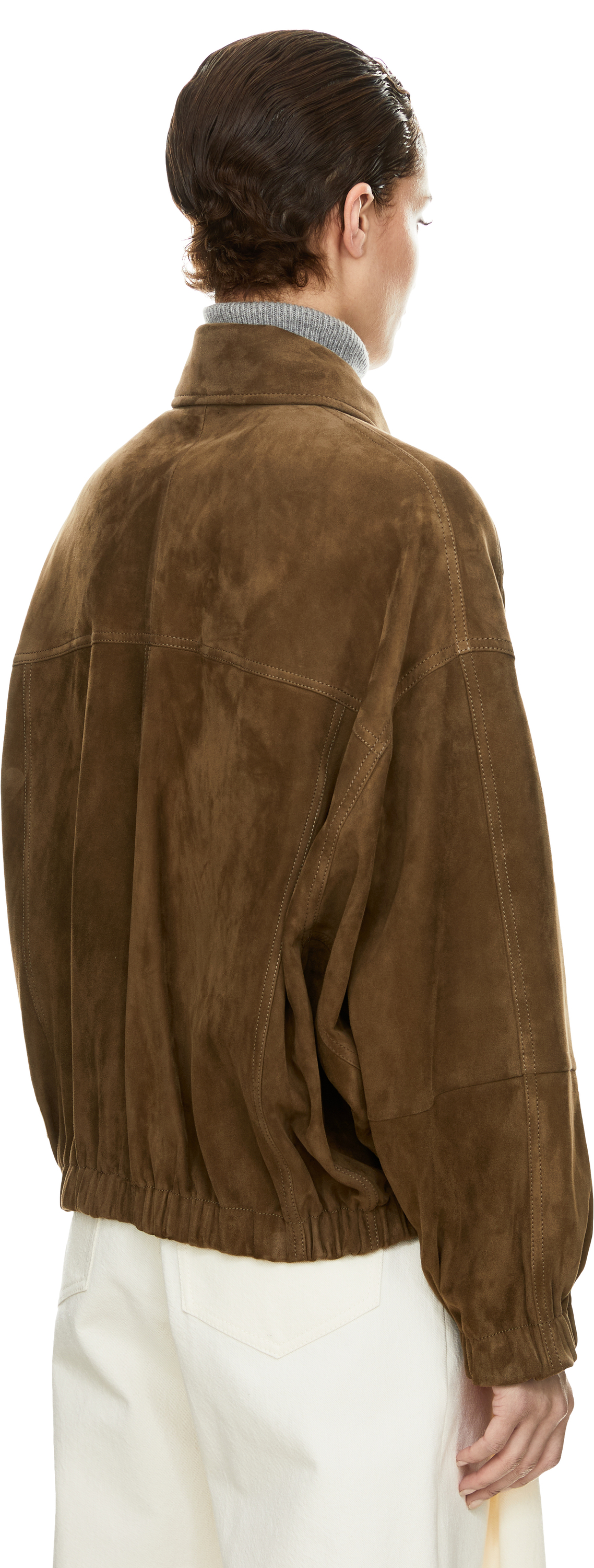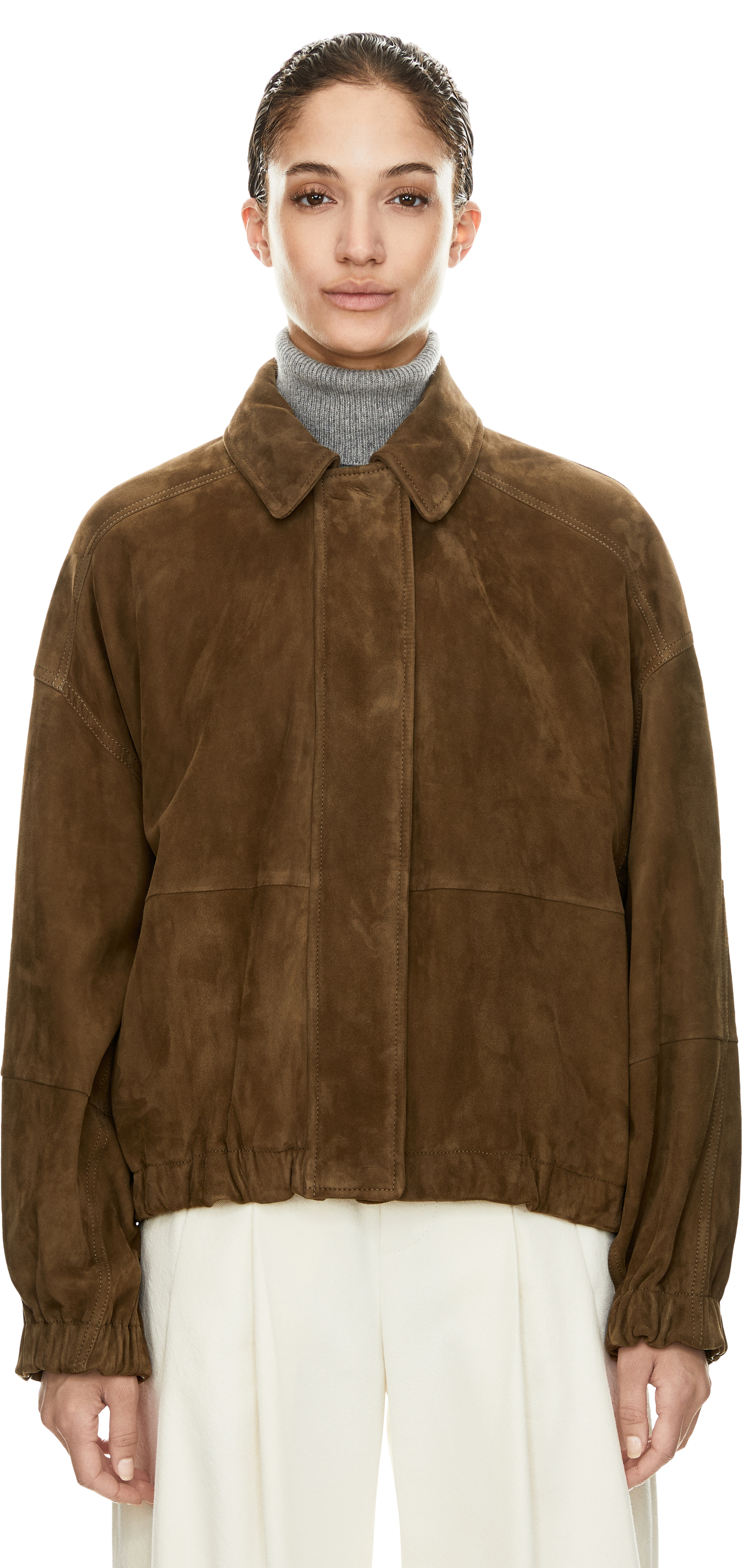 Diese Jacke in Khaki von Brunello Cucinelli wurde aus hochwertigem Lammveloursleder gefertigt und besticht durch das sportiv-elegante Design. Der elastische Saum mit Raffungen sorgen für hohen Tragekomfort und verleihen dem Modell eine dezente Struktur. Der Zwei-Wege-Reißverschluss mit Lederlasche, veredelt durch ikonische Monili-Perlen, setzt dabei einen edlen Akzent und vollendet das Design harmonisch.