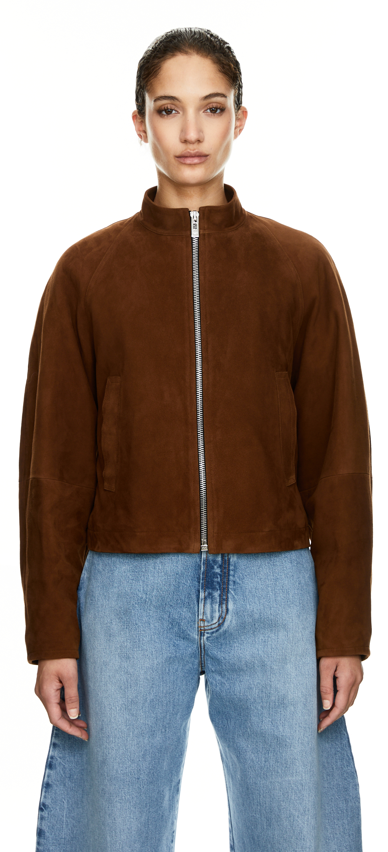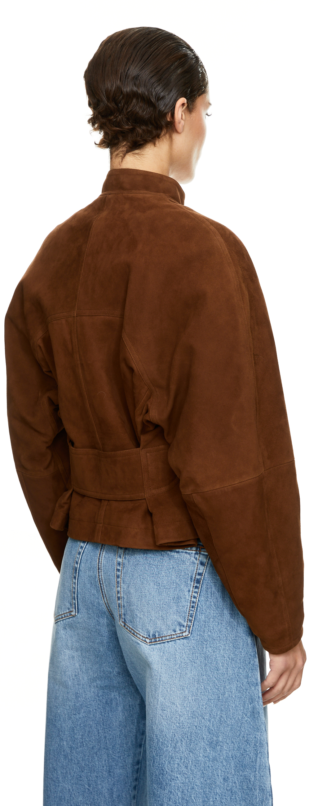 Diese Lederjacke in Braun von Alaïa wurde aus weichem Ziegenveloursleder gefertigt und besticht durch den markanten Riemen am unteren Rücken, der die Taille dezent formt und dem Design eine feminine Silhouette verleiht. Der Mandarinkragen, die Raglanärmel und der frontale Reißverschluss unterstreichen den modernen Look, während die seitlichen Leistentaschen die edle Verarbeitung harmonisch abrunden.