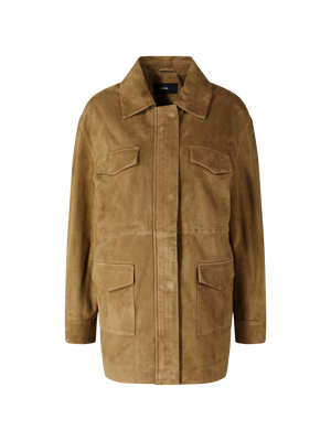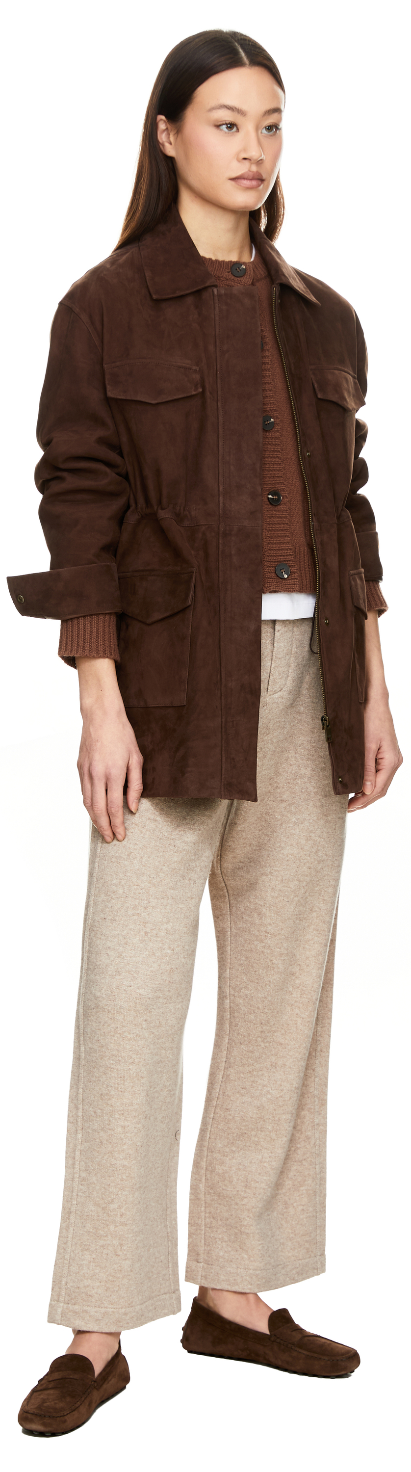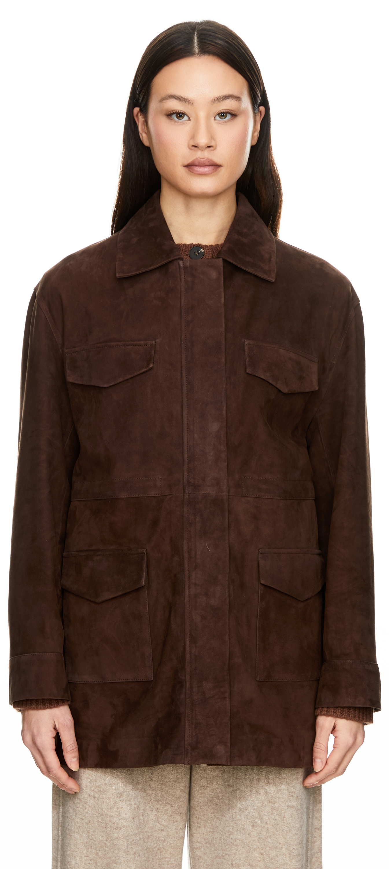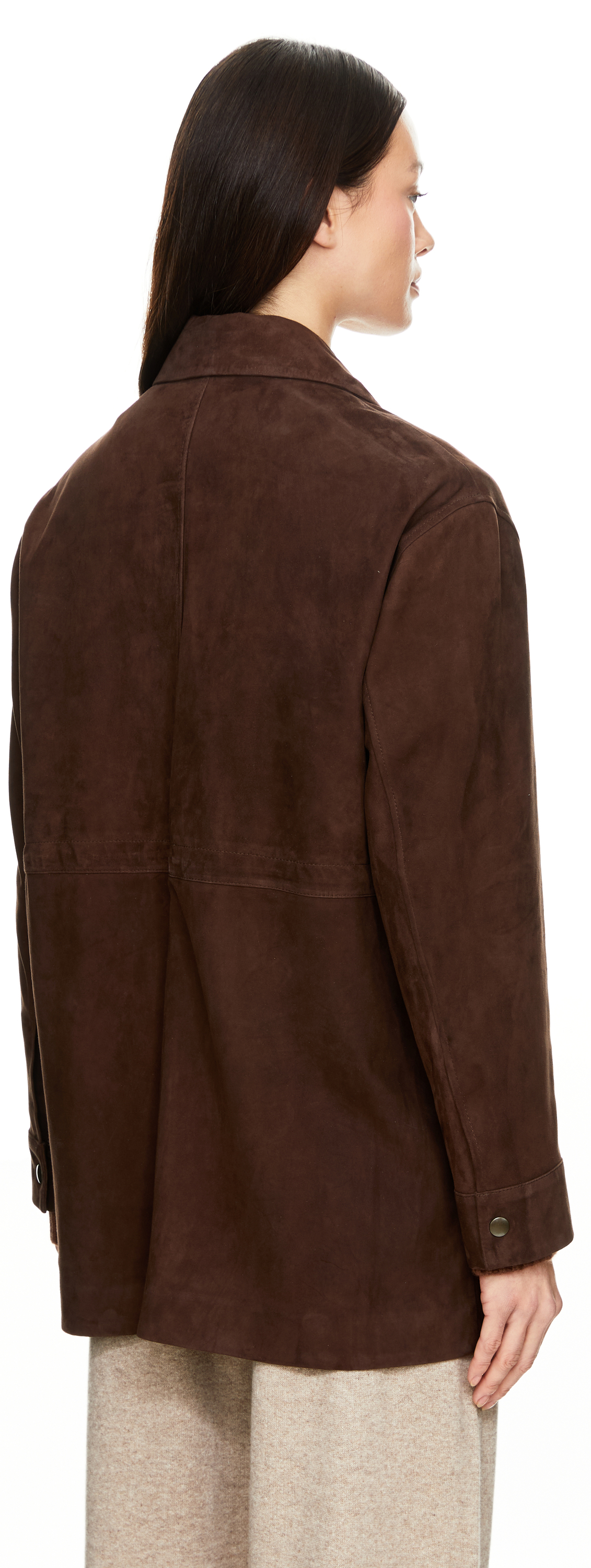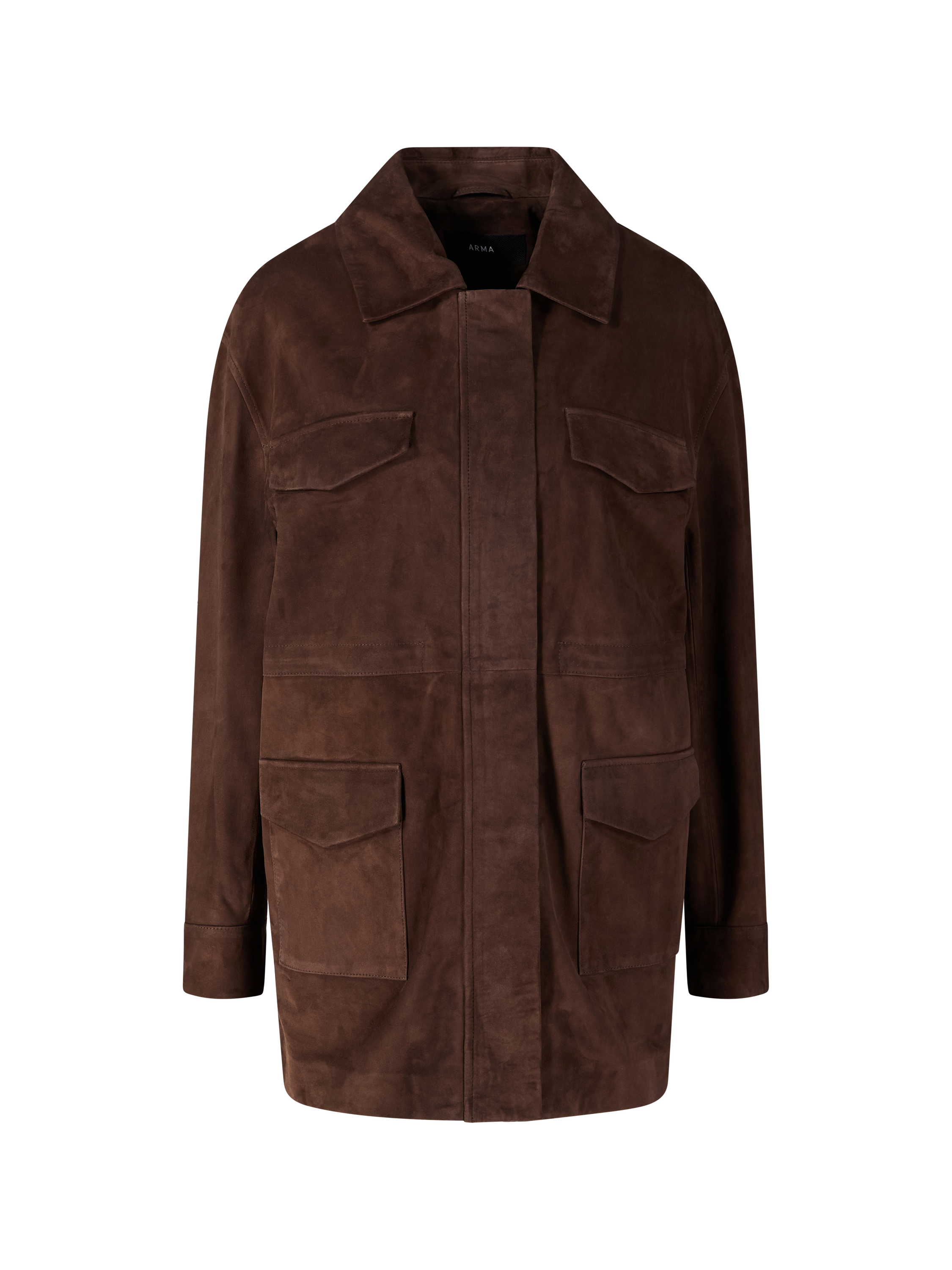 Die Jacke 'Sadie' in Dunkelbraun von ARMA, exklusiv für Unger, wurde aus hochwertigem Lamm-Veloursleder gefertigt und besticht durch die gerade Passform. Die zwei aufgesetzten Brusttaschen sowie die Eingrifftaschen setzen lässige Akzente, während der verdeckte Reißverschluss mit Druckknöpfen das Design abrundet.