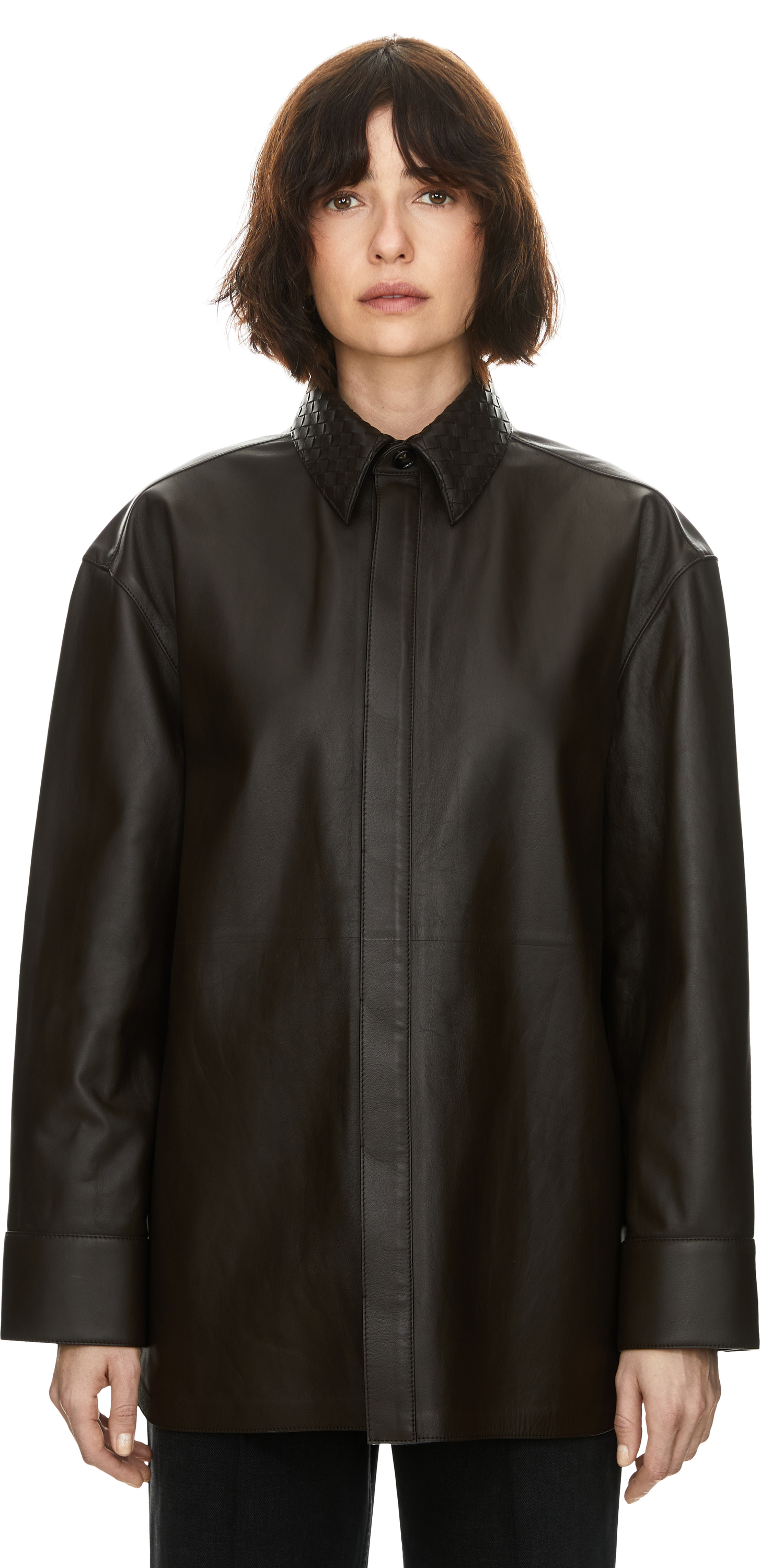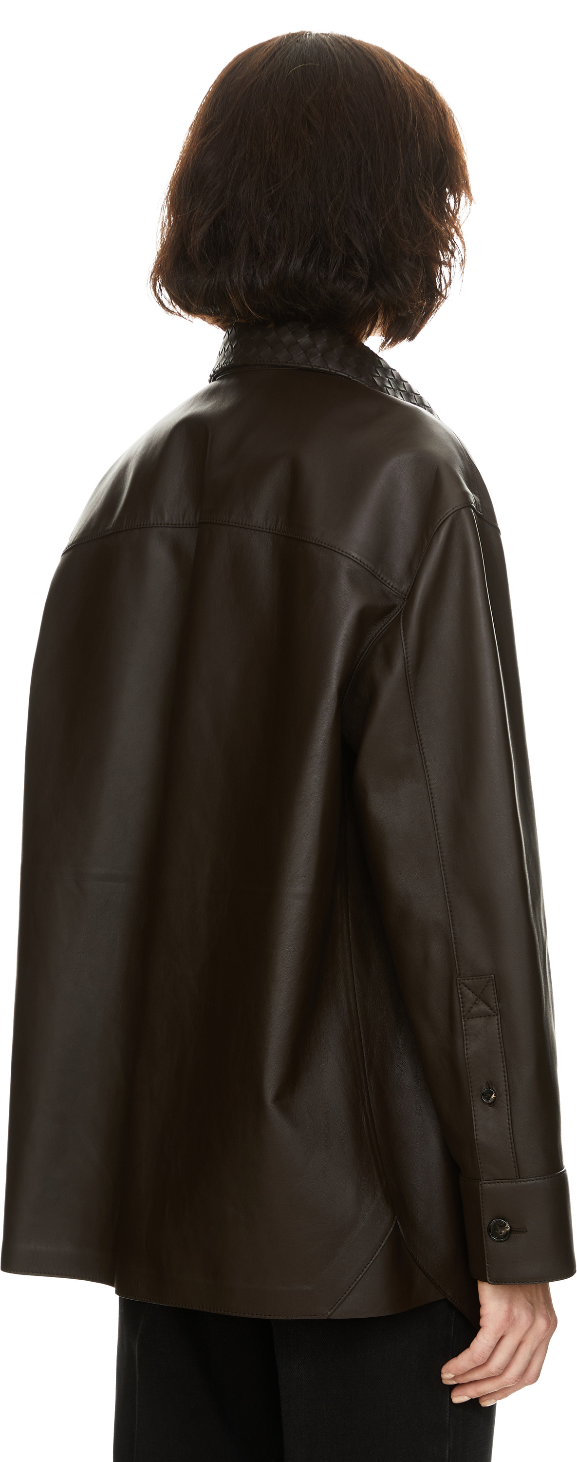 Diese Lederjacke in Dark Carrubo von Bottega Veneta wurde aus hochwertigem Lammleder gefertigt und besticht durch den Intrecciato-Lederkragen. Die verdeckte Knopfleiste sowie die Manschettenknöpfe runden dieses hochwertige Design stilvoll ab.