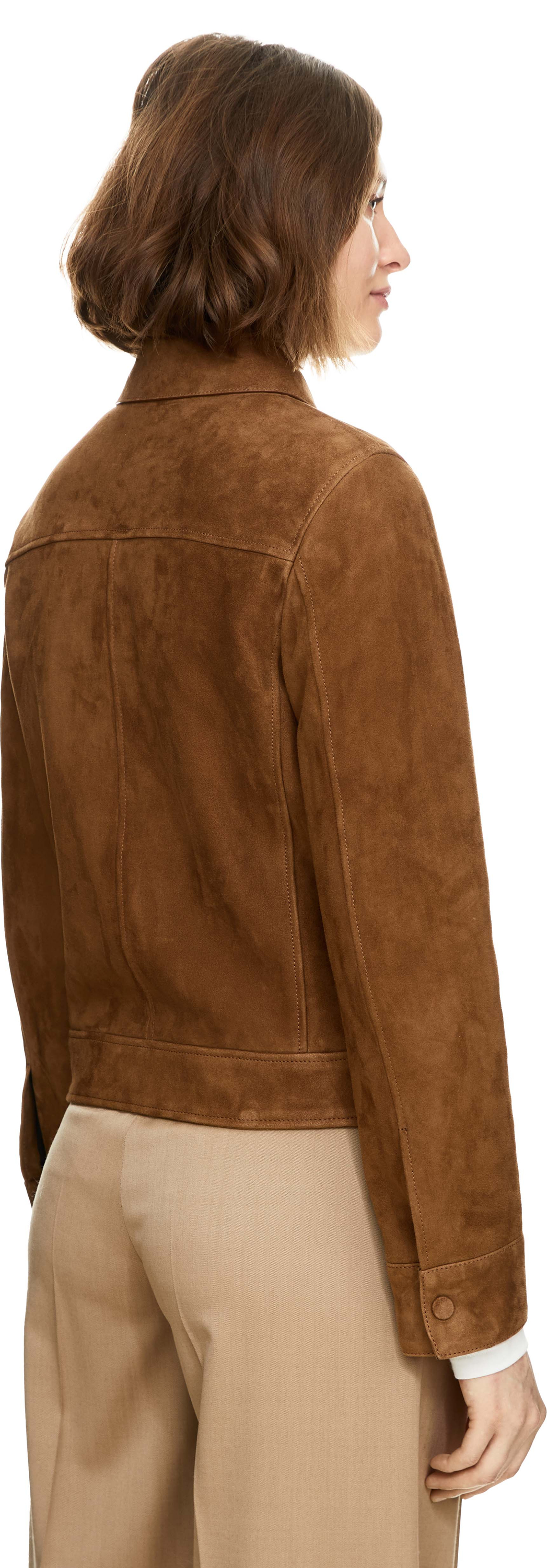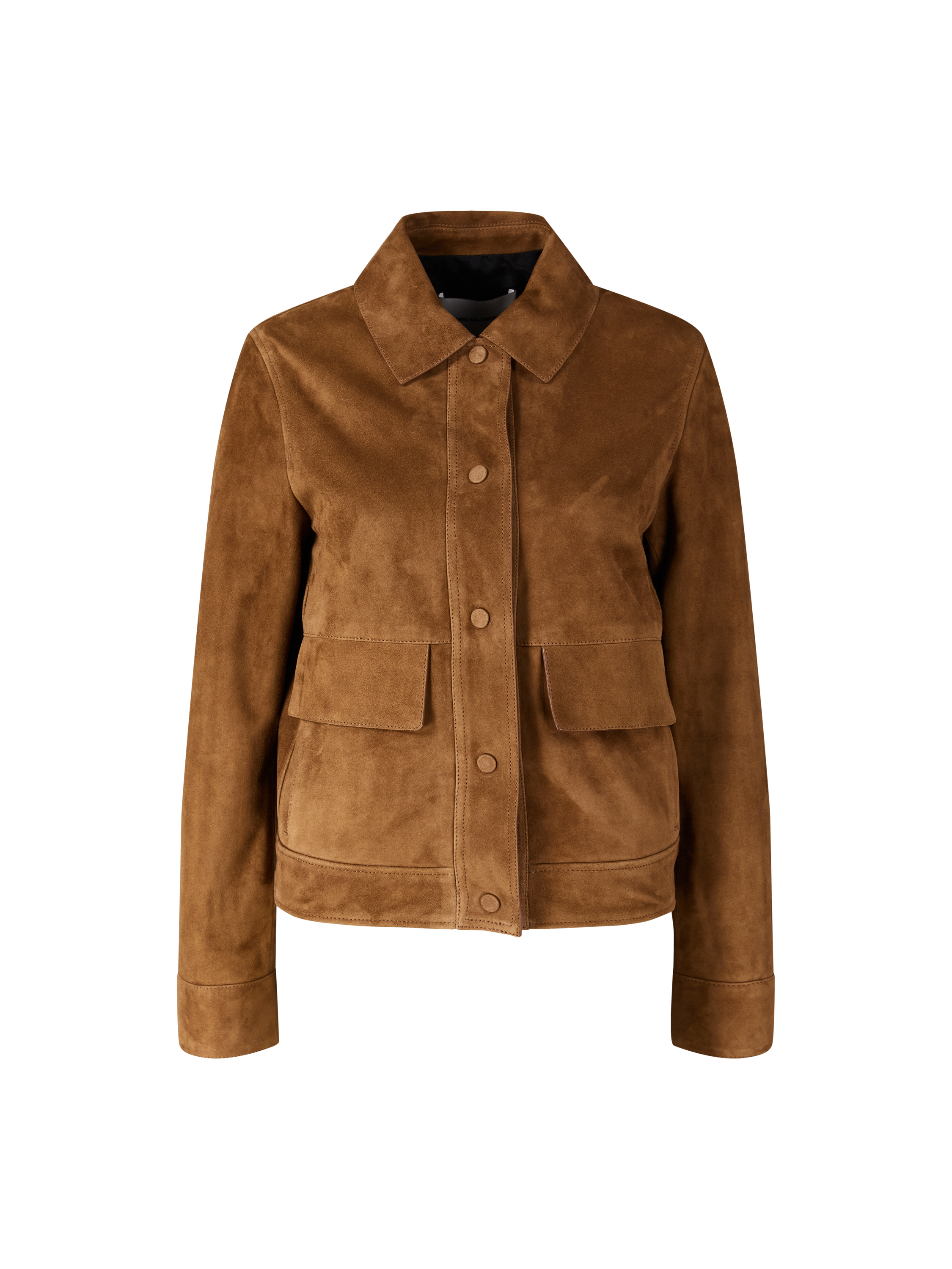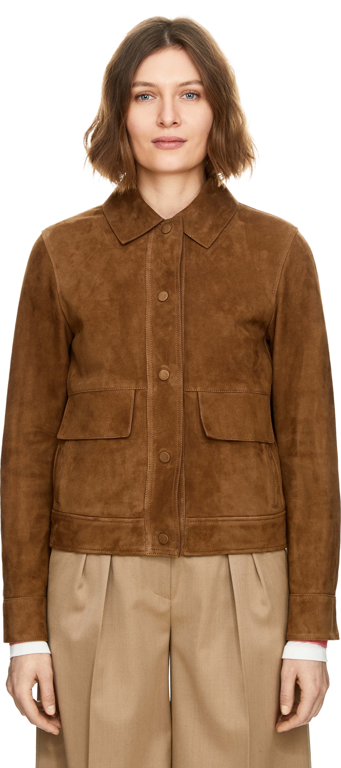 Diese Jacke in Camel von Yves Salomon wurde aus hochwertigem Lammveloursleder gefertigt und besticht durch das zeitlose elegante Design sowie die angenehm weiche Haptik. Der klassische Hemdkragen und die durchgehende Druckknopfleiste verleihen dem Modell eine dezente, moderne Eleganz. Zwei aufgesetzte Pattentaschen, seitliche Eingrifftaschen sowie der Druckknopf am Ärmelende setzen stilvolle Akzente und runden dieses exklusive Modell harmonisch ab.
