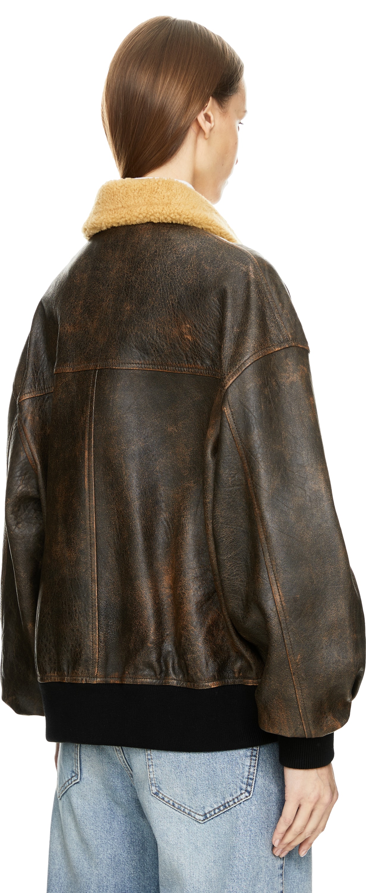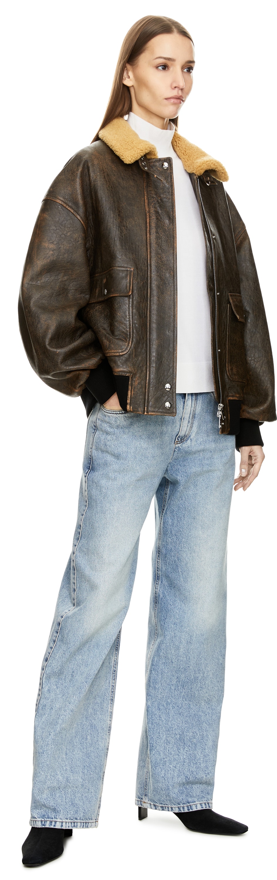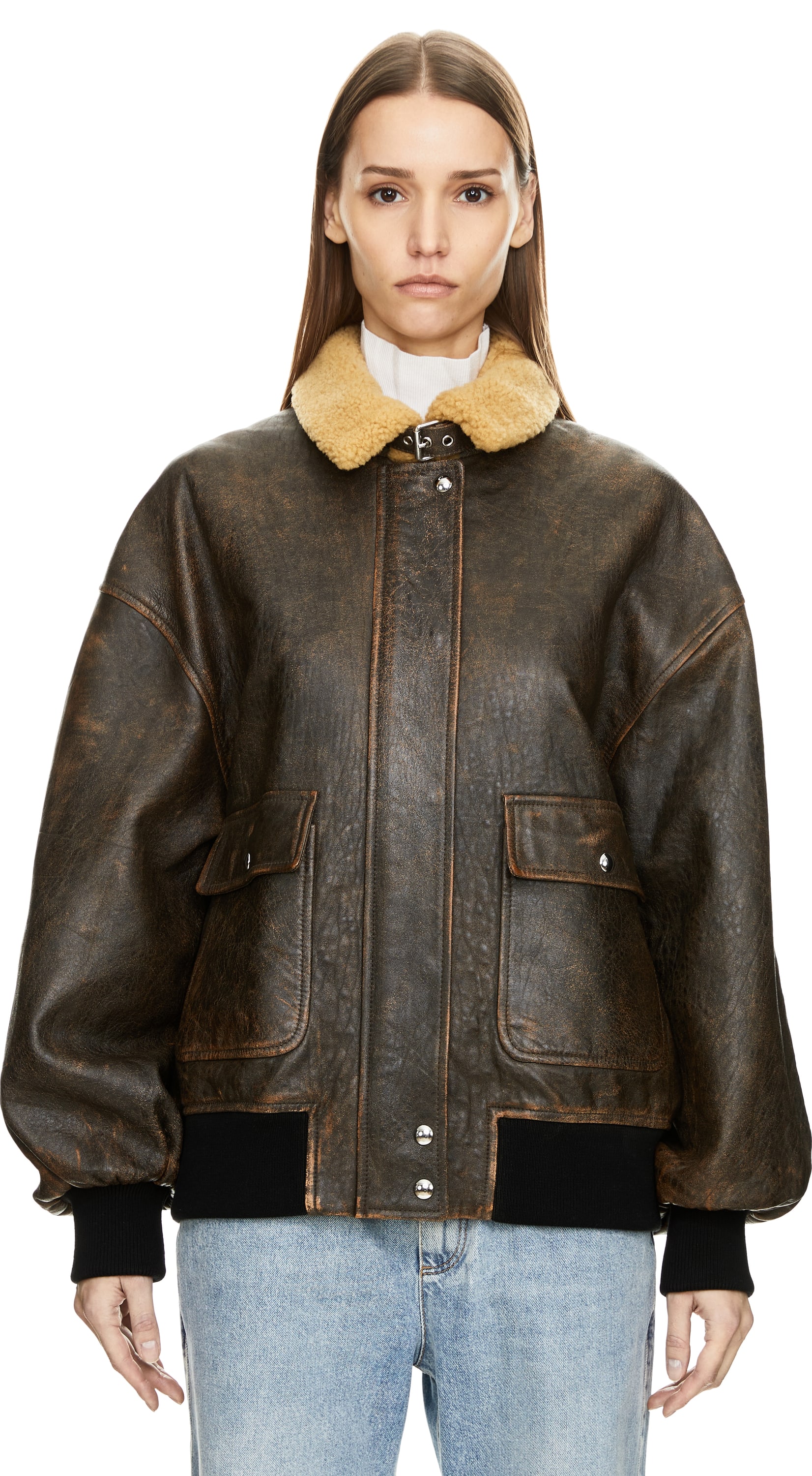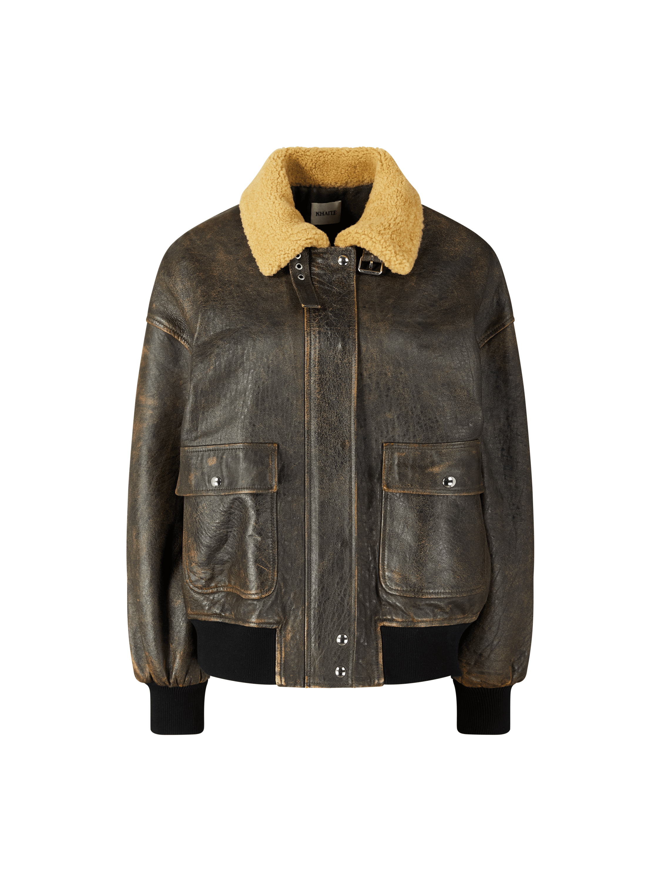 Die Lederjacke 'Sandor' in Dunkelbraun von Khaite wurde aus hochwertigem Lammleder gefertigt und besticht durch den Stehkragen mit weichem Shearling-Futter. Ein Kragenriegel mit Schnallenverschluss unterstreicht den markanten Look, während der Oversized Fit und die überschnittenen Schultern eine moderne Silhouette verleihen. Details wie die Druckknopfleiste mit Zwei-Wege-Reißverschluss sowie zwei große Pattentaschen runden das Design ab.