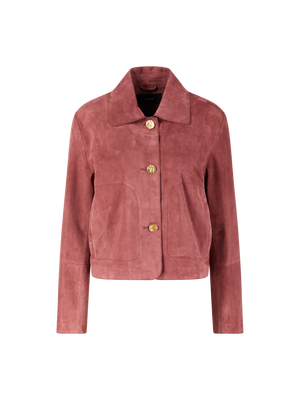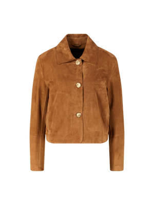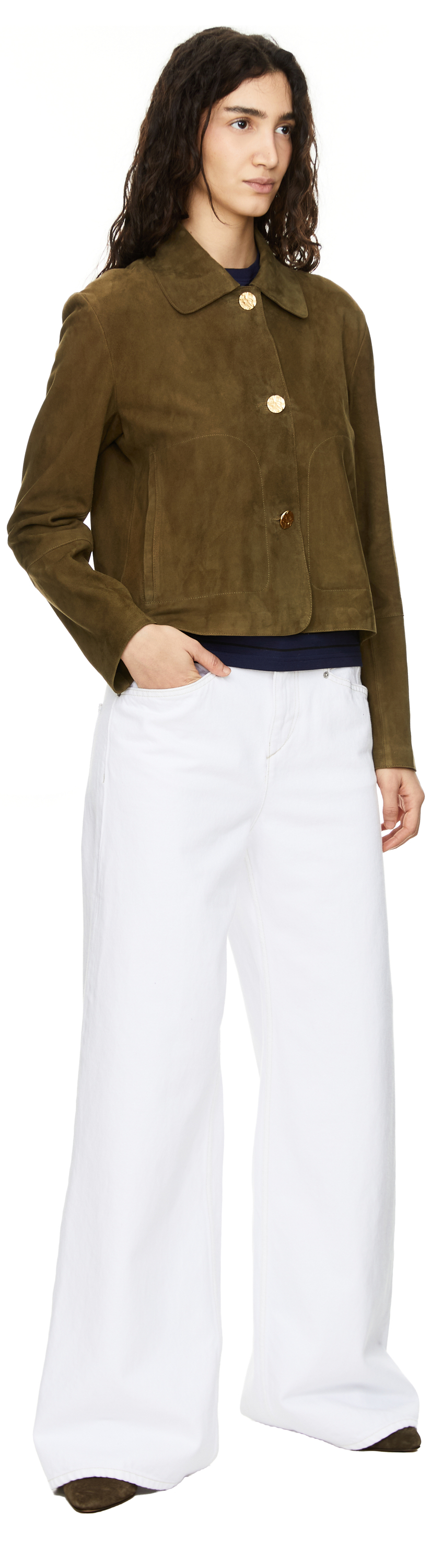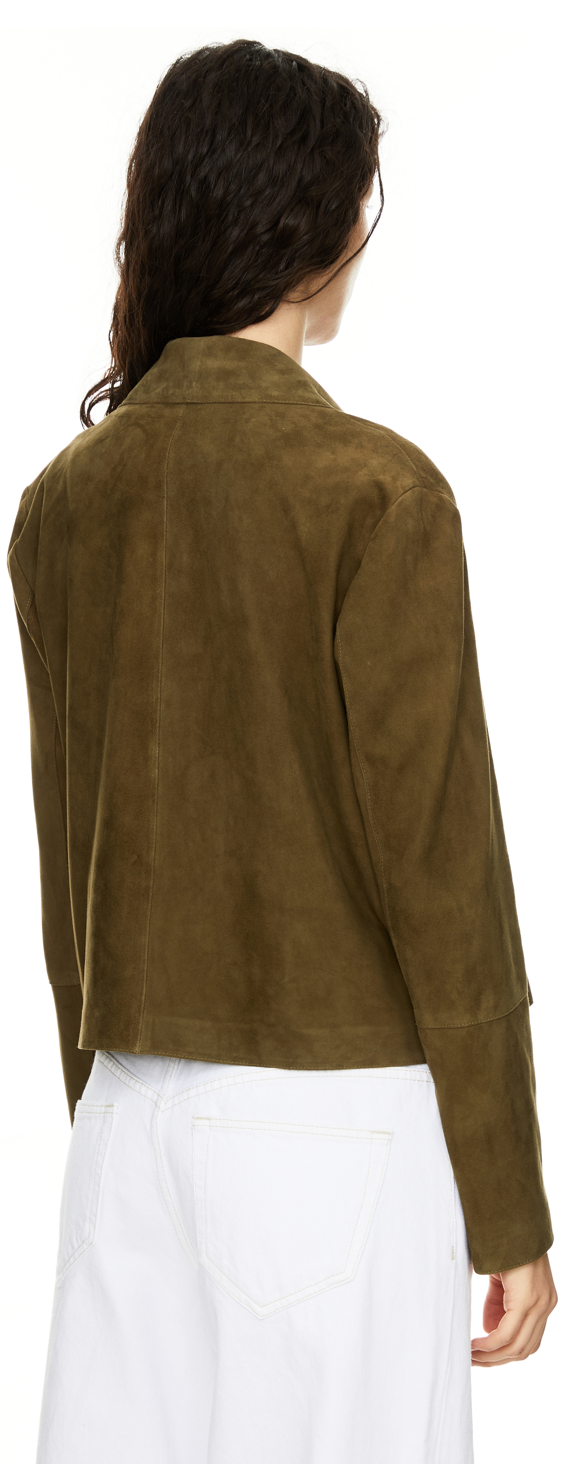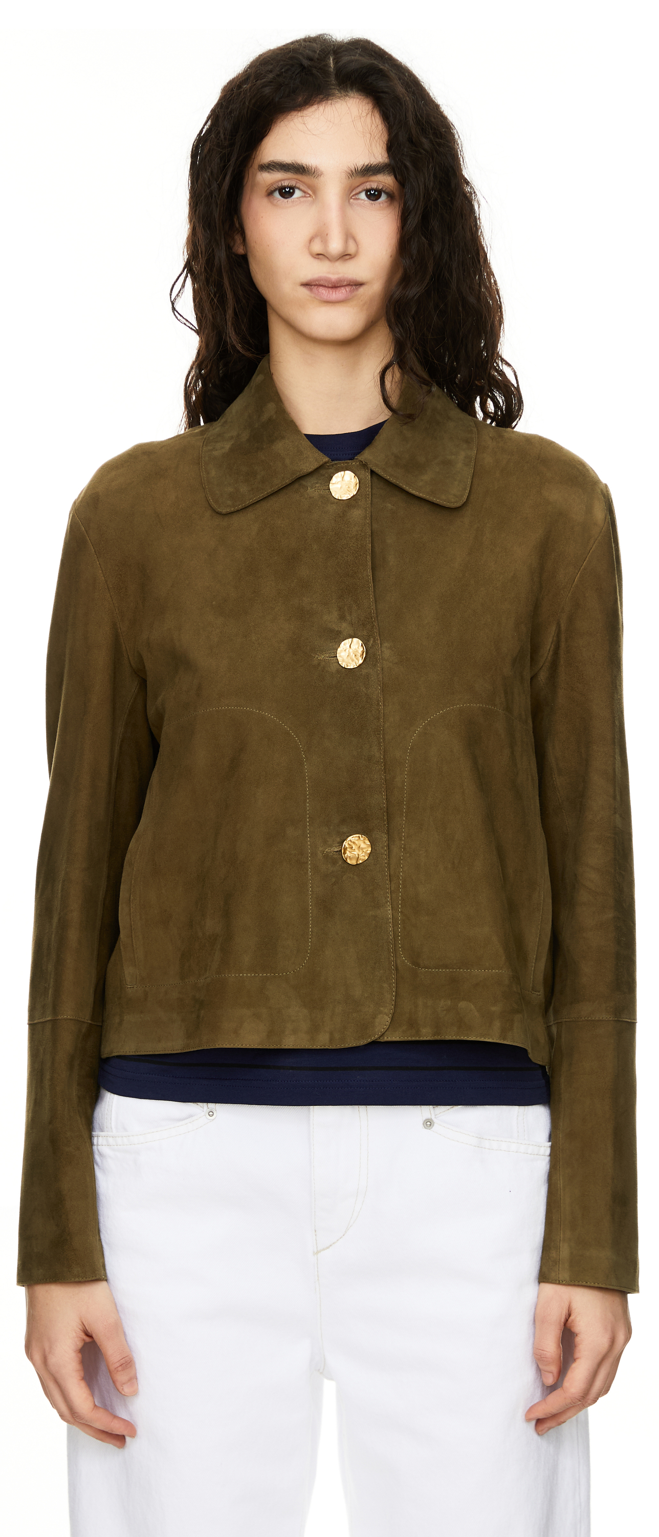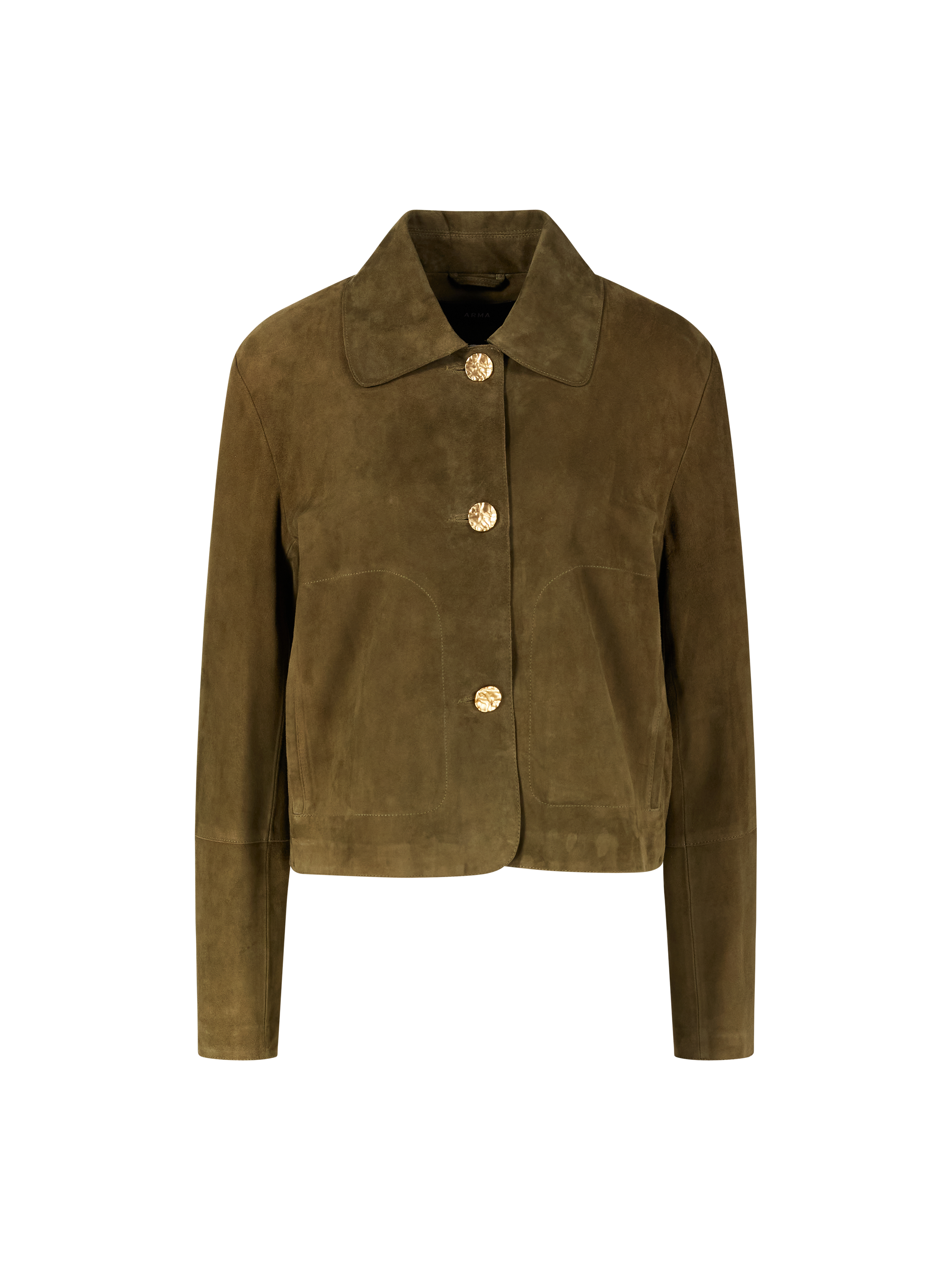 Die Jacke 'Emilla' in Olive von ARMA wurde aus Veloursleder gefertigt und besticht durch eine verkürzte Passform. Die gerade Silhouette setzt einen femininen Akzent, während die seitlichen Eingrifftaschen und die goldfarbene Knopfleiste das Design definieren.