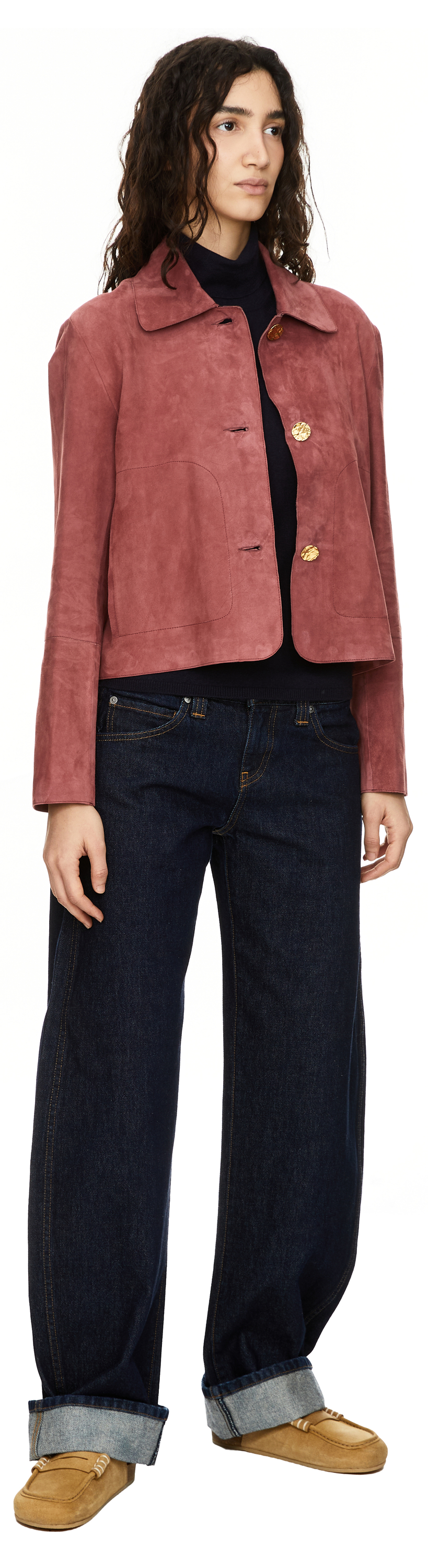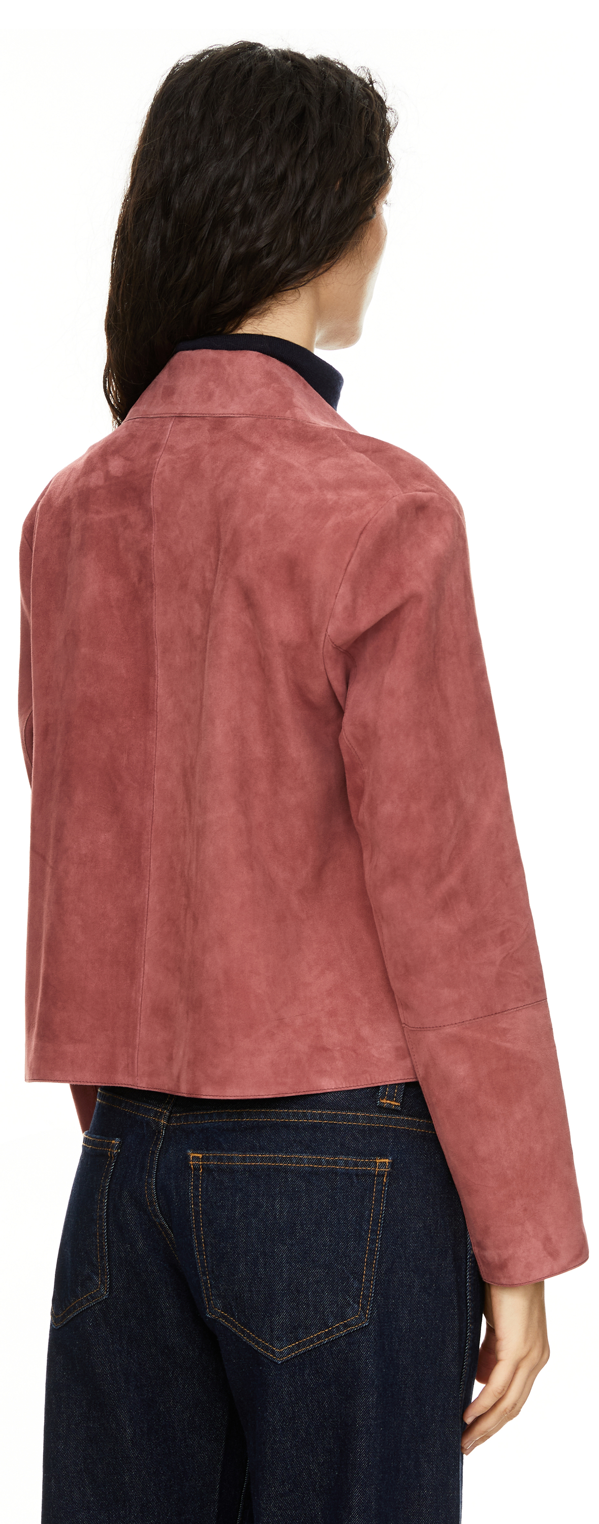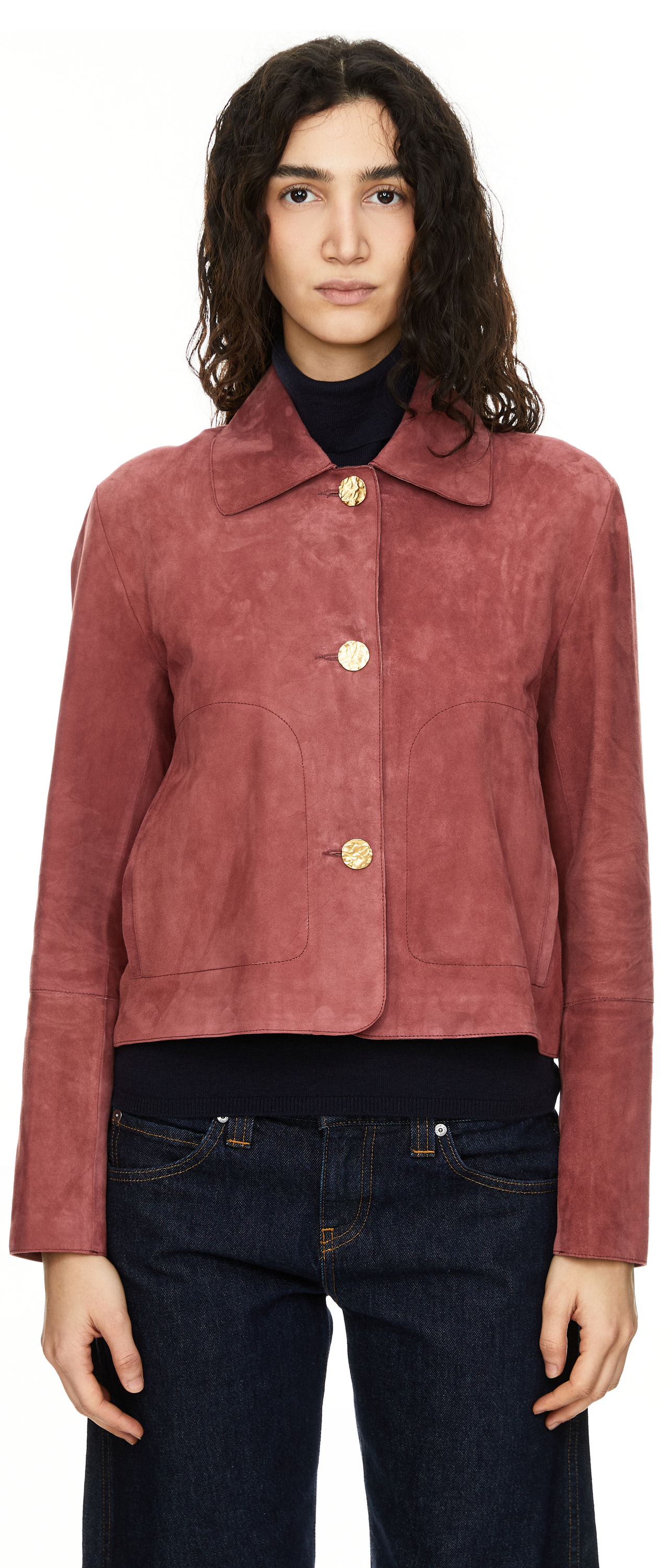 Die Jacke 'Emilla' in Pink von ARMA wurde aus Veloursleder gefertigt und besticht durch eine verkürzte Passform. Die gerade Silhouette setzt einen femininen Akzent, während die seitlichen Eingrifftaschen und die goldfarbene Knopfleiste das Design definieren.