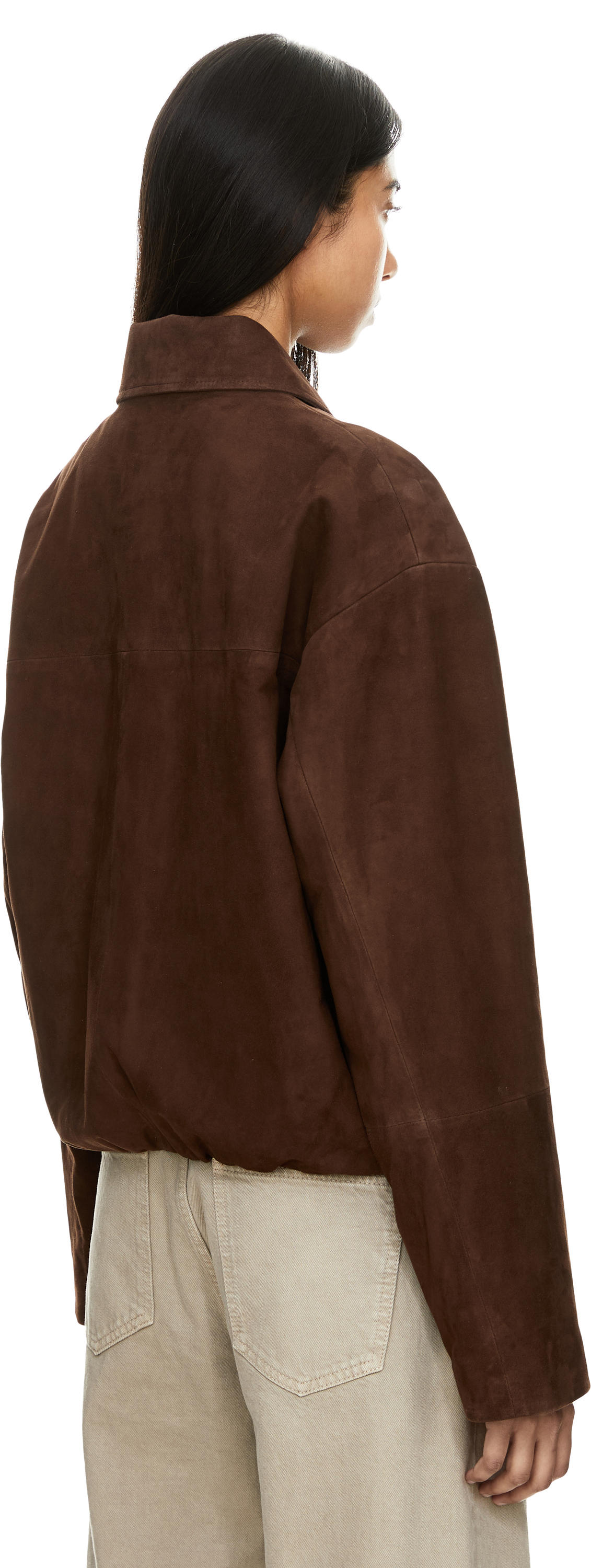 Die Jacke 'Loua' in Dunkelbraun von ARMA wurde aus hochwertigem Lammveloursleder gefertigt und besticht durch ihre lässige Passform. Der Hemdkragen mit goldfarbenem Reißverschluss und der elastische Saum verleihen dem Modell eine moderne Note, während die angenehme Haptik den Tragekomfort unterstreicht.